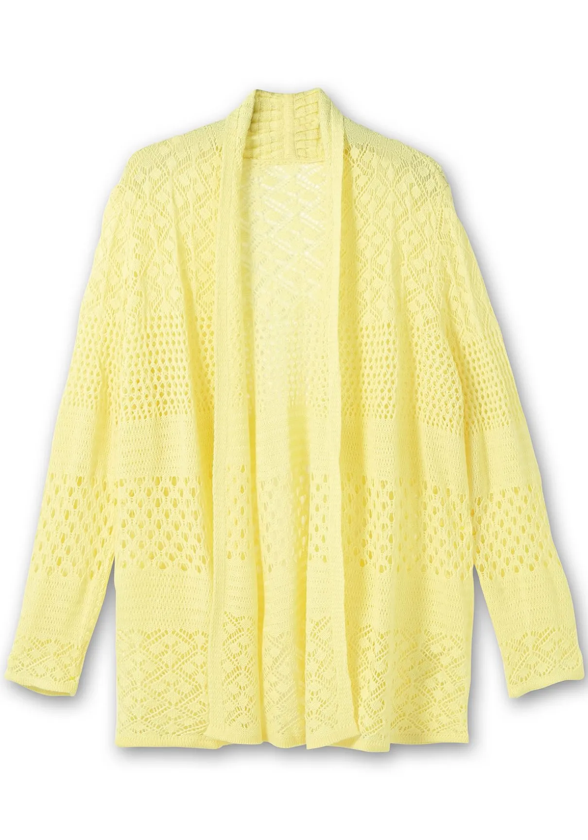 Strickjacke im Ajourmuster. Der Mix aus verschiedenen Strickmustern verleiht der Jacke ihre luftige, sommerliche Optik. Durch die verschlusslose Form lässt sie sich schnell überziehen und zu vielen Looks kombinieren.