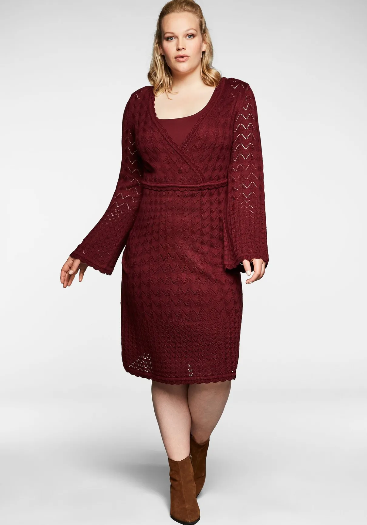 Strickkleid mit Unterkleid. Das zarte Ajourstrickmuster verleiht ihm seine verspielte Optik, auch der in Wickeloptik gestaltete Ausschnitt unterstreicht den femininen Auftritt. Passendes Finish sind die Bogenkanten an allen Abschlüssen, eine Teilungsnaht in der Taille gibt der Silhouette Form.