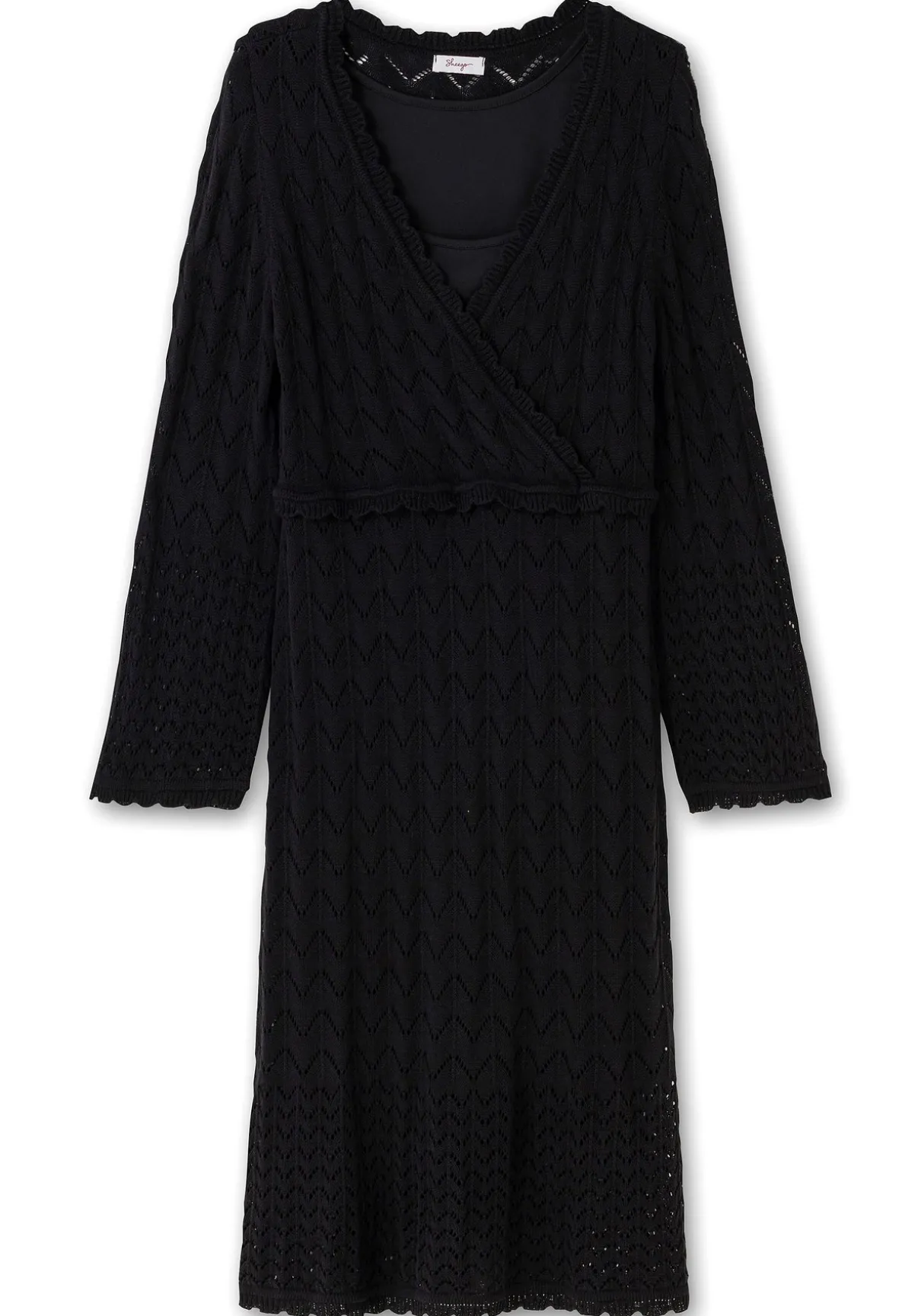 Der Ajourstrick mit Viskoseanteil gibt dem Kleid eine zarte Transparenz, das dazugehörige Unterkleid besteht aus pflegeleichter Jerseyware und macht den Look am Body blickdicht.