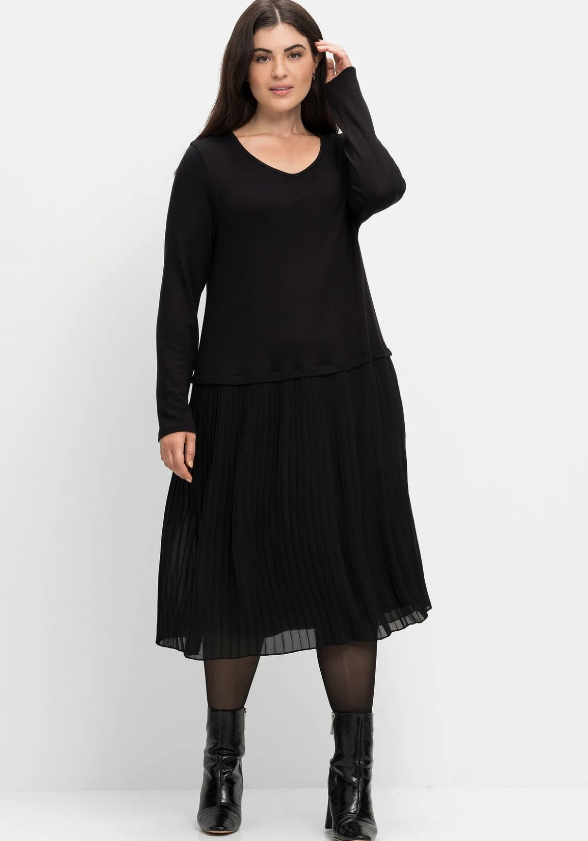 Strickkleid im Materialmix. Der interessante Mix aus weichem Strickoberteil und plissiertem Chiffonrock gibt dem Look Raffinesse. Ein etwas weiterer Rundhals unterstreicht den femininen Style, der gut auch zu festlichen Anlässen passt.