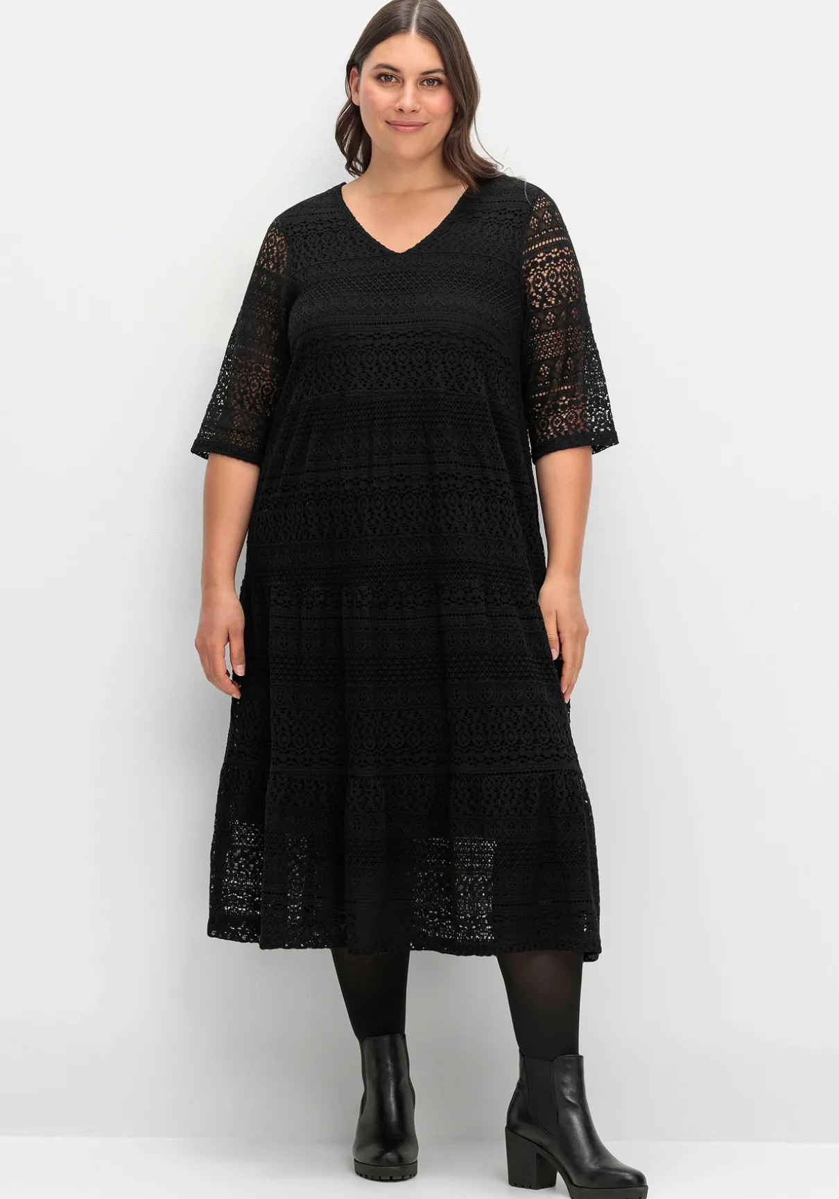 Spitzenkleid mit Stufenrock. Die romantische Spitze lässt am 3/4-Ärmel dezent die Haut durchschimmern, ein Futter in kniebedeckender Länge macht das Kleid am Body blickdicht. Der gestufte Rock gibt Schwung und unterstreicht so die verspielte Boho-Optik. Ein streckender V-Ausschnitt ergänzt den femininen Fit.