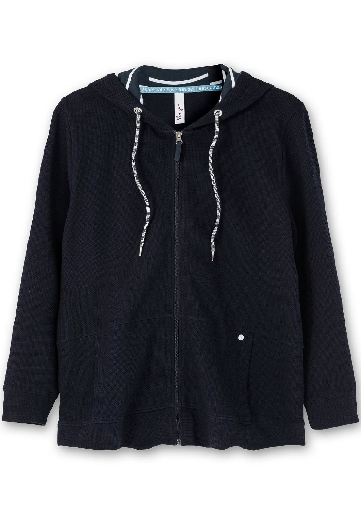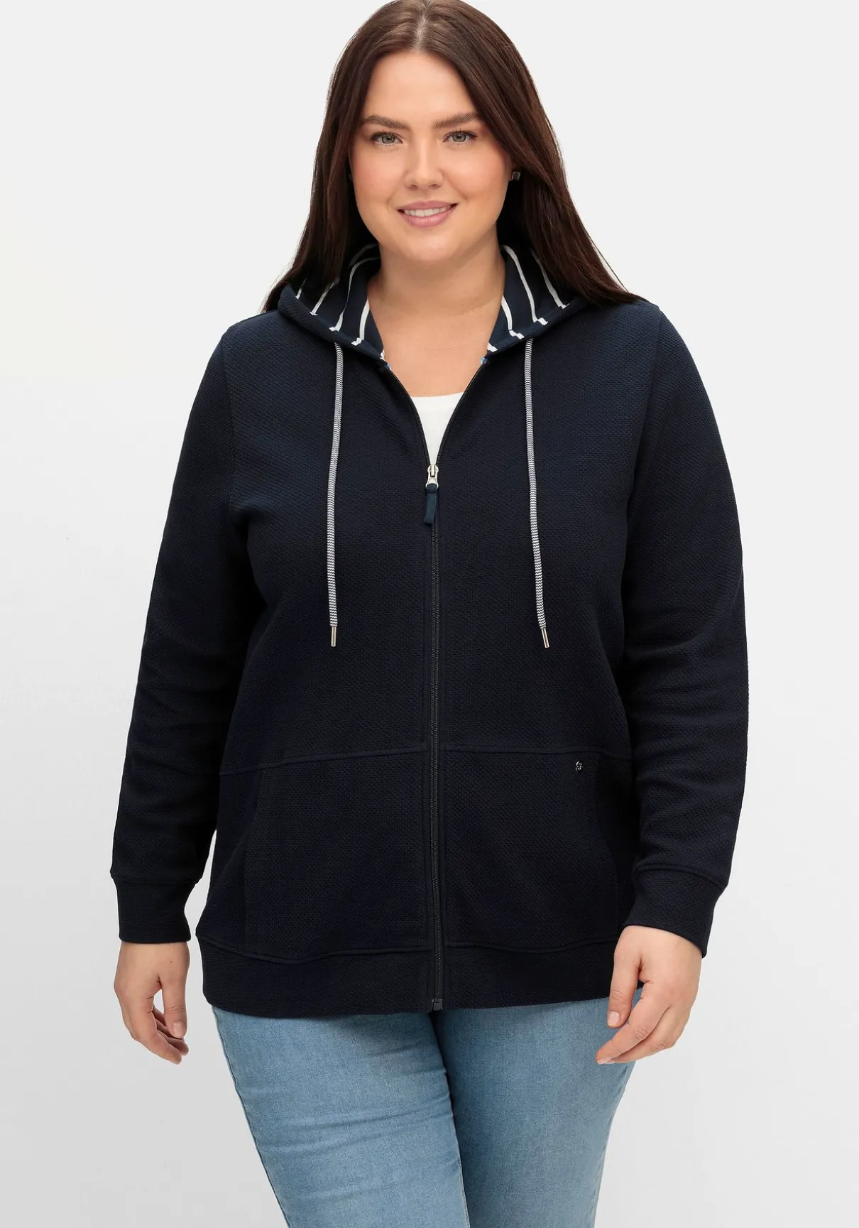 Sweatjacke in Waffelpiqué-Struktur. Die Kapuze ist mit einem kontrastfarbenen Bindebändchen gearbeitet, das gestreifte Innenfutter sorgt für maritimes Flair. Praktisch sind die großen Eingrifftaschen, glatte Bündchen an Ärmelabschluss und Saum dienen als legeres Finish.