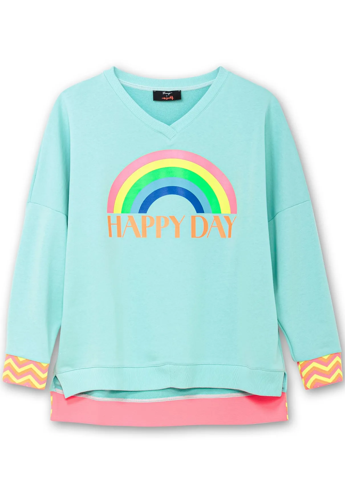Sweatshirt mit modischen Highlights von sheego loves miss goodlife. Der fröhliche Statement-Frontdruck verleiht dem Sweater einen unverwechselbaren Charme. Der V-Ausschnitt sorgt zusammen mit den überschnittenen Ärmeln für eine lässige Silhouette. Auffällig sind die Zickzack-Streifenbündchen, die den Look modern abrunden.