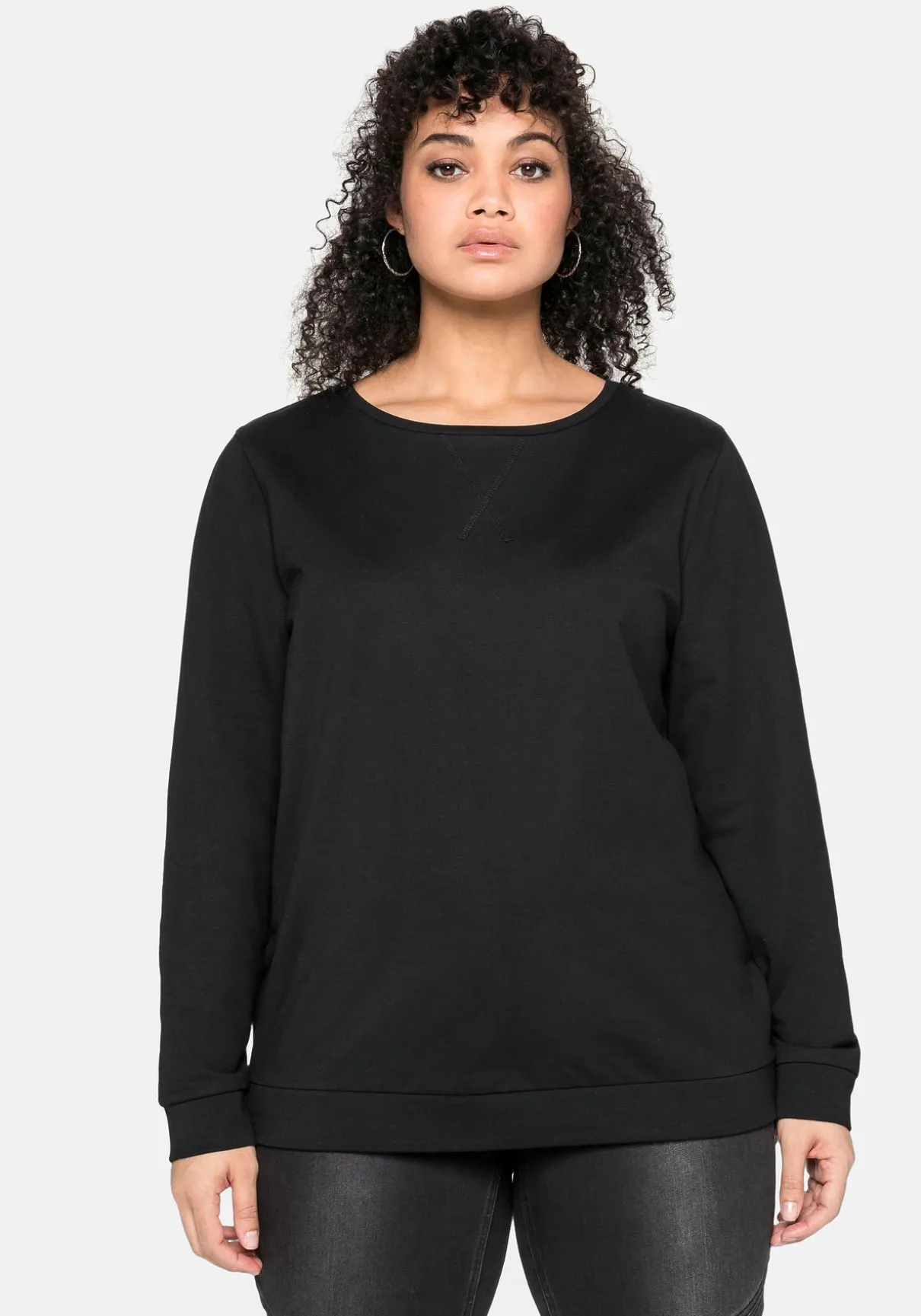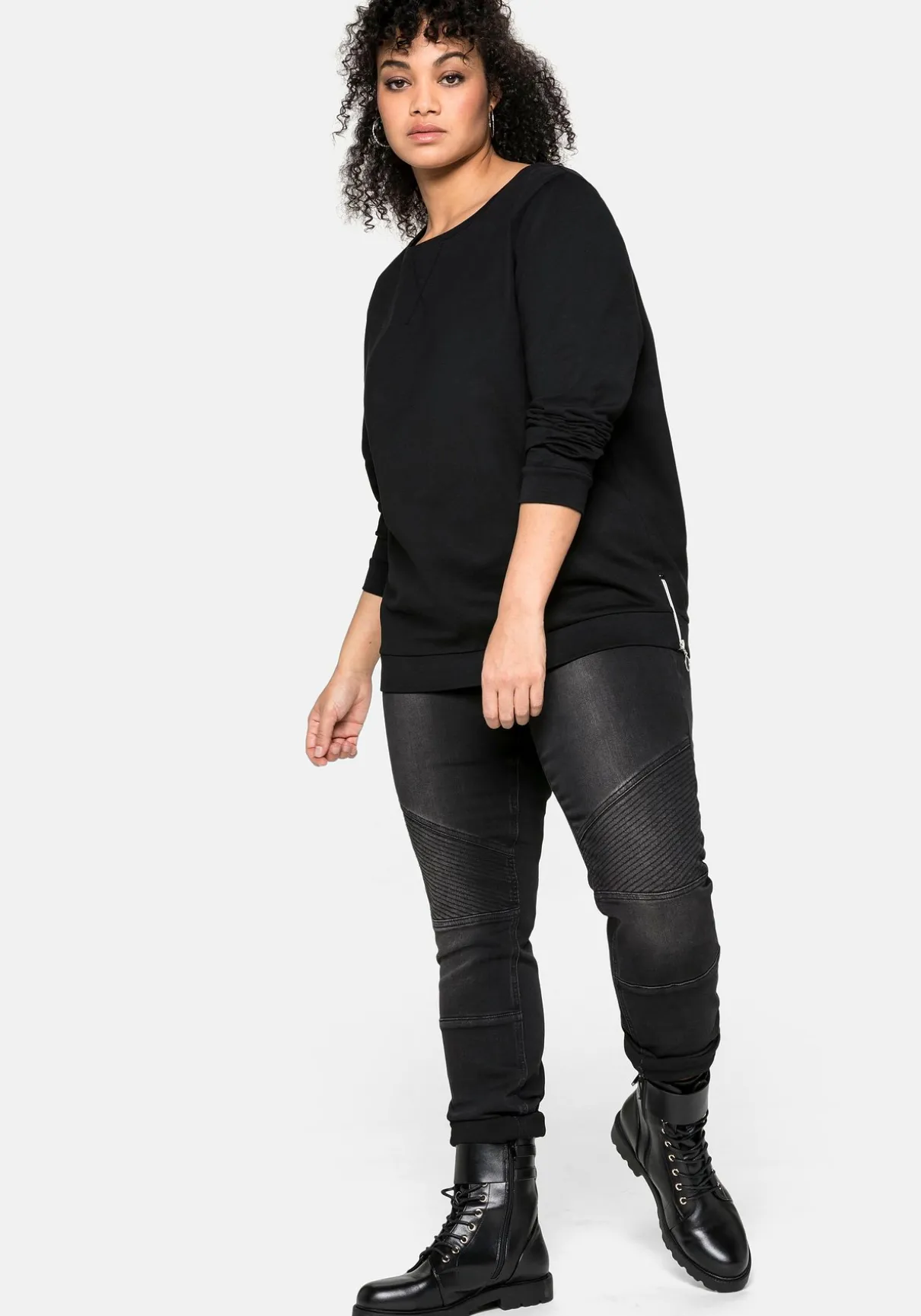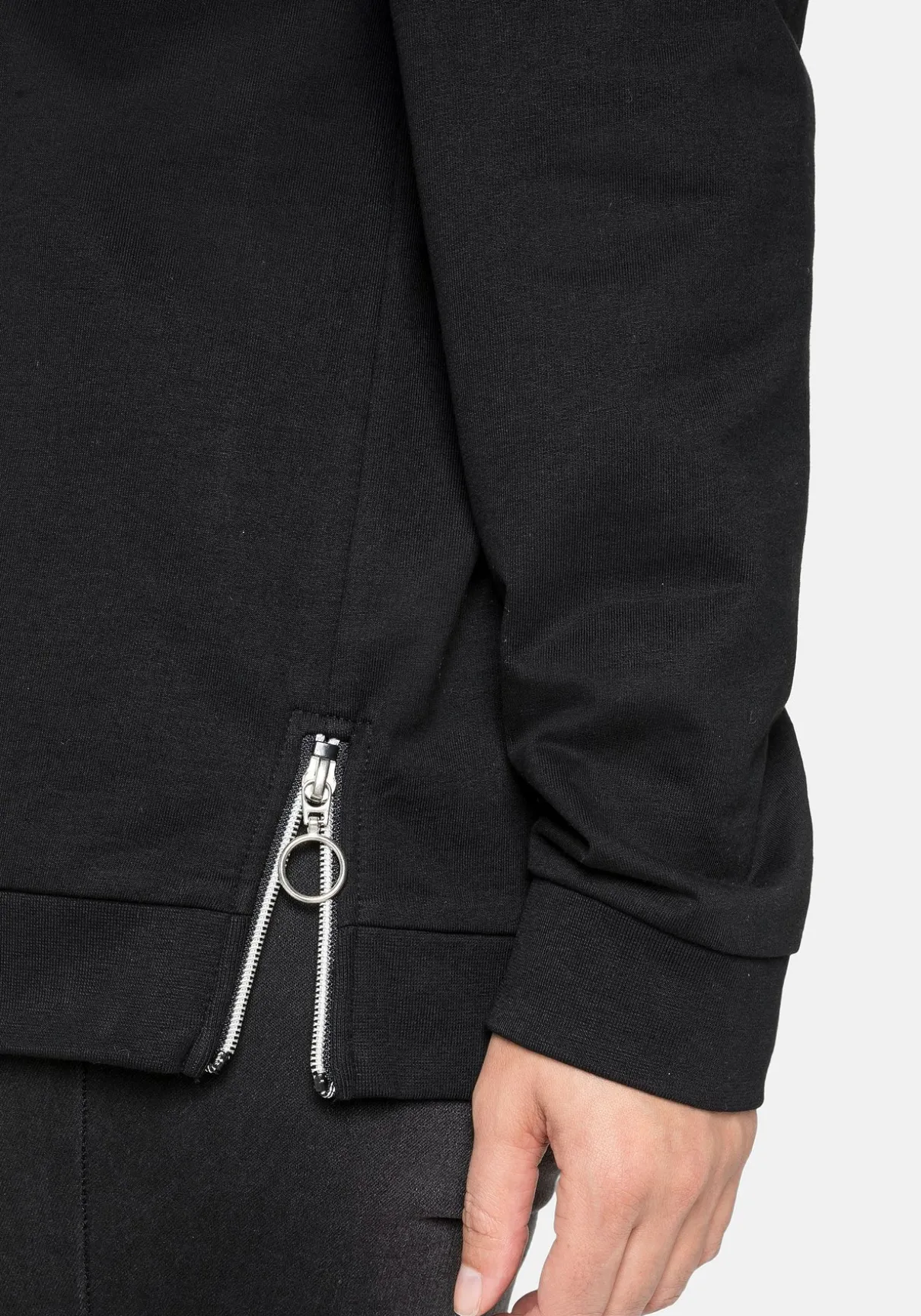 Die Passform umspielt locker die Figur. Die seitlich zu öffnenden Zipper geben dem Sweatshirt zusätzliche Weite.