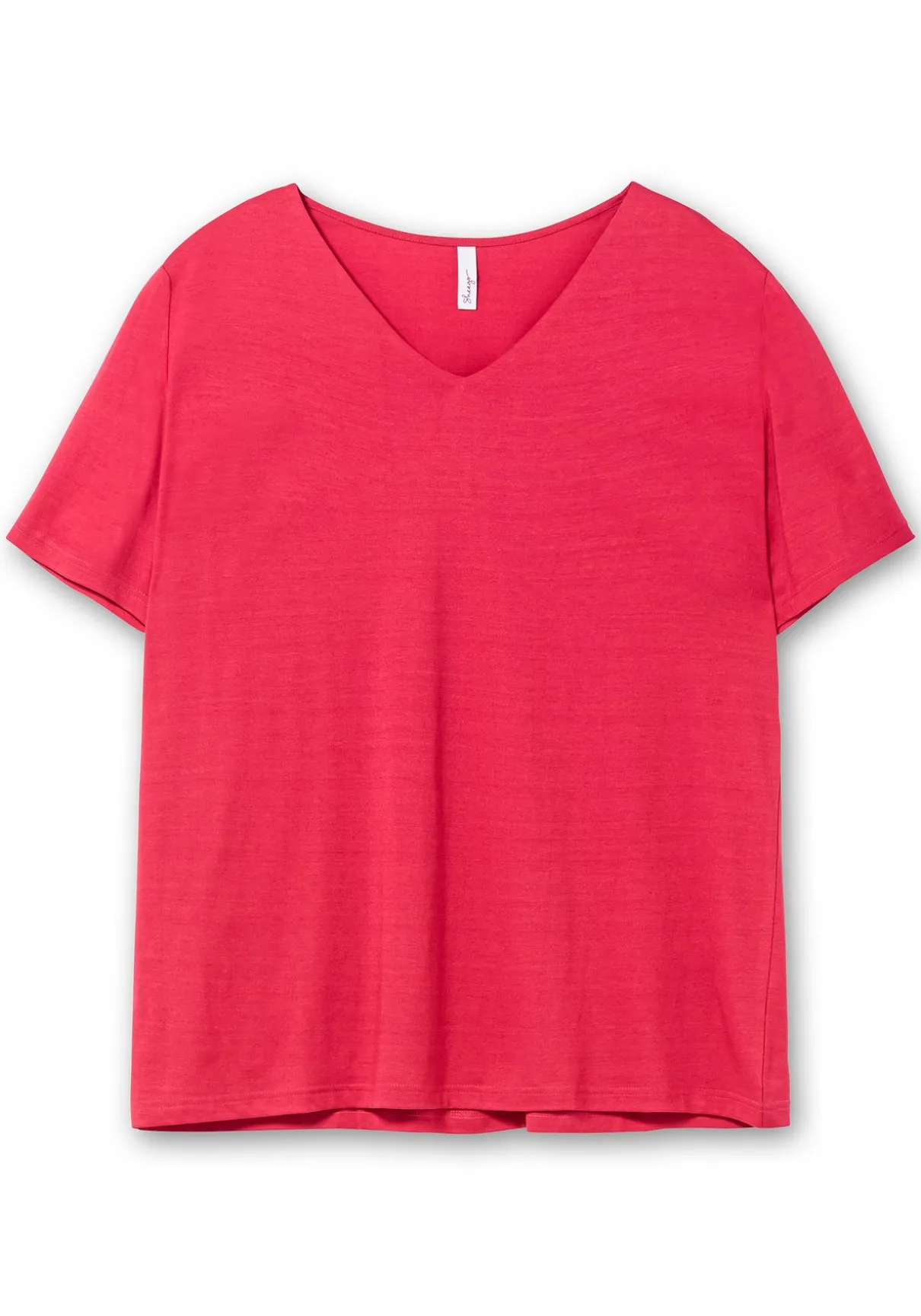 Das Shirt ist gerade und figurumspielend geschnitten, der V-Ausschnitt wirkt optisch streckend.