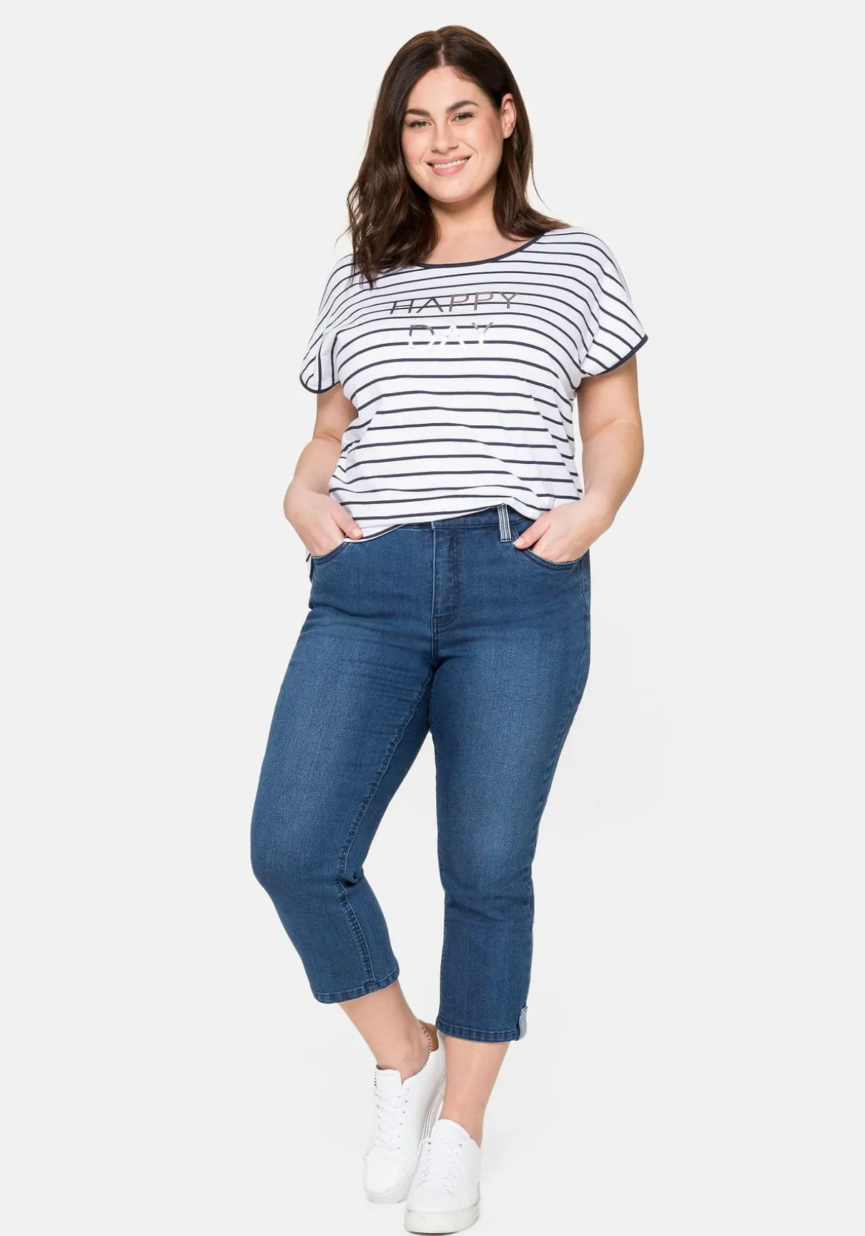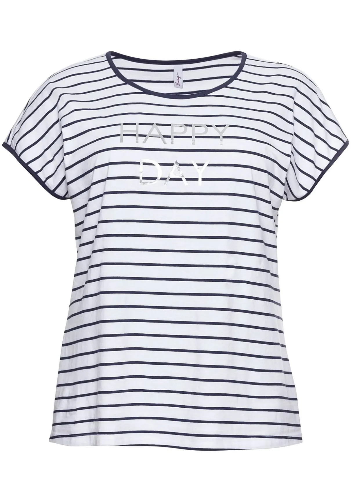 T-Shirt mit garngefärbten Ringeln. Der fröhliche Foliendruck gibt dazu ein unübersehbares Statement.