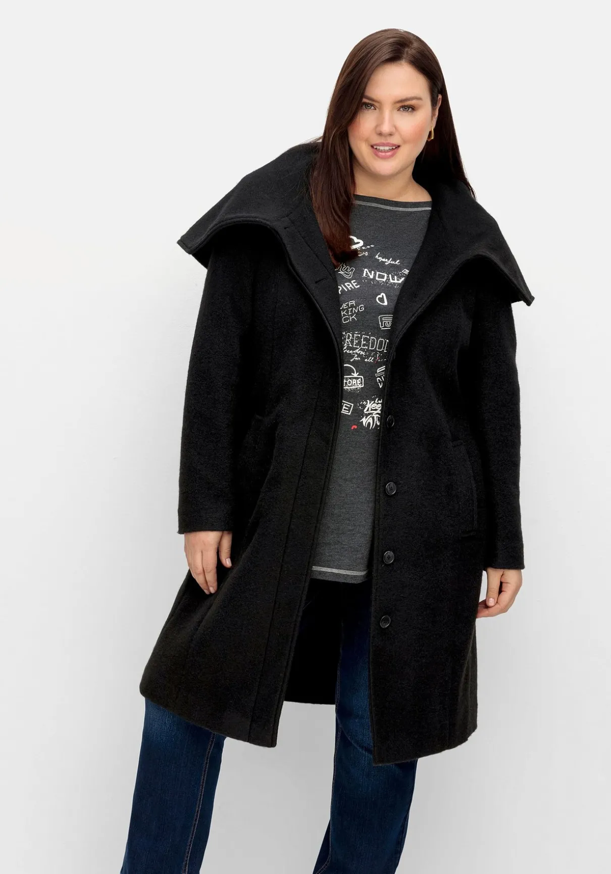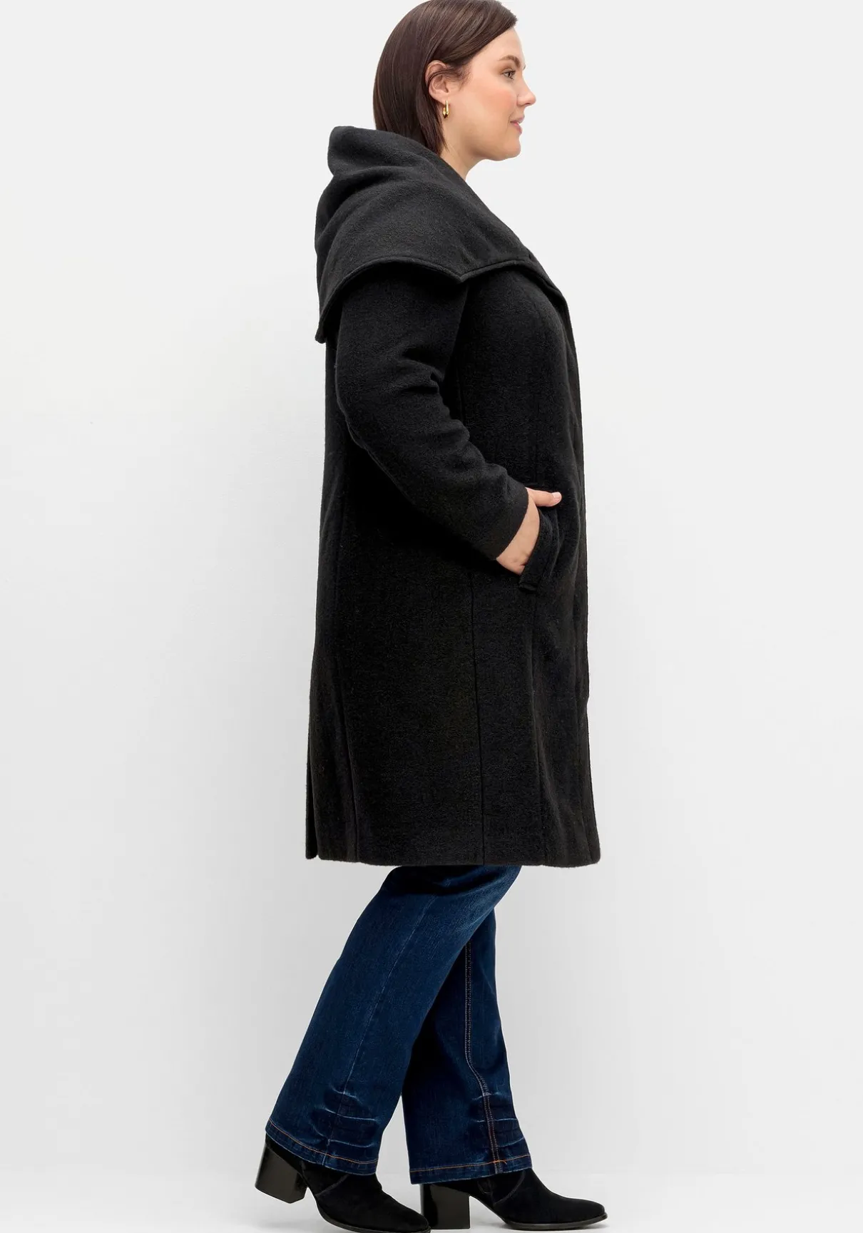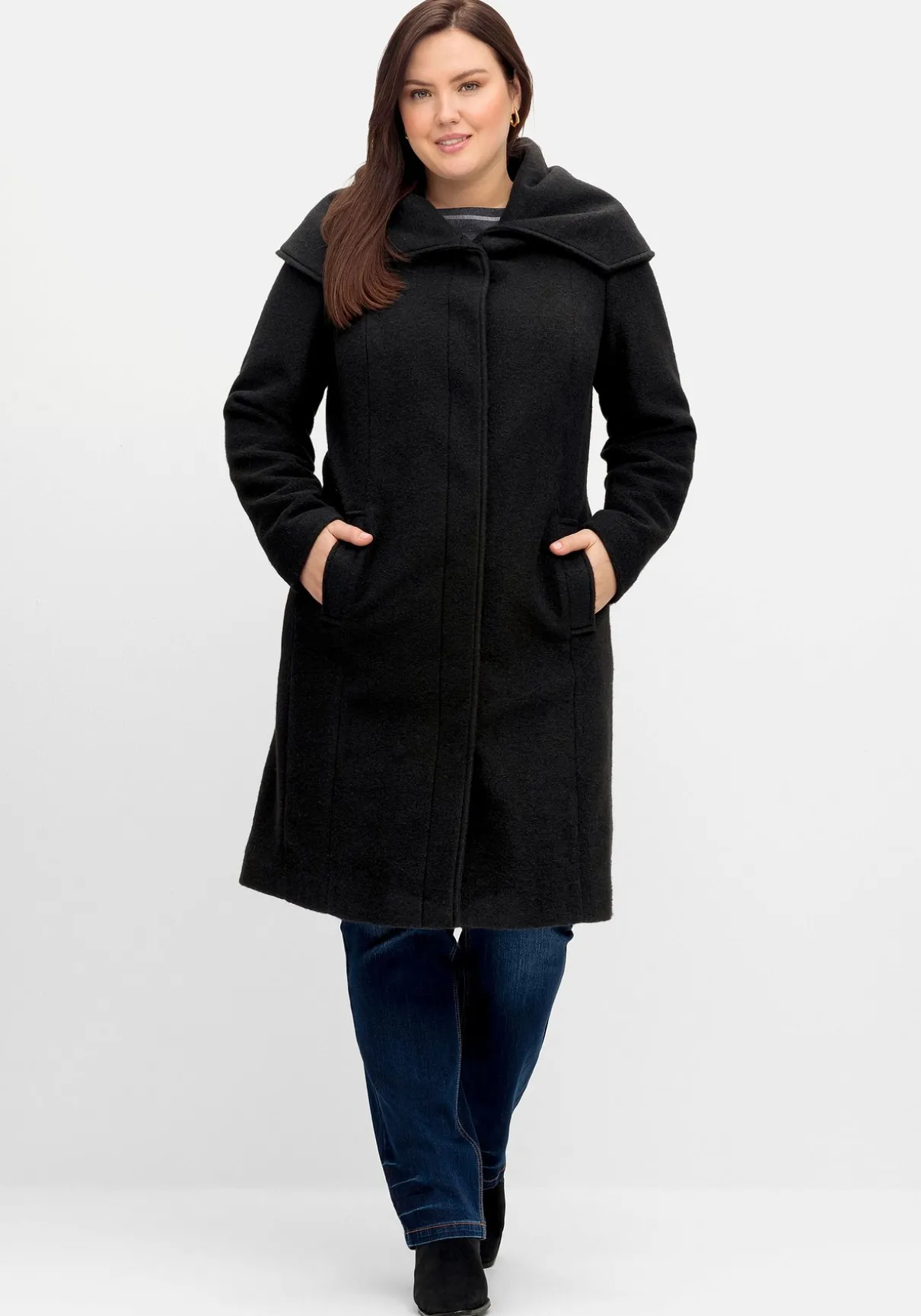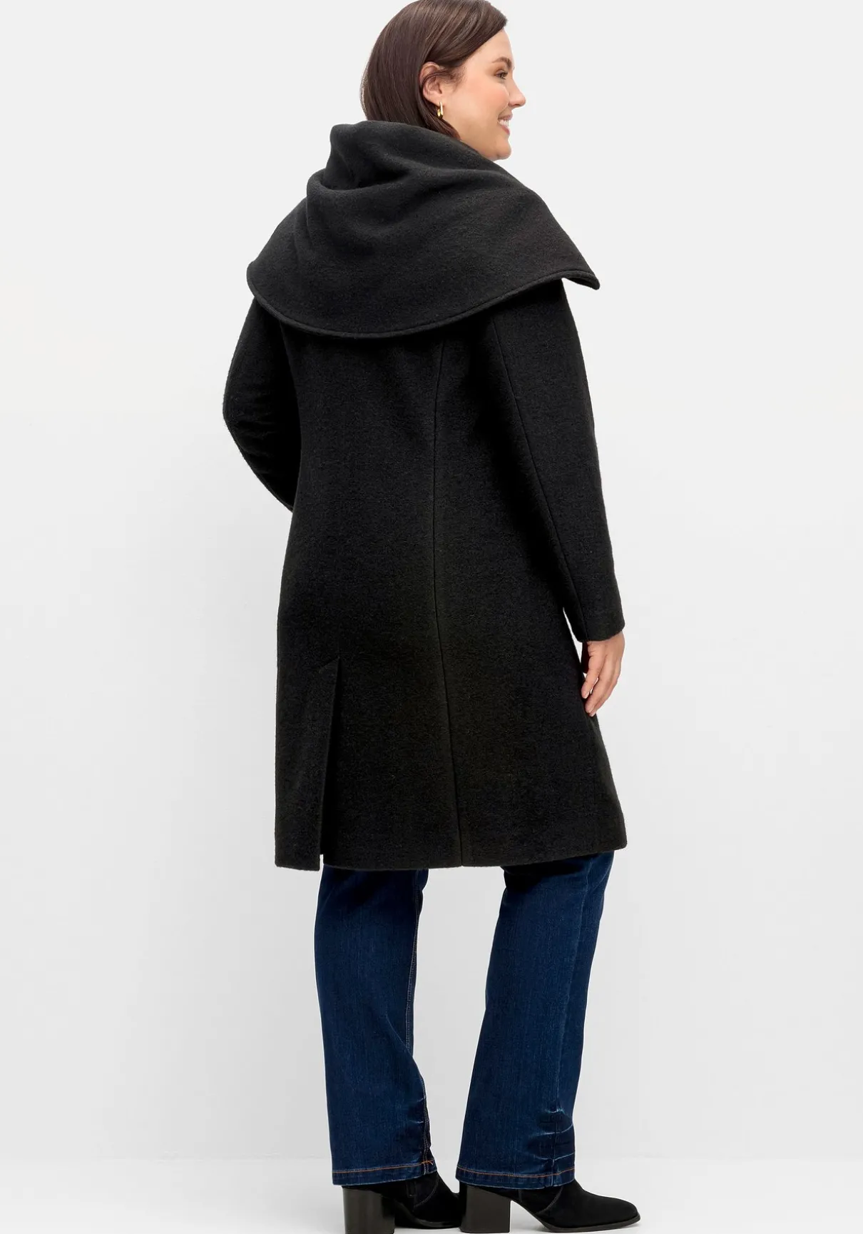 Mantel in knieumspielender Länge. Blickfang ist der weite Kragen, der dem Mantel eine elegante Optik verleiht. Dazu kommen eine verdeckte Knopfleiste, Teilungsnähte sowie die beiden Leistentaschen runden den Look stilgerecht ab.