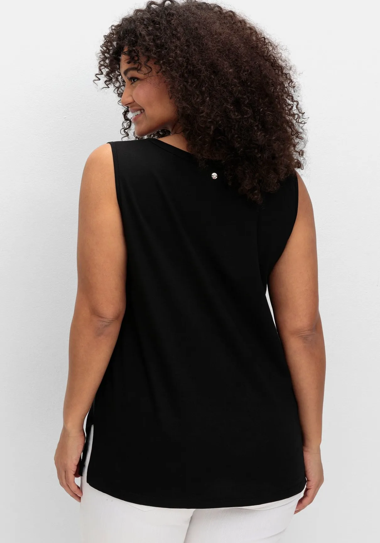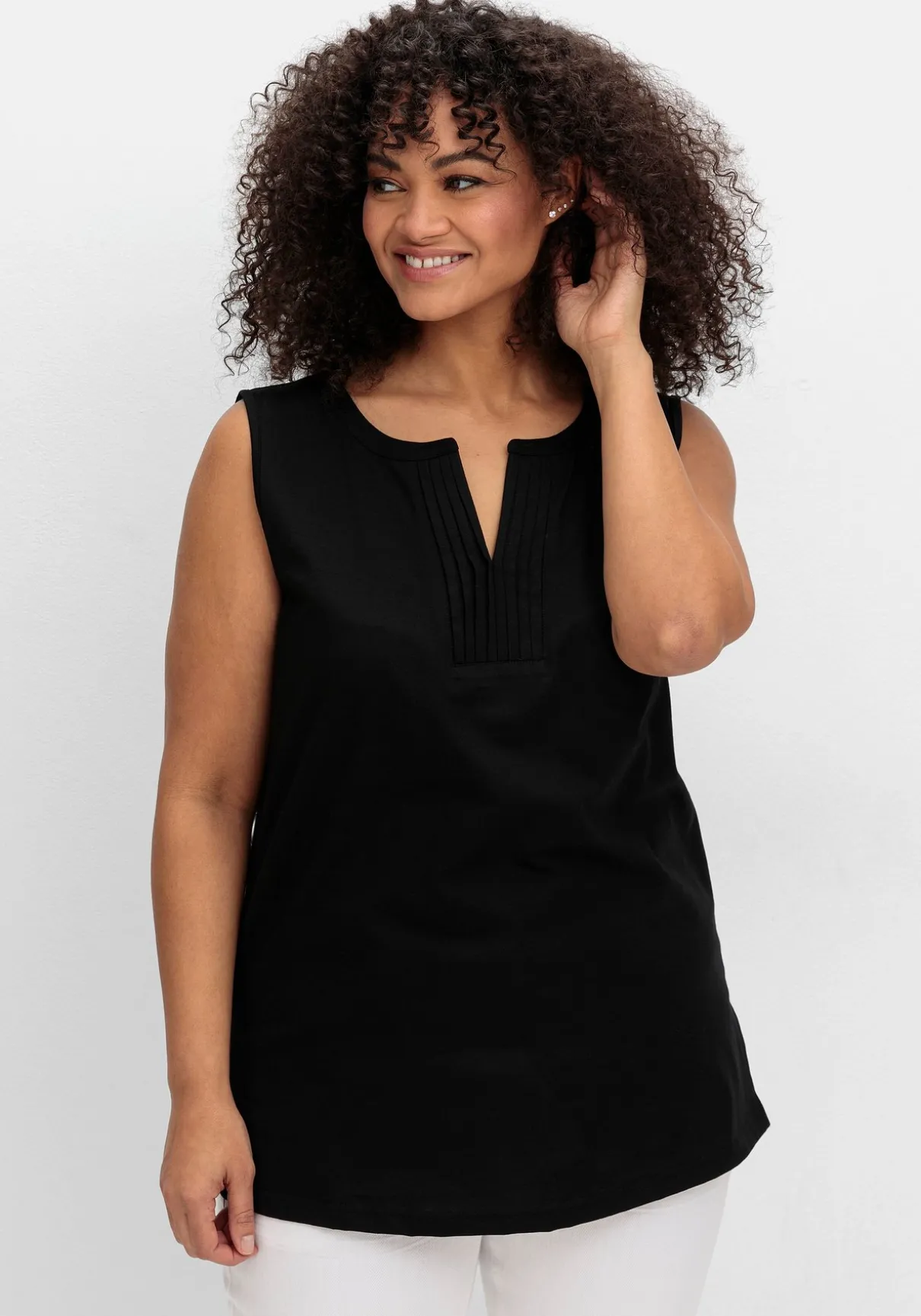 Tanktop aus Jersey. Der Rundhalsausschnitt ist mit einem V-Schlitz gearbeitet, dekorative Biesen verleihen dem Top eine feminine Note. Ansonsten zeigt es sich ganz unkompliziert mit breiten Trägern, geschlossenem Rücken und bequemen Seitenschlitzen.