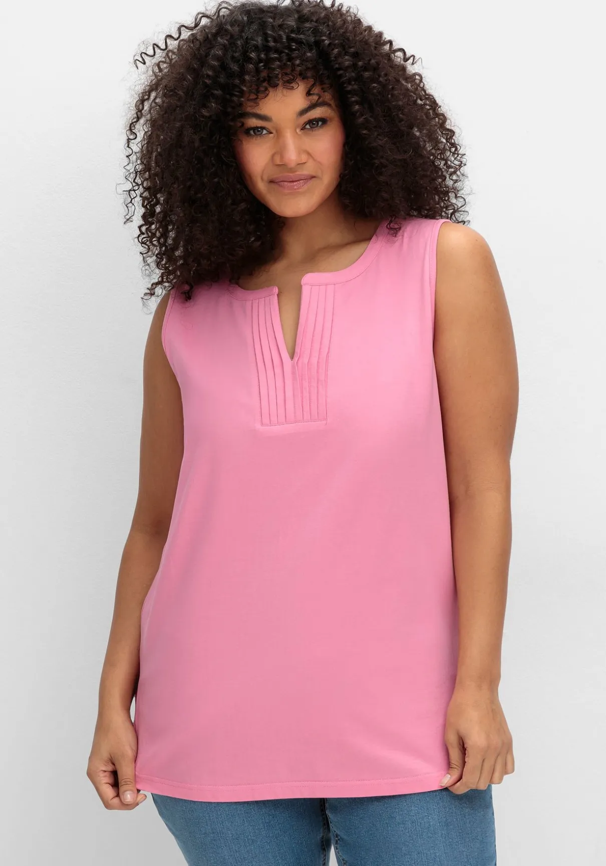 Tanktop aus Jersey. Der Rundhalsausschnitt ist mit einem V-Schlitz gearbeitet, dekorative Biesen verleihen dem Top eine feminine Note. Ansonsten zeigt es sich ganz unkompliziert mit breiten Trägern, geschlossenem Rücken und bequemen Seitenschlitzen.