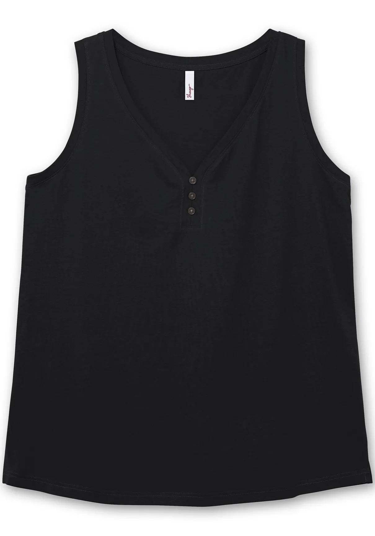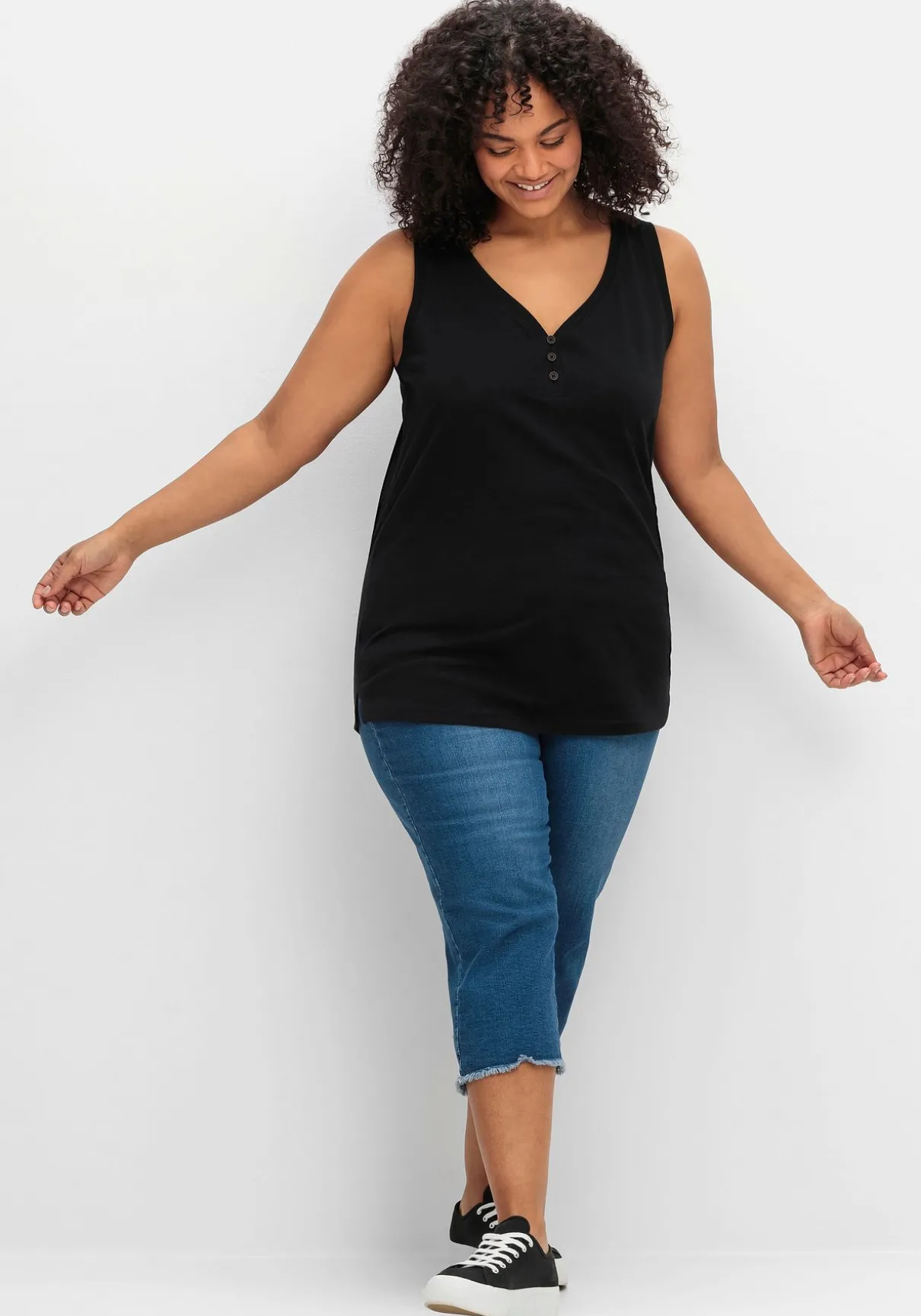 Jerseytop mit breiten Trägern. Das sommerliche Oberteil zeigt sich mit tieferem V-Ausschnitt und dekorativer Zierknopfleiste. Kurze seitliche Schlitze lassen das Top locker über die Hüfte fallen.