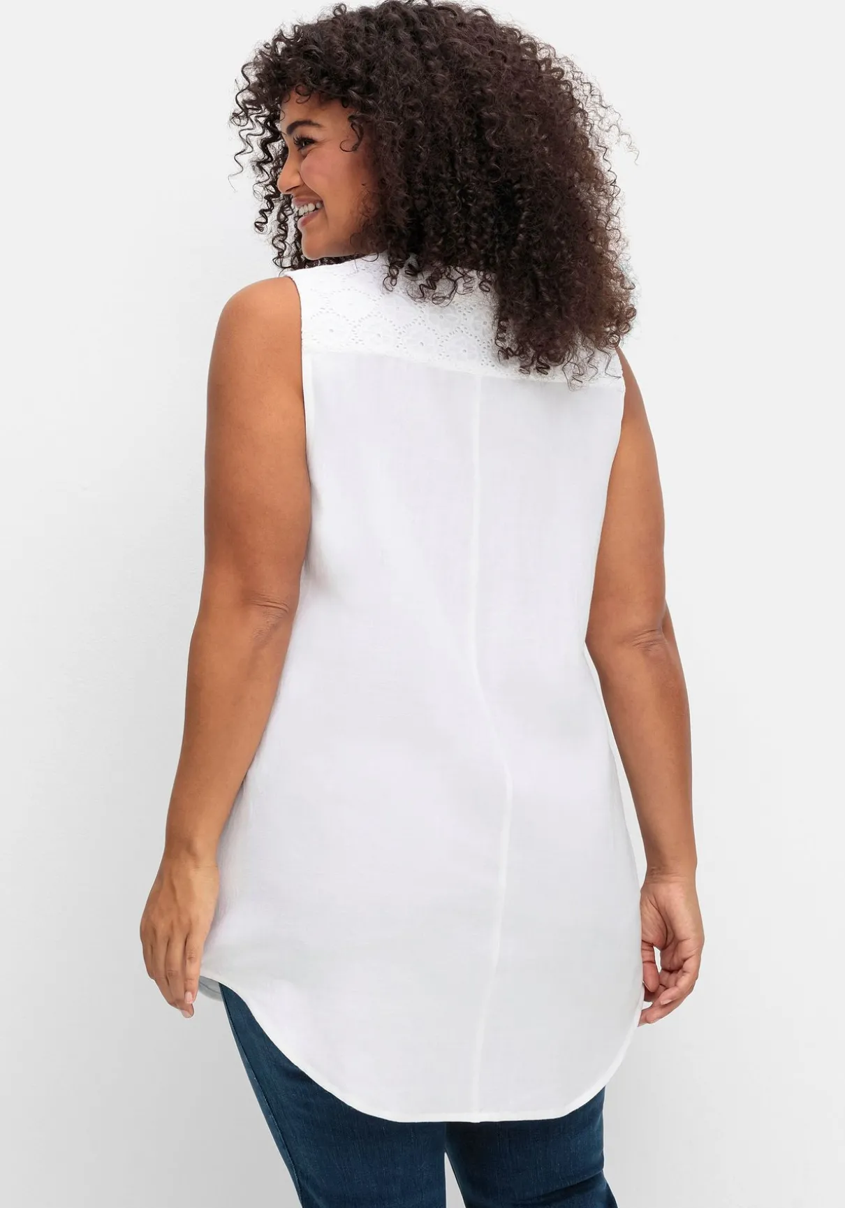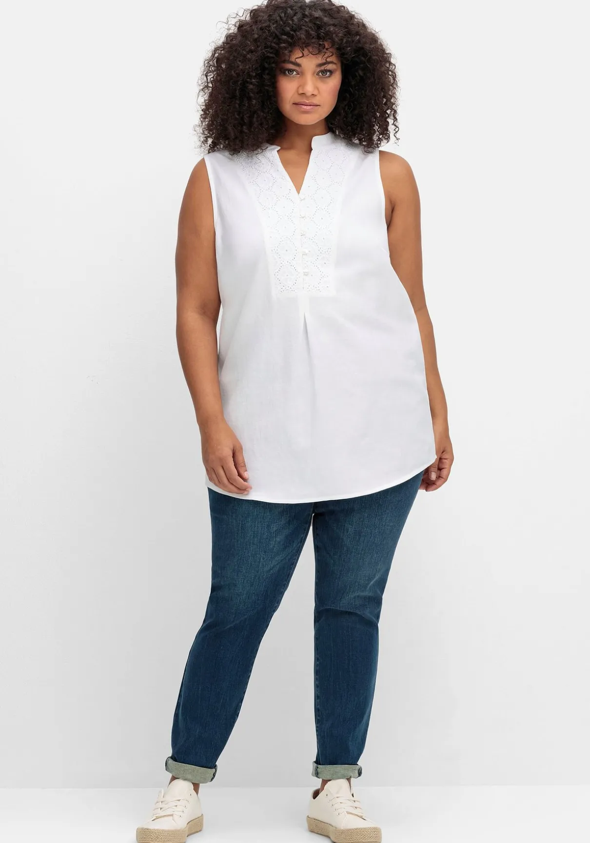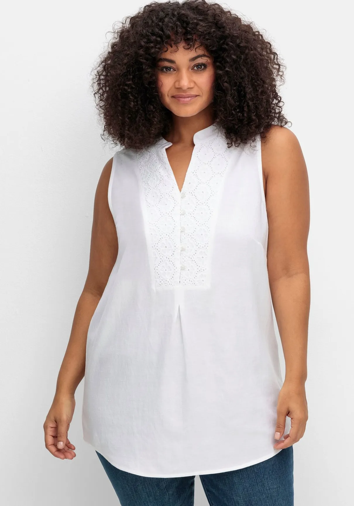 Schlicht und schön ist das Webtop von sheego by Joe Browns. Der edle Look entsteht durch den aufwendigen Spitzenbesatz um den Ausschnitt und an den Schultern. Der Rundhalsausschnitt geht in eine Knopfleiste über.