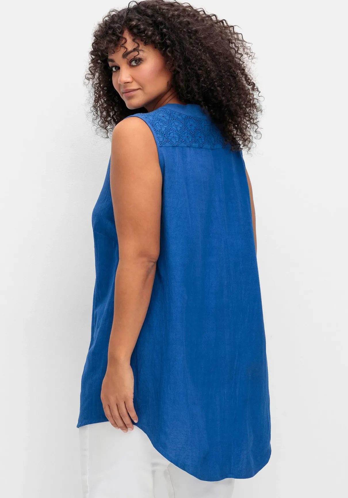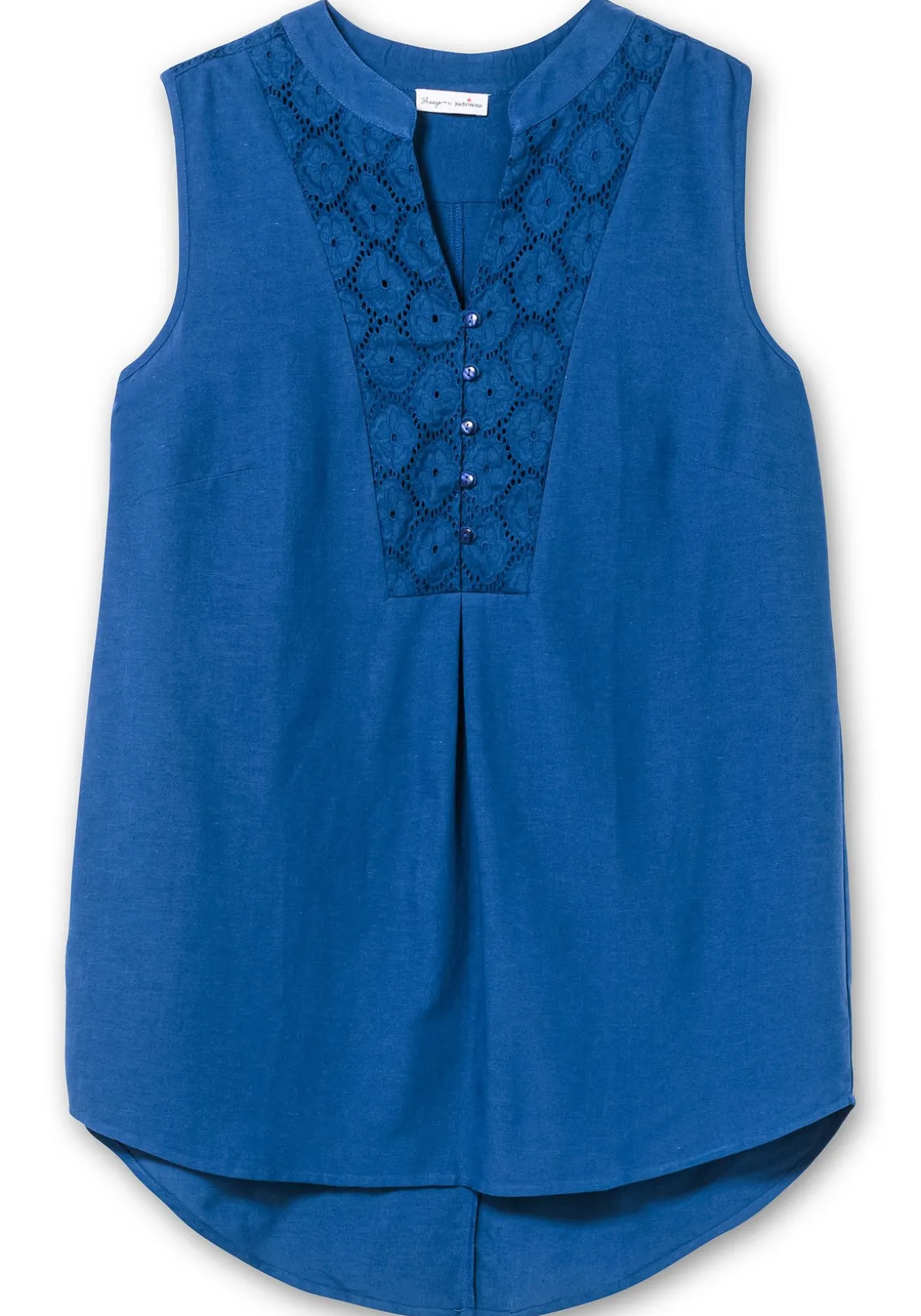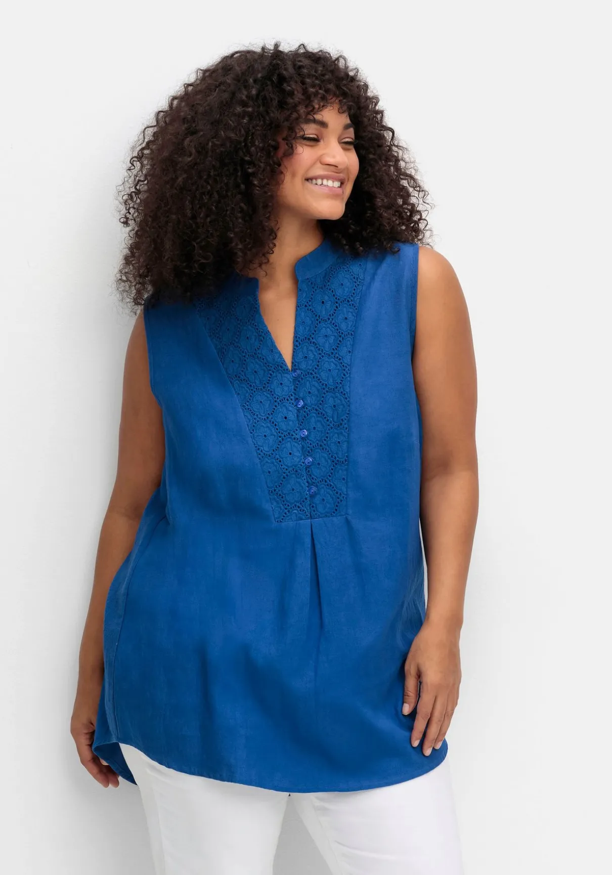 Schlicht und schön ist das Webtop von sheego by Joe Browns. Der edle Look entsteht durch den aufwendigen Spitzenbesatz um den Ausschnitt und an den Schultern. Der Rundhalsausschnitt geht in eine Knopfleiste über.