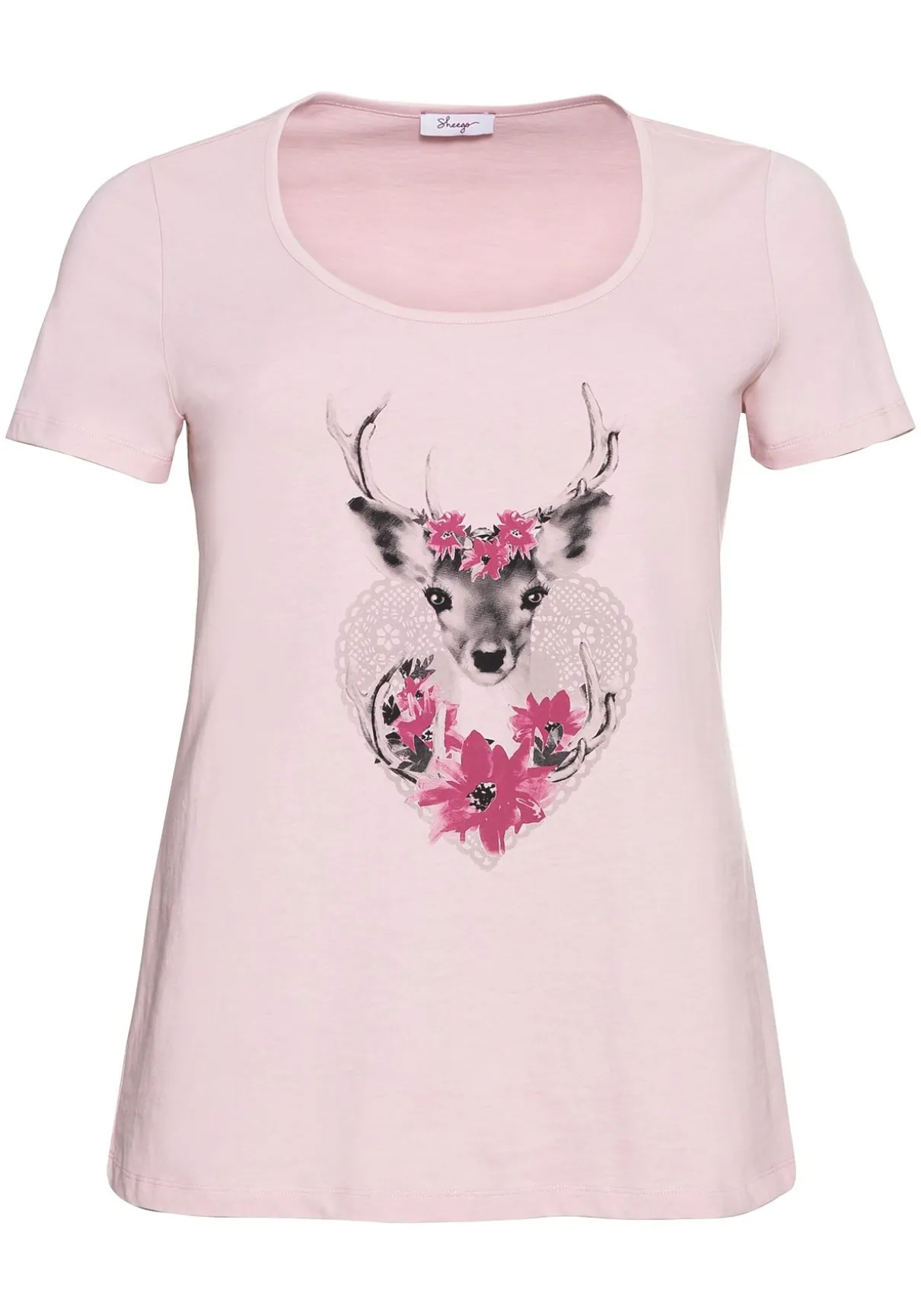 Für einen originellen Hingucker sorgt der Hirsch-Druck auf der Vorderseite dieses Trachtenshirts. Mit Rundhalsausschnitt.