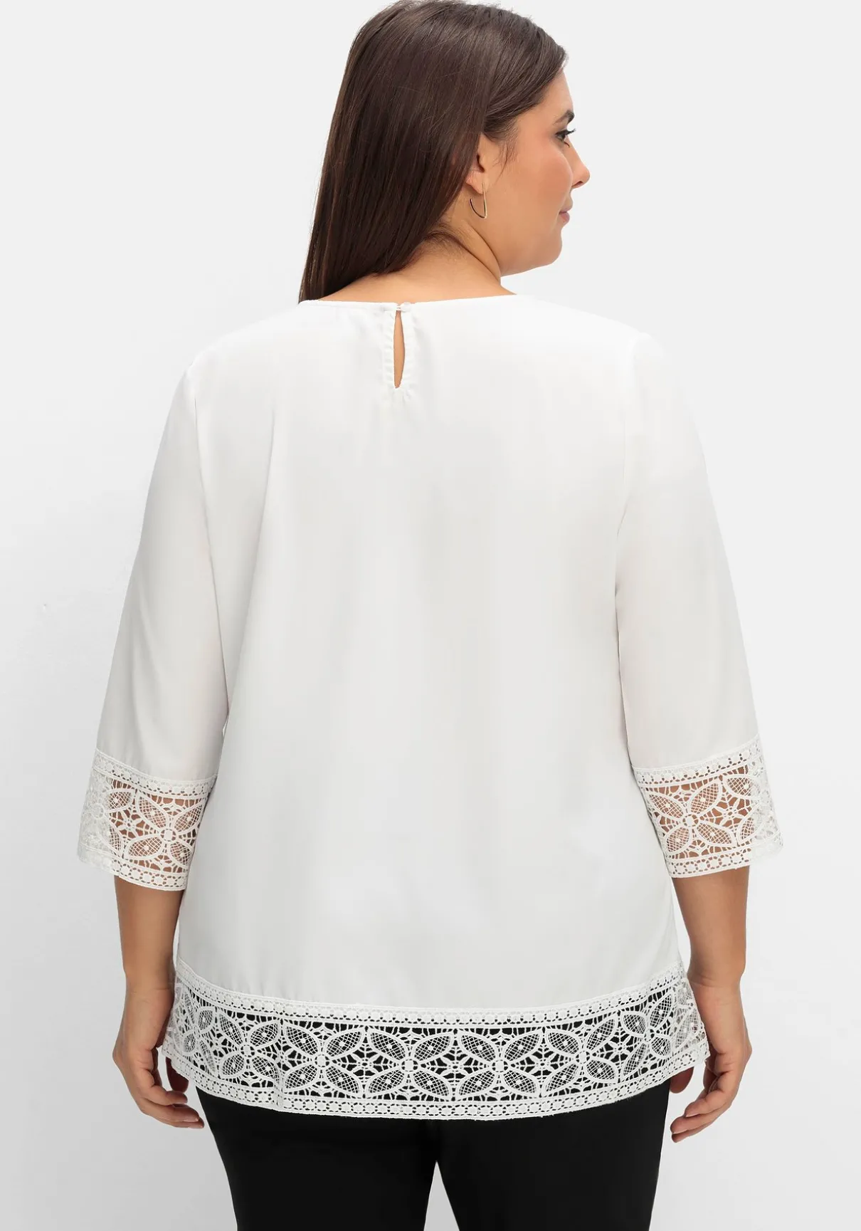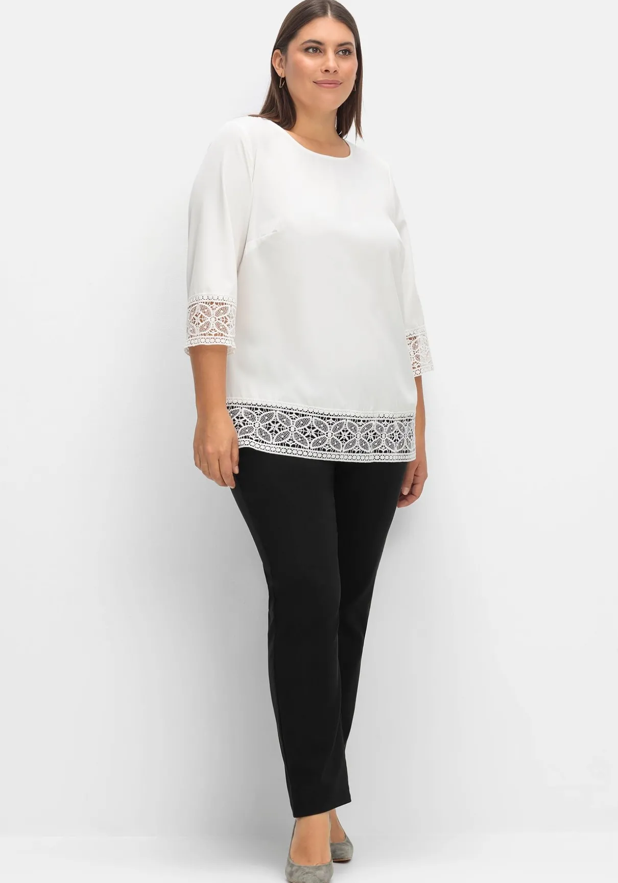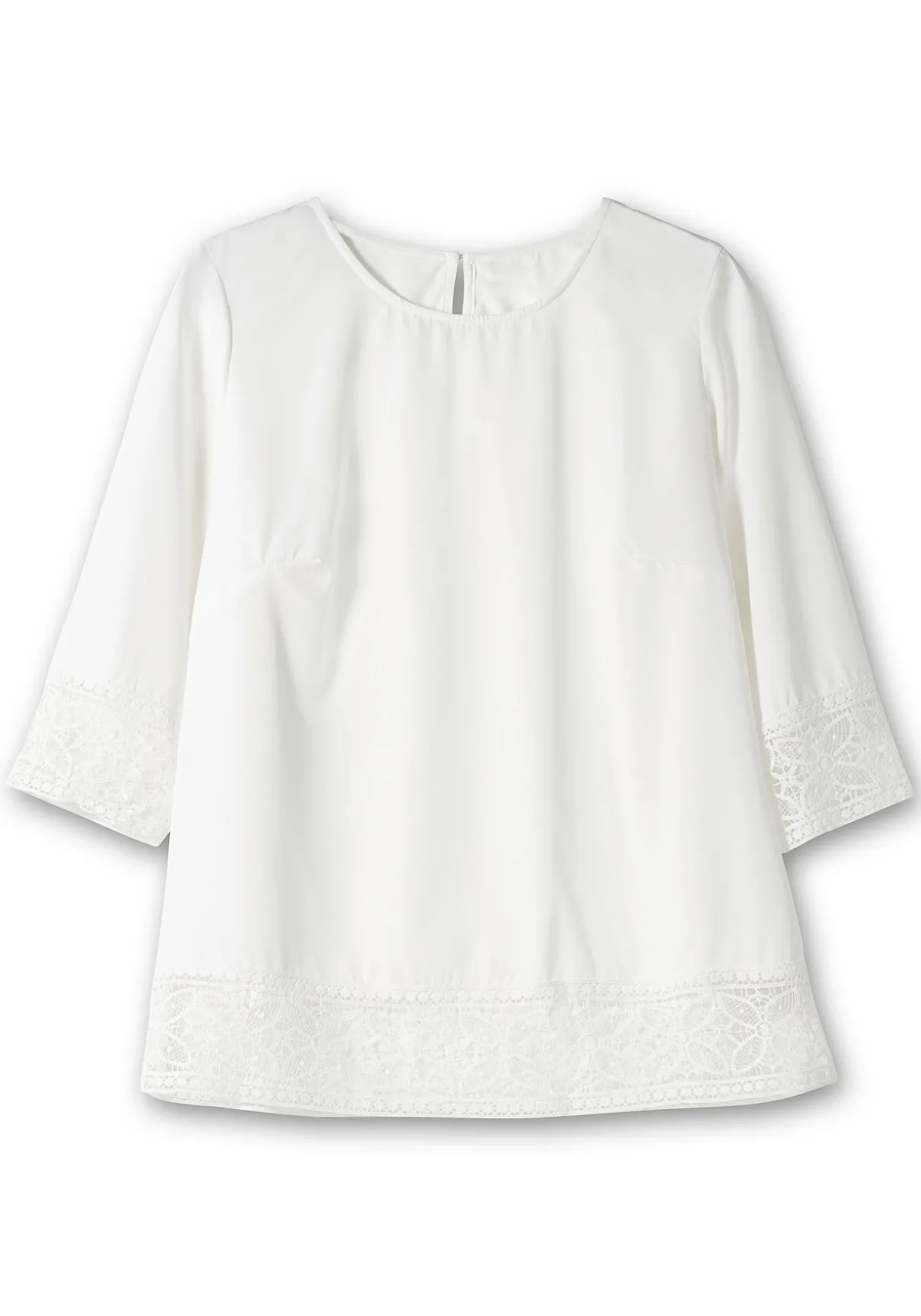 Tunika aus Crêpe. Eine breite Spitzenbordüre am Abschluss der 3/4-Ärmel sowie am Saum gibt dem Style eine feminine, verspielte Note. Der Knopfverschluss mit Schlitz hinten am Rundhalsausschnitt erleichtert das An- und Ausziehen.