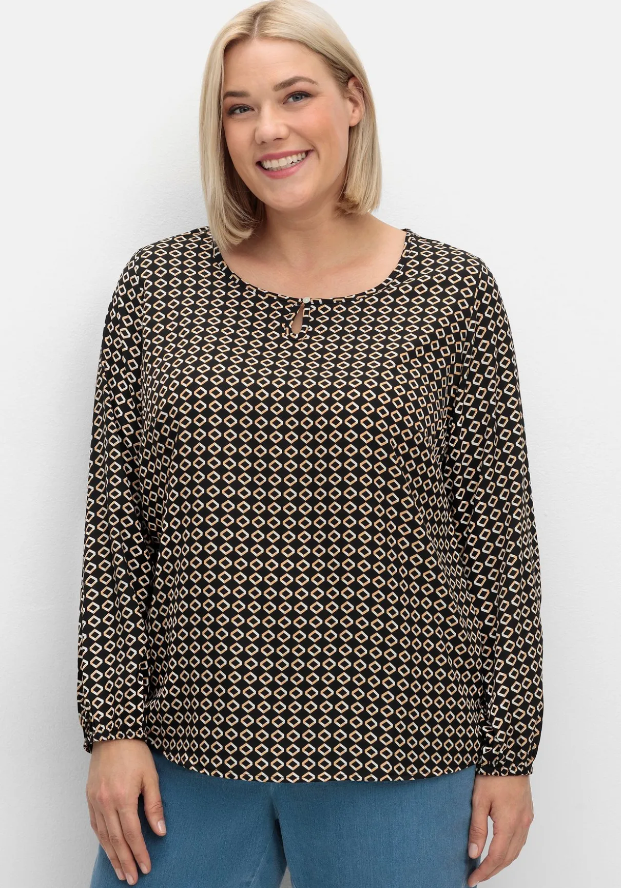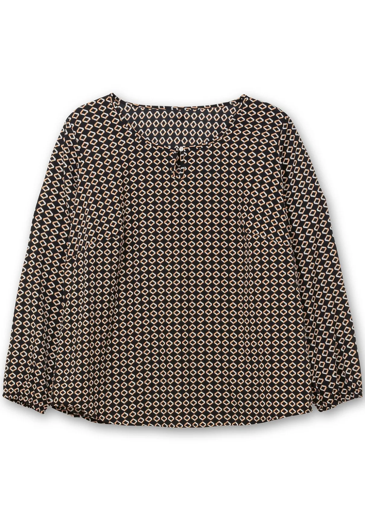 Tunika aus Crêpe. Stilsicher zeigt sie sich mit grafischem Alloverdruck. Der Rundhalsausschnitt ist mit Schlitz und Knopfverschluss gearbeitet, die Ärmel enden mit elastischen Bündchen. Durch den leicht abgerundeten Saum vorn und hinten fällt das Oberteil schön über die Hüfte. Brustabnäher und die Schulterpasse hinten sorgen für eine optimale Passform.