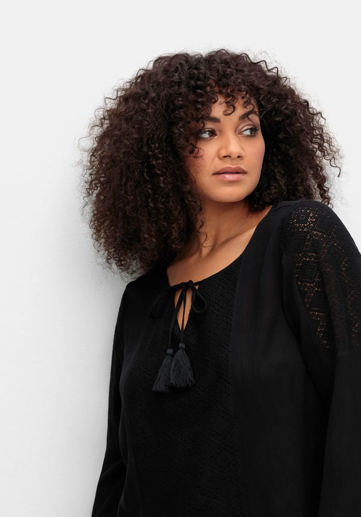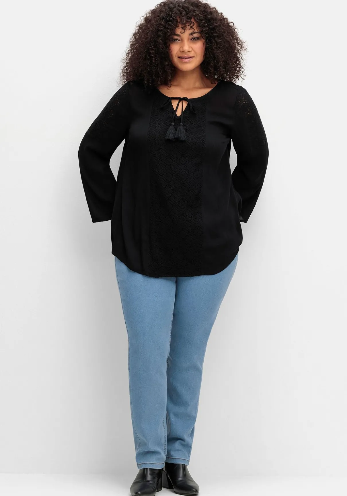 Tunika in Crinkle-Optik von sheego by Joe Browns. Der Rundhalsausschnitt ist mit V-Schlitz gearbeitet, hübsches Detail ist das Bindeband mit dekorativer Tassel. Ein mittig verlaufender Einsatz aus blickdichter Crochet-Spitze zieht die Blicke auf sich, auch die Ärmel sind mit Crochet-Spitze verziert – hier ist sie leicht transparent.