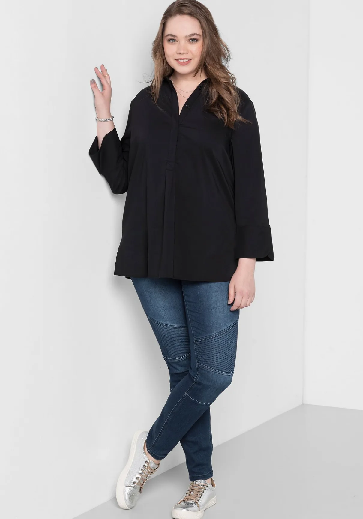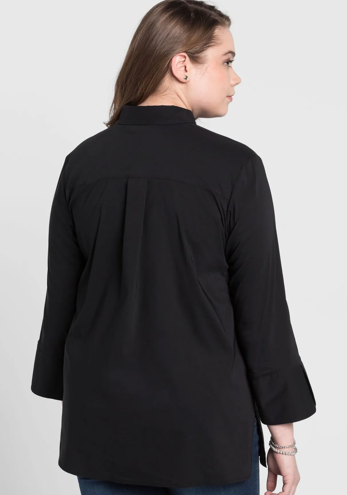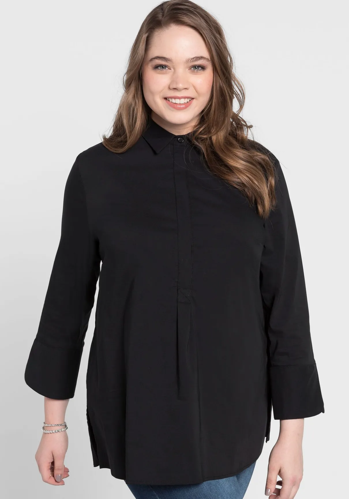 Ein easy zu kombinierendes Basic ist diese Tunika im unkomplizierten Design. Die verdeckte Knopfleiste und die 3/4-langen Ärmel mit Schlitz und breiter Manschette verleihen ihr ein hochwertiges und gepflegtes Aussehen. Auch der Saum ist geschlitzt und bietet dadurch angenehmen Tragekomfort. Für einen weichen, schmeichelnden Fall sorgen Passe und Falte im Rückenteil.