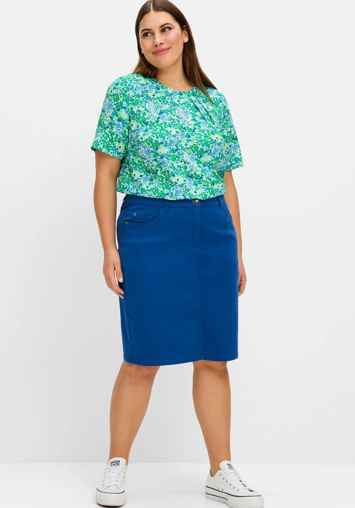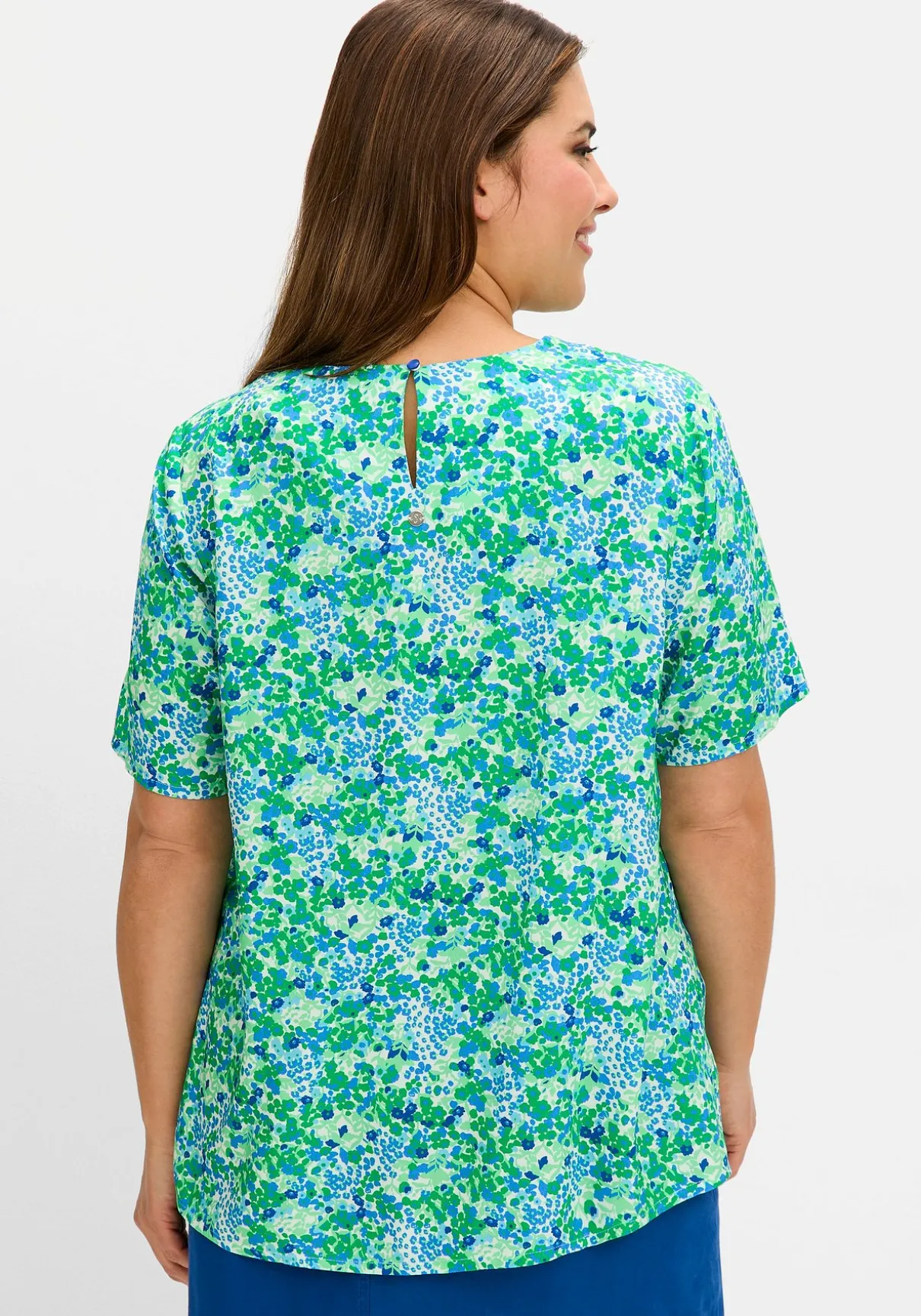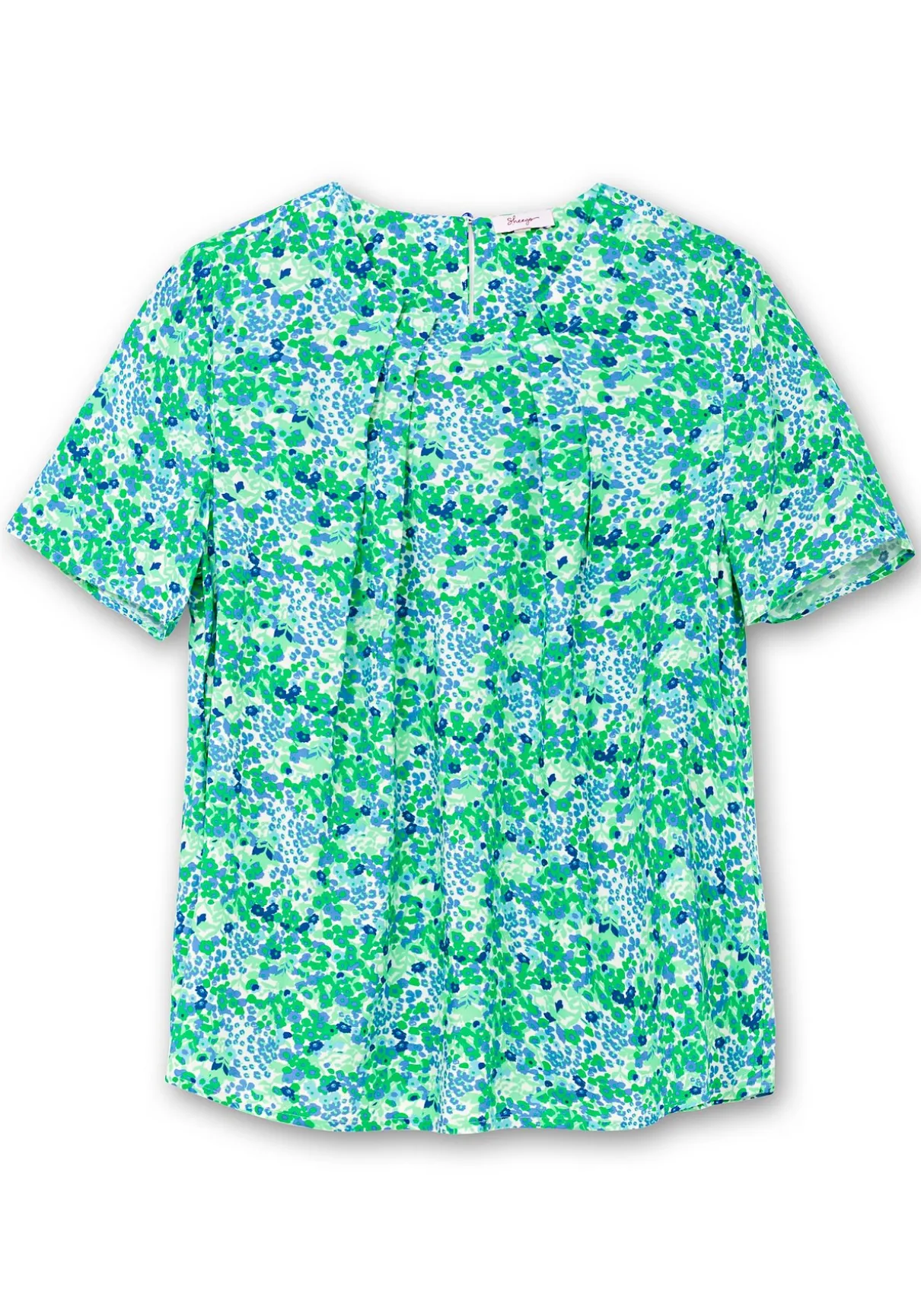 Tunika in leichter A-Linie. Dekorative Falten am Rundhalsausschnitt verleihen dem Oberteil femininen Charme. Der Schlitz mit Knopfverschluss im Nacken ist eine stilvolle Ergänzung. Der verlängerte Halbarm schmeichelt den Oberarmen, während die leichte A-Linie eine feminine Silhouette schafft.