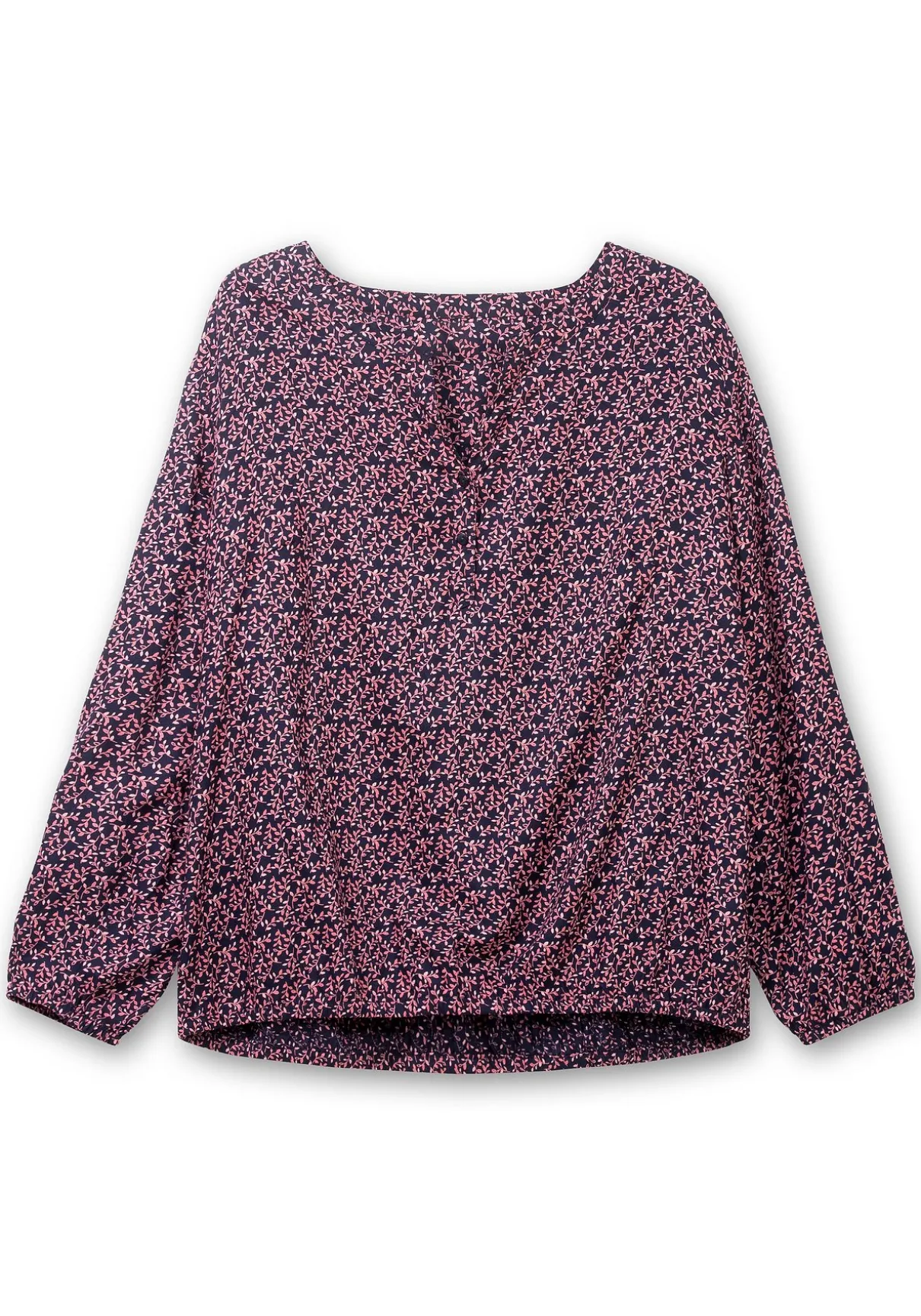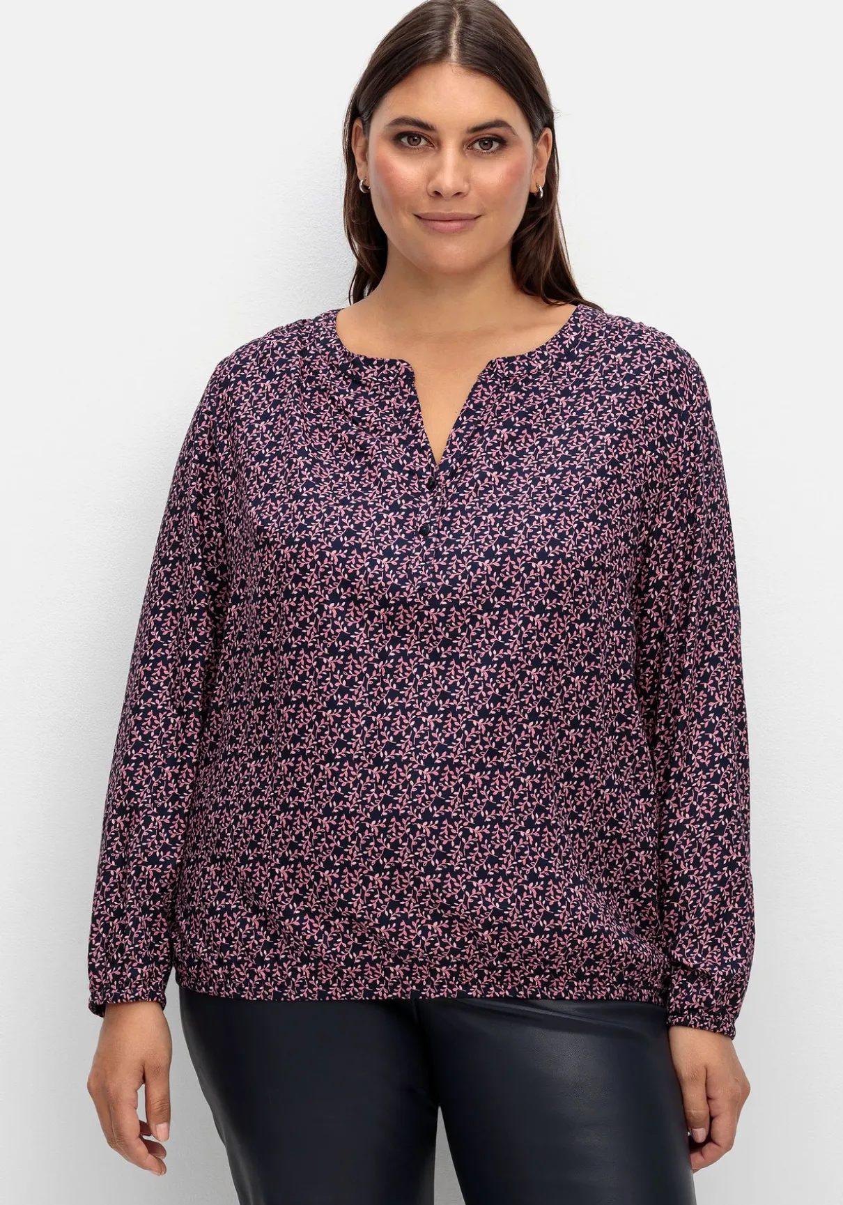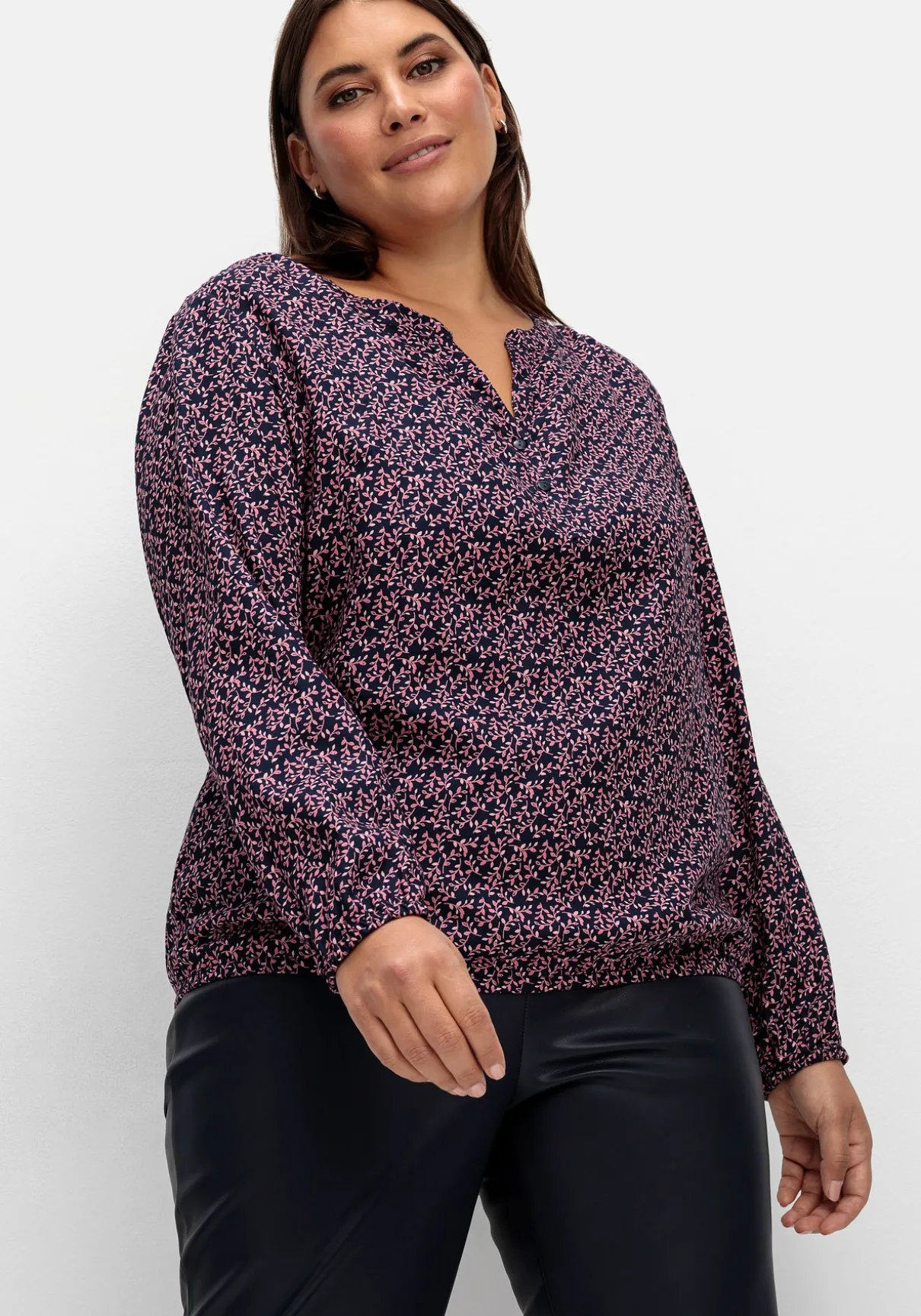 Tunika mit Minimal-Alloverdruck. Der Rundhalsausschnitt geht in einen V-Schlitz und eine kurze Knopfleiste über, dezente Falten in der Schulterpartie sind ein feminines Detail. Die langen Ärmel und der Saum enden mit einem Gummizug, im Rücken gibt eine Kellerfalte figurumspielende Weite.