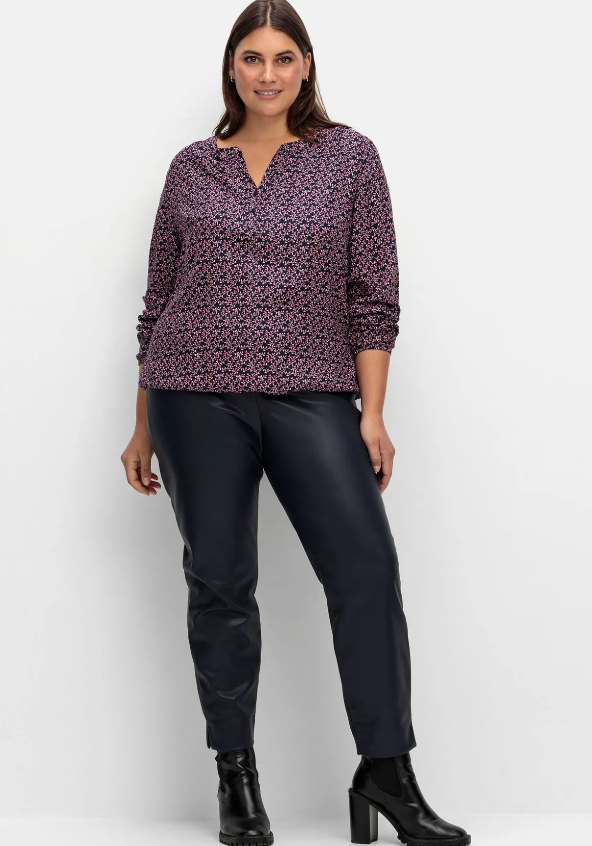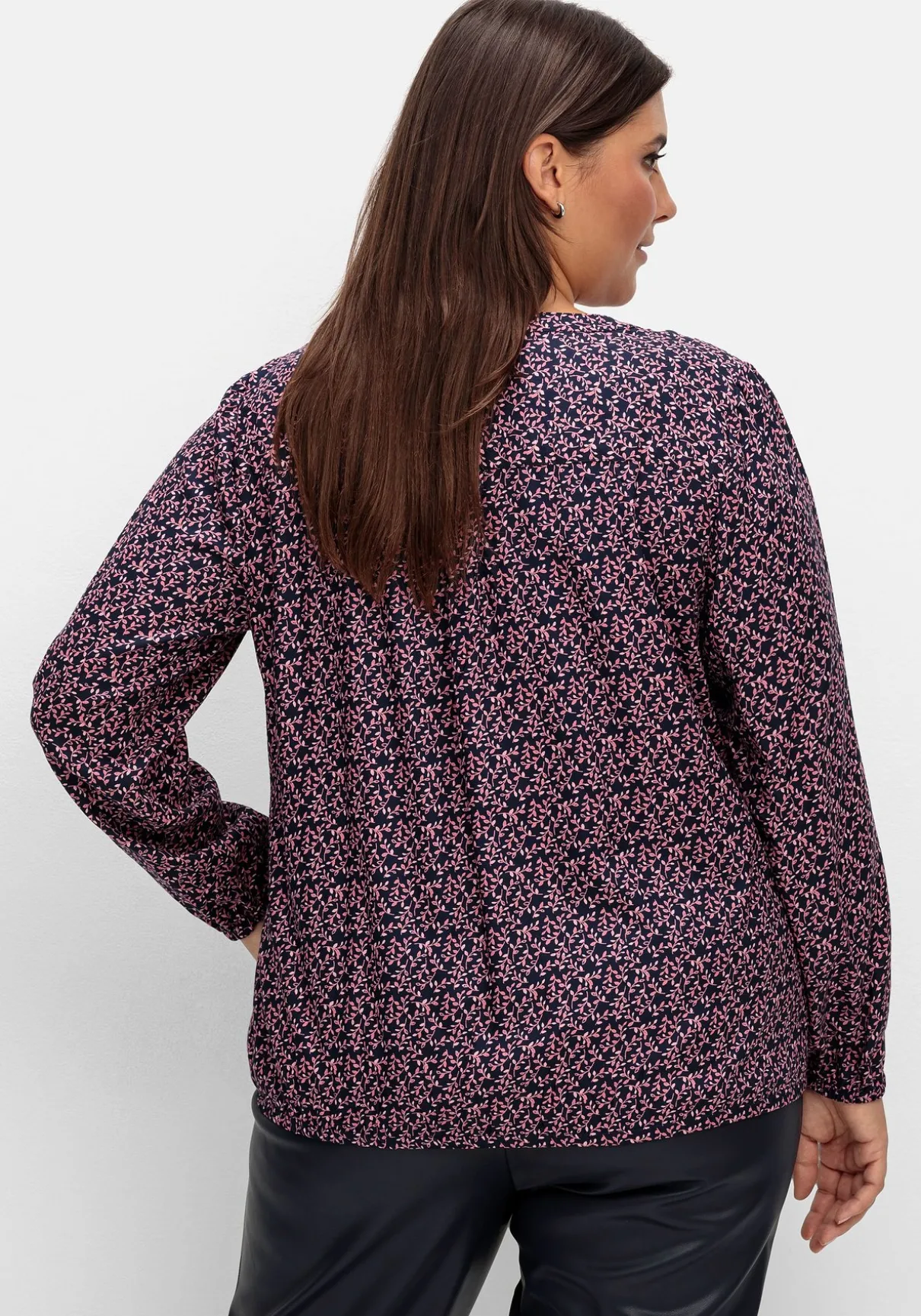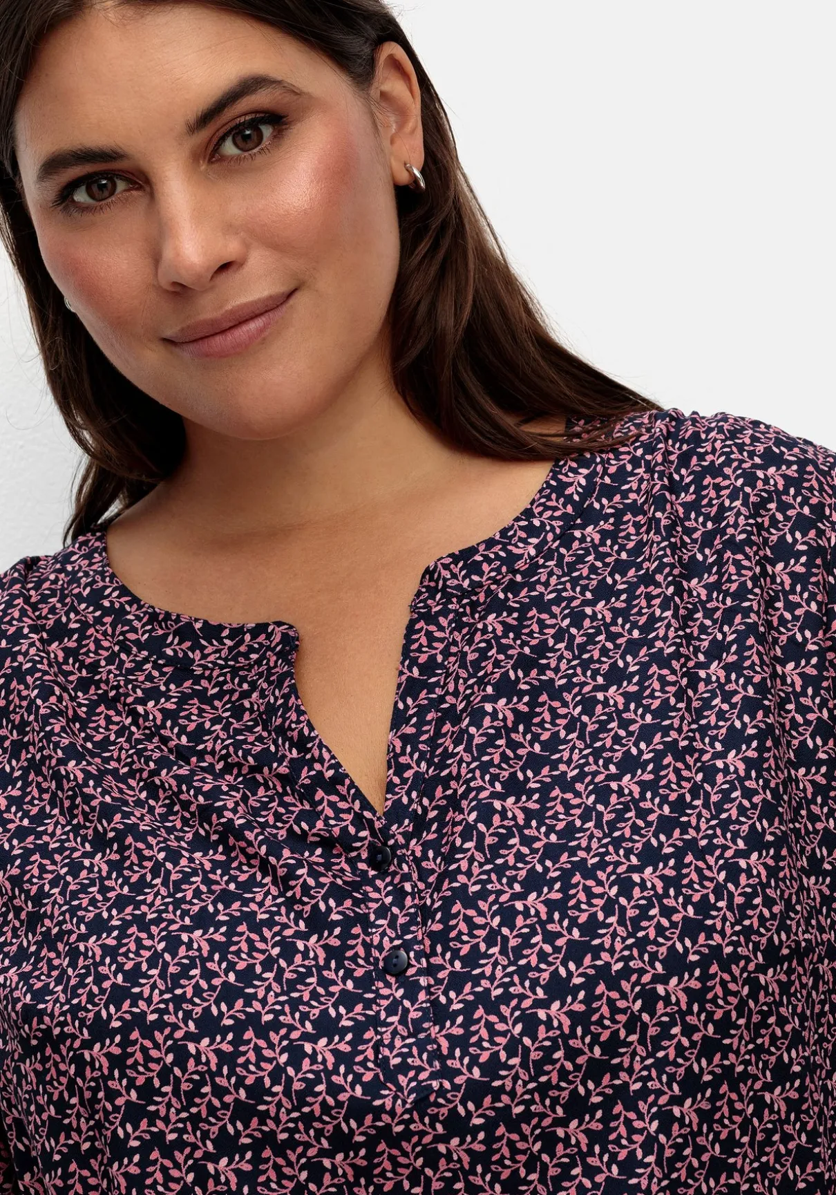 Tunika mit Minimal-Alloverdruck. Der Rundhalsausschnitt geht in einen V-Schlitz und eine kurze Knopfleiste über, dezente Falten in der Schulterpartie sind ein feminines Detail. Die langen Ärmel und der Saum enden mit einem Gummizug, im Rücken gibt eine Kellerfalte figurumspielende Weite.