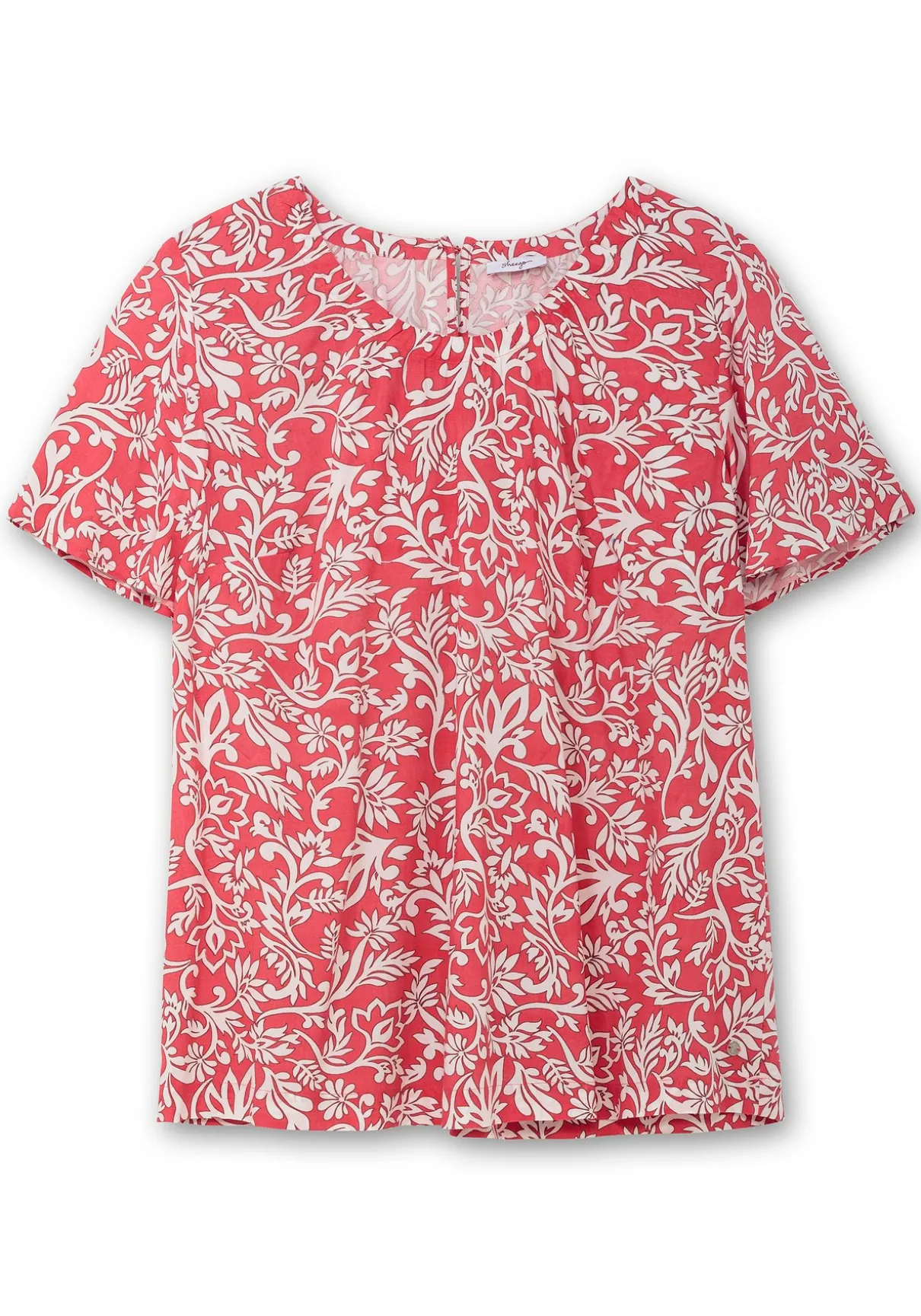 Tunika mit Blätter-Alloverprint. Der dezent gekräuselte Rundhalsausschnitt verleiht ihr eine feminine Note, während der Schlitz mit Knopfverschluss am hinteren Ausschnitt für einen stilvollen Akzent sorgt. Kurze Flügelärmel unterstreichen den luftigen Charakter. Die leichte A-Linie mit einem leicht gerundeten Saumabschluss bietet eine feminine Silhouette.