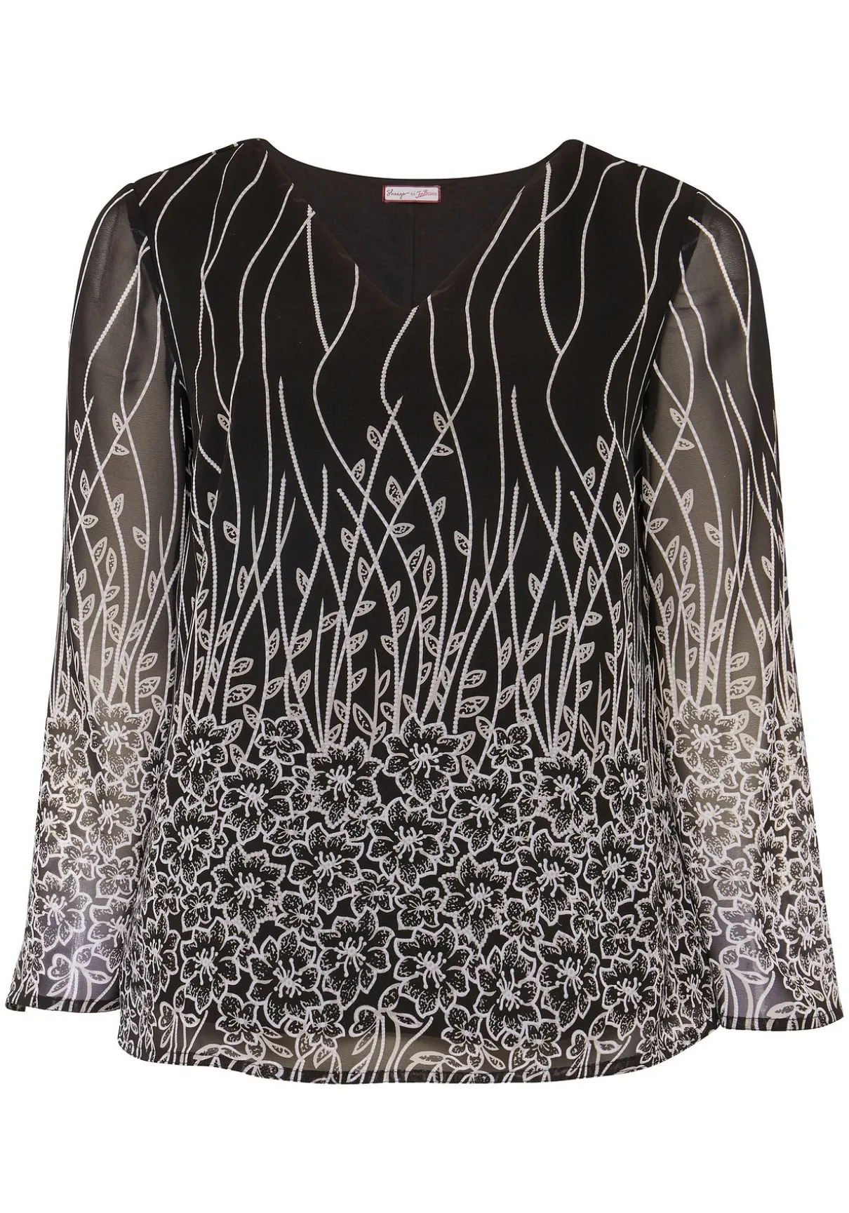 Tunika aus fein transparentem Chiffon von sheego by Joe Browns. Dabei ist der Body blickdicht mit einem Untershirt gearbeitet, nur die weit geschnittenen Trompetenärmel gewähren zarte Einblicke. Besonders schön zeigt sich der Alloverdruck, der sich vom V-Ausschnitt aus in Wellenform präsentiert und dann sanft in Flora und Fauna übergeht.