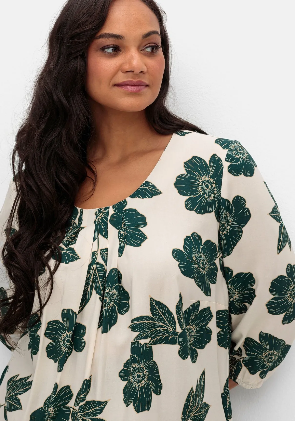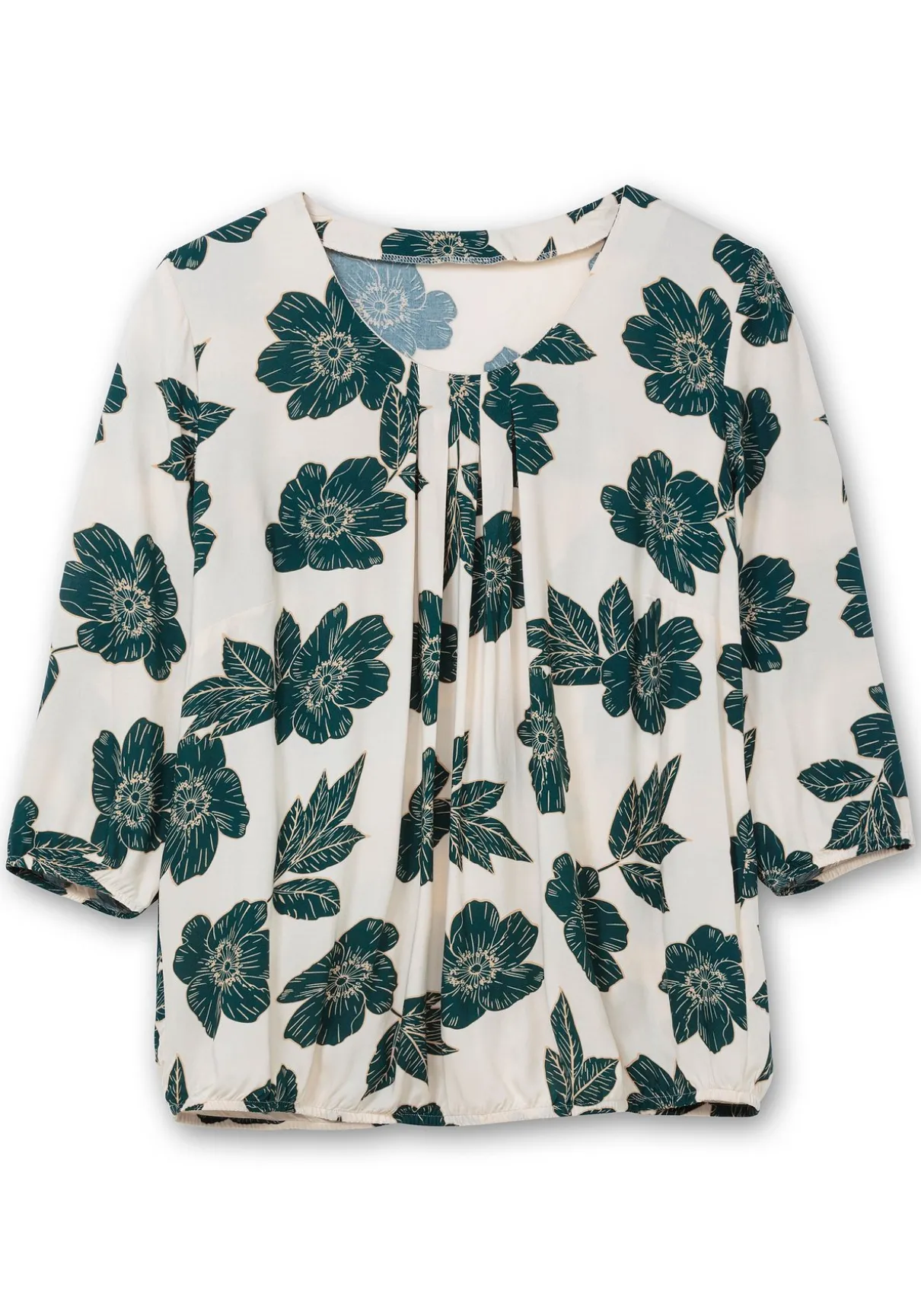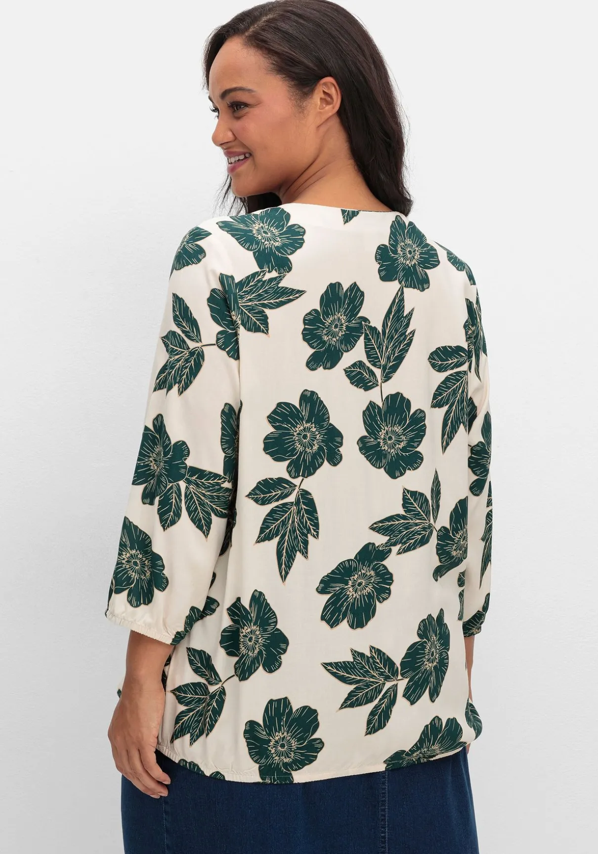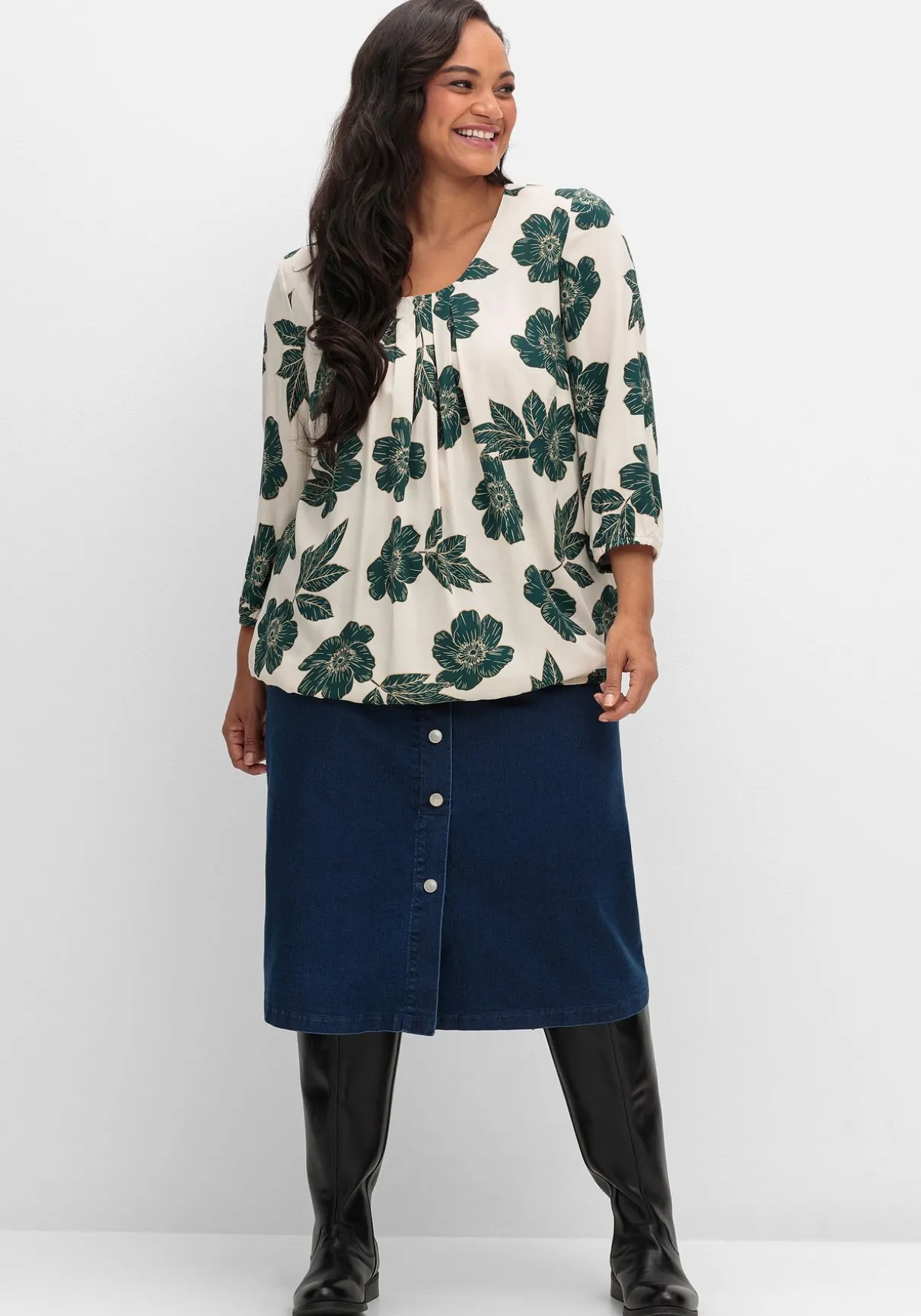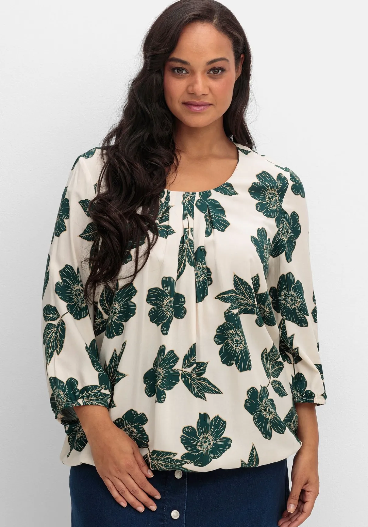 Tunika mit Alloverdruck. Der wunderschöne Print aus Blüten und Blättern macht das Oberteil zum femininen Blickfang. Geschickt gelegte Falten am Rundhalsausschnitt geben angenehme Weite, am Saum fasst ein Gummizug den Schnitt schmeichelnd zusammen. Auch die 3/4-langen Ärmel enden mit bequemen Gummibündchen.