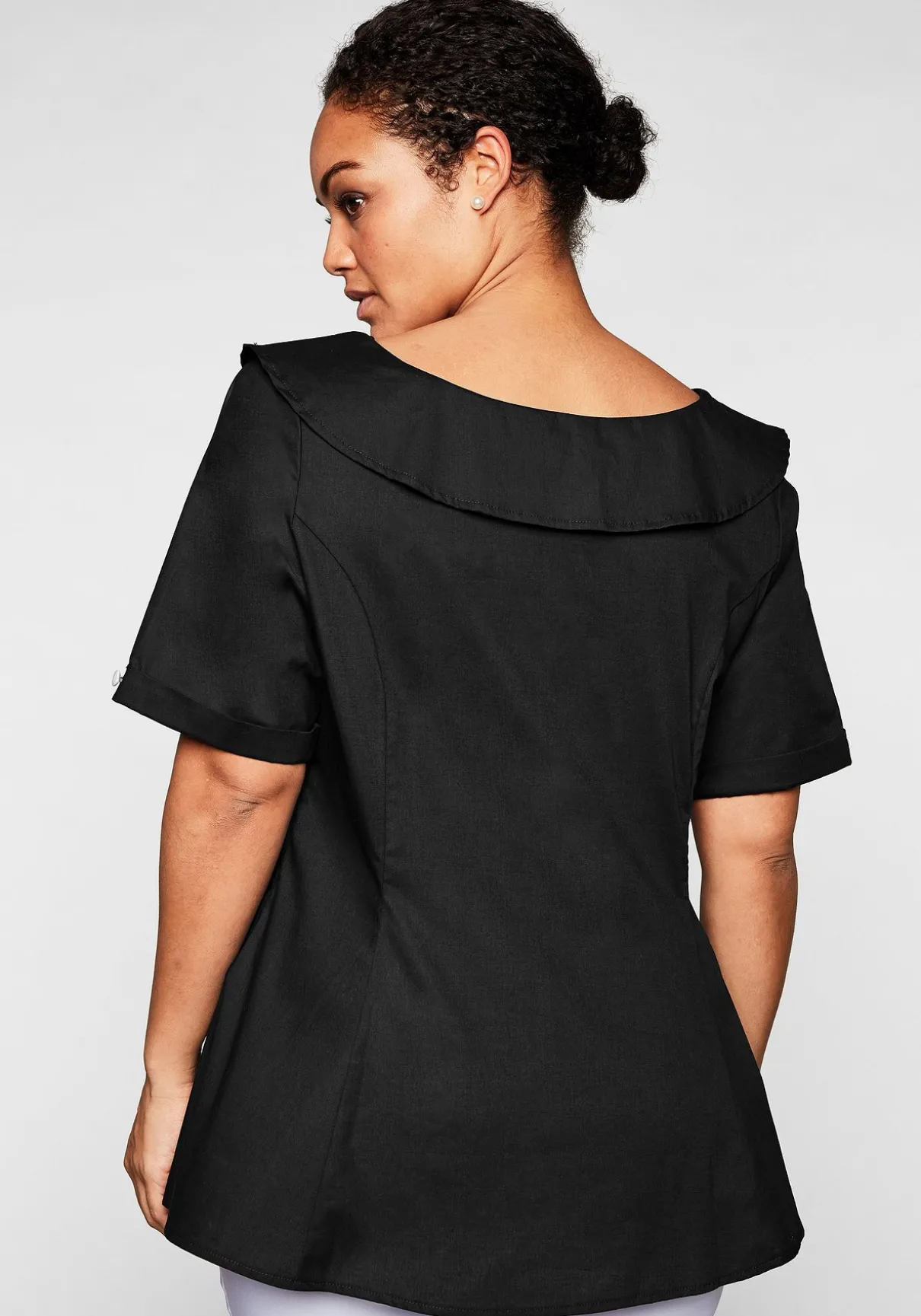 Tunika von sheego by Joe Browns. Für die feminine Optik sorgt der weite Ausschnitt mit breitem, rundem Kragen. Auch die kontrastfarbenen Zierknöpfe fallen ins Auge. Die kurzen Ärmel enden mit Aufschlägen. Dank des seitlichen, nahtfeinen Reißverschlusses wird das Ankleiden erleichtert.