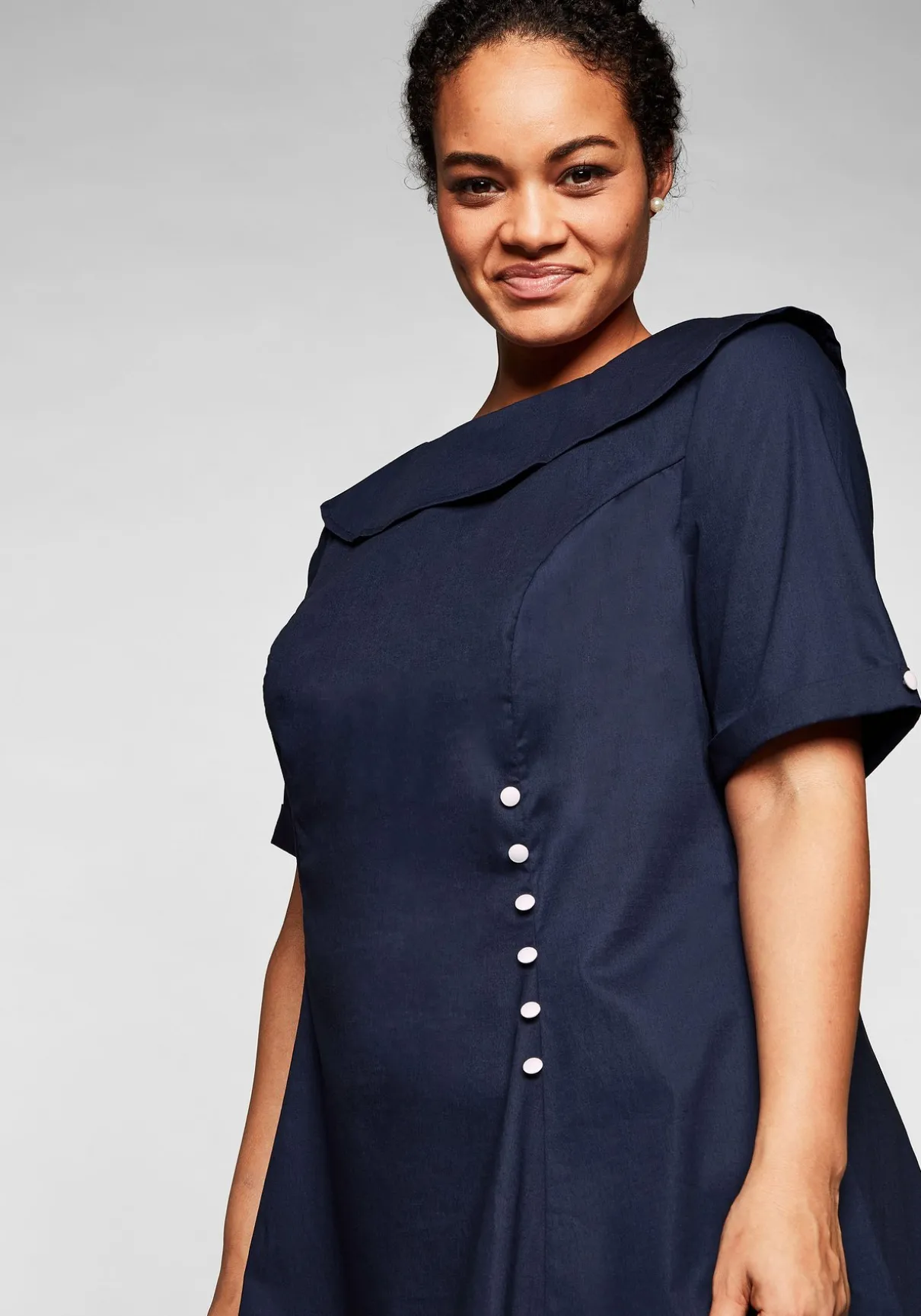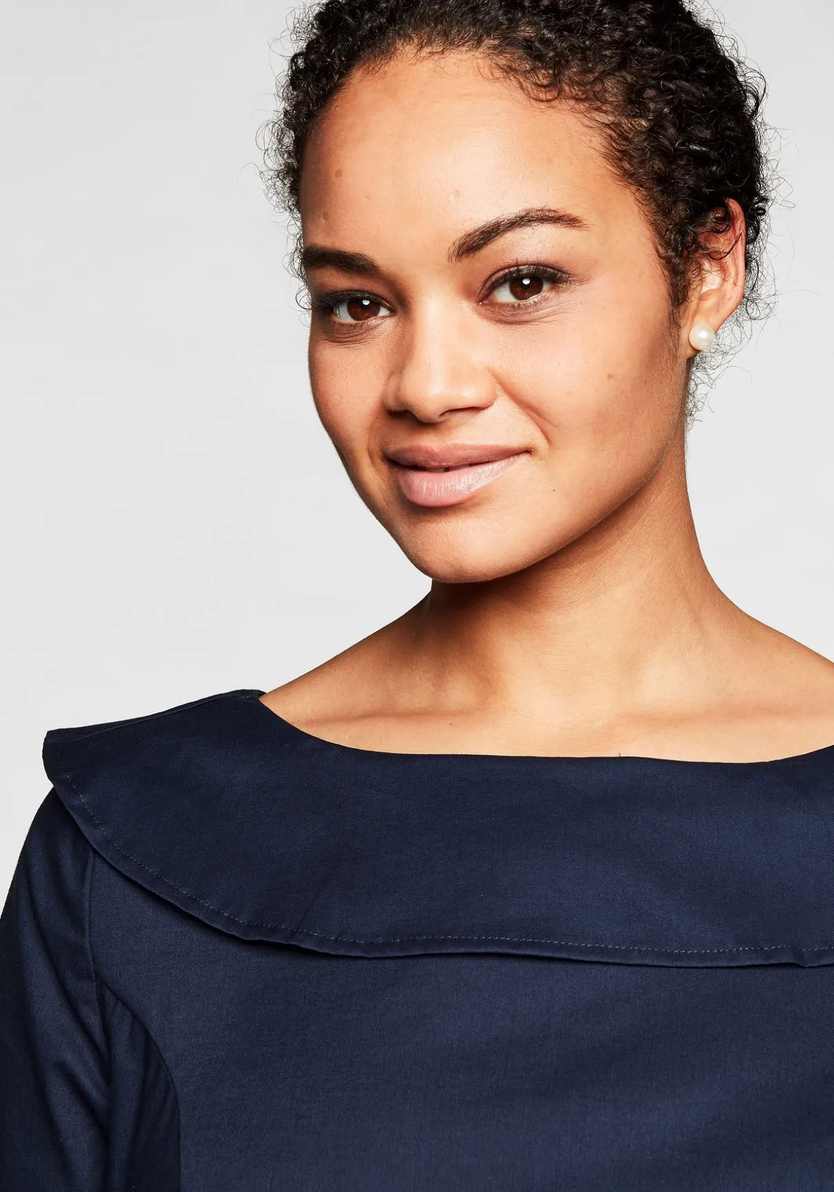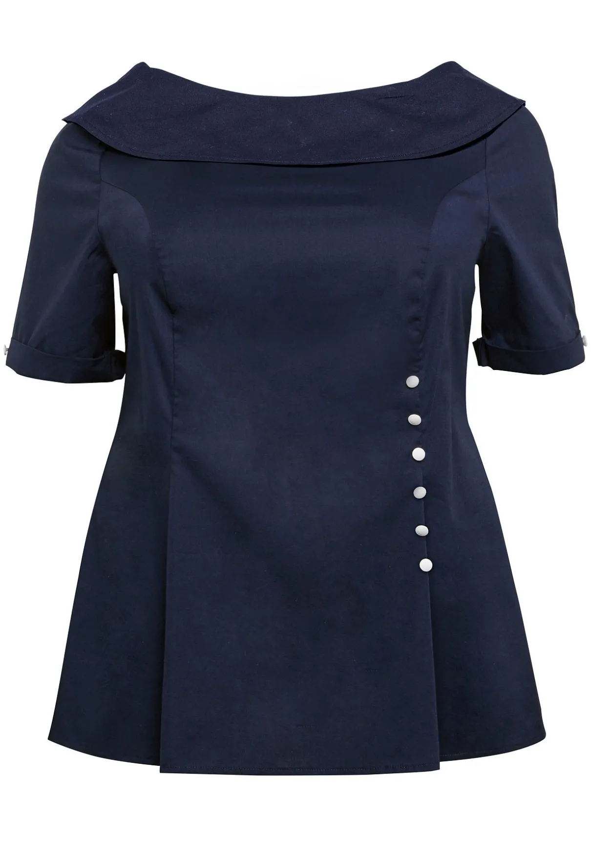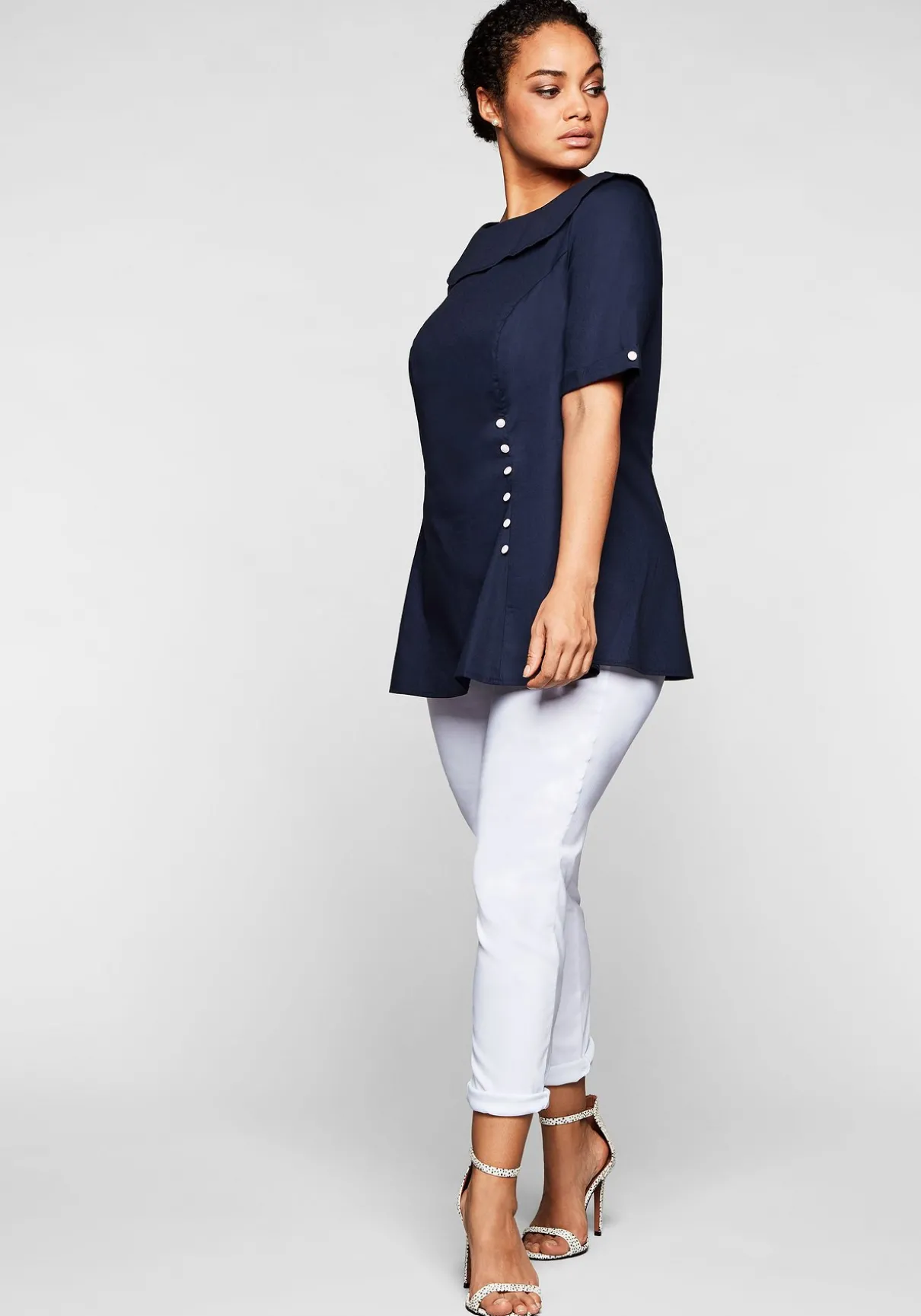 Tunika von sheego by Joe Browns. Für die feminine Optik sorgt der weite Ausschnitt mit breitem, rundem Kragen. Auch die kontrastfarbenen Zierknöpfe fallen ins Auge. Die kurzen Ärmel enden mit Aufschlägen. Dank des seitlichen, nahtfeinen Reißverschlusses wird das Ankleiden erleichtert.