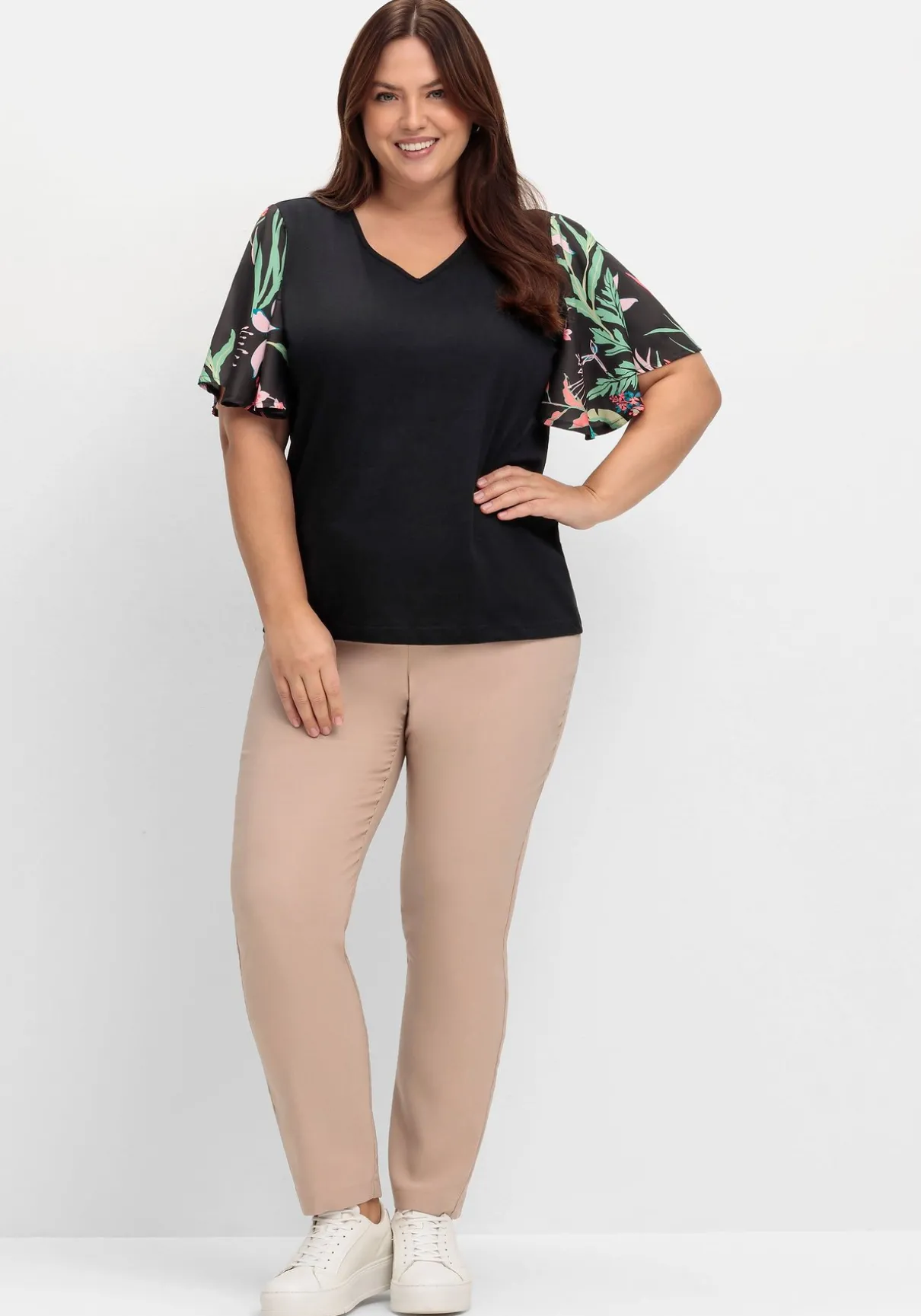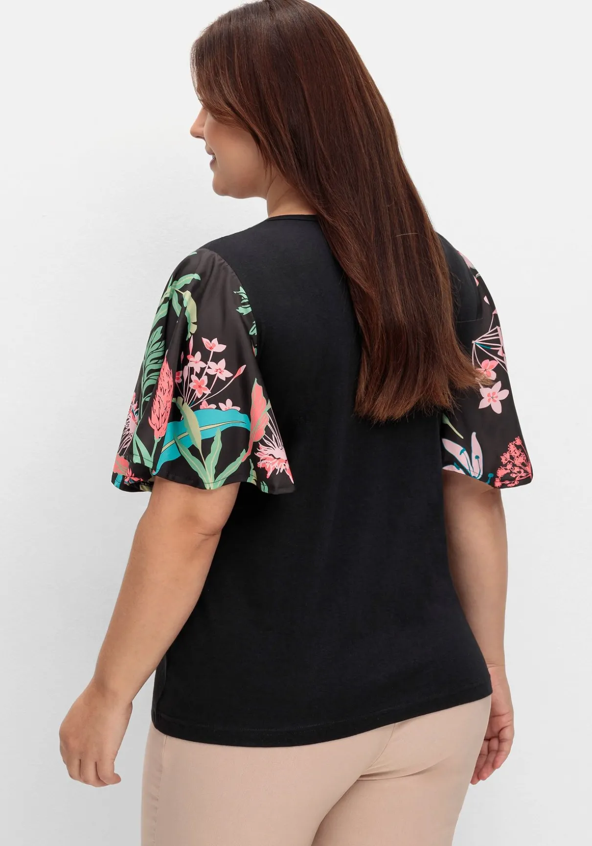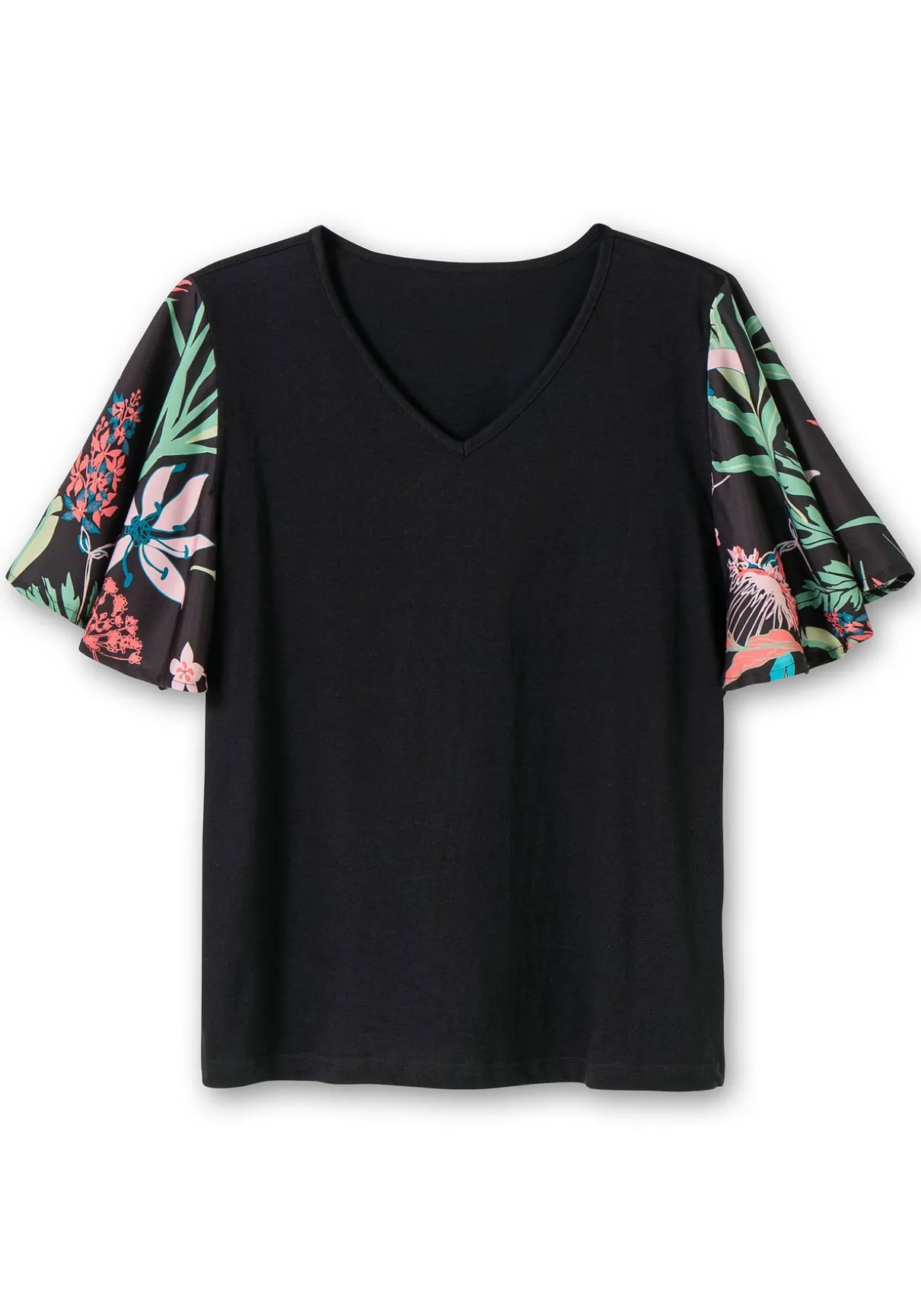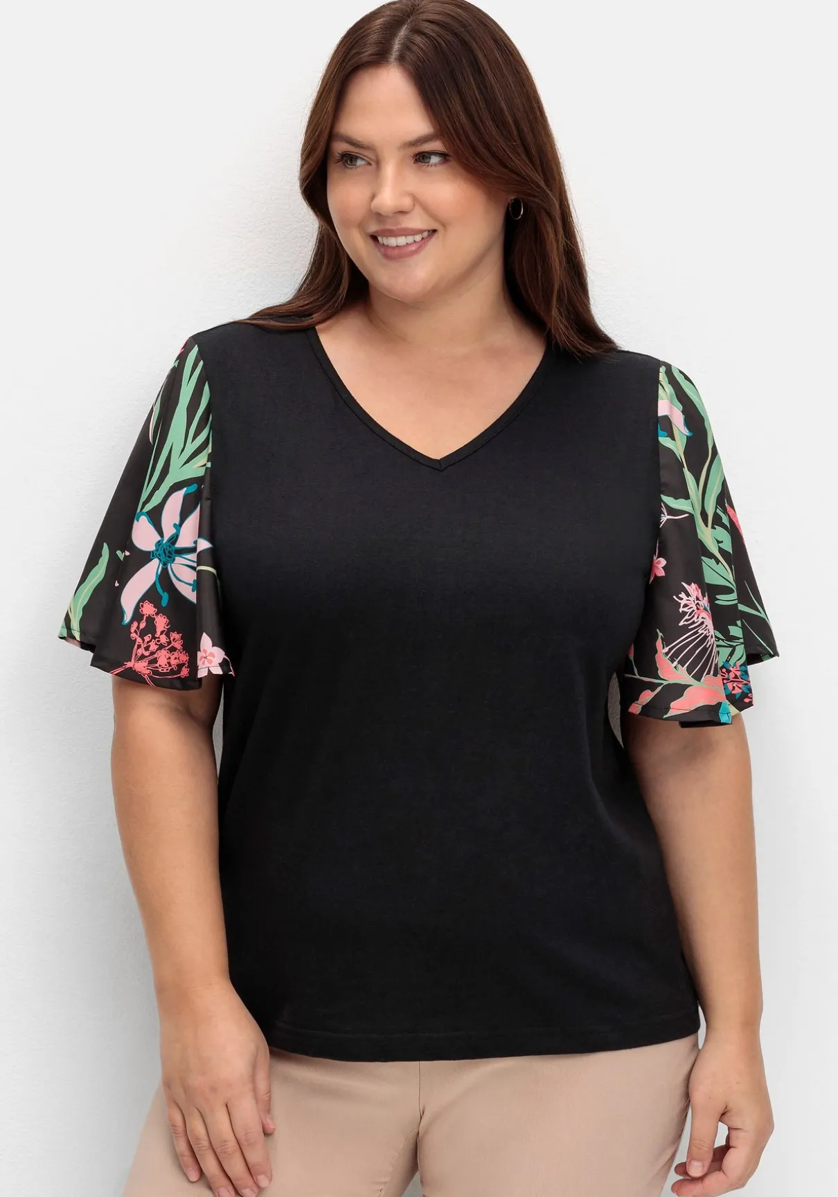 Tunika mit V-Ausschnitt. Feminin wird der Look durch die weiten, mit Blumen bedruckten Flügelärmel aus leichtem Blusenstoff.