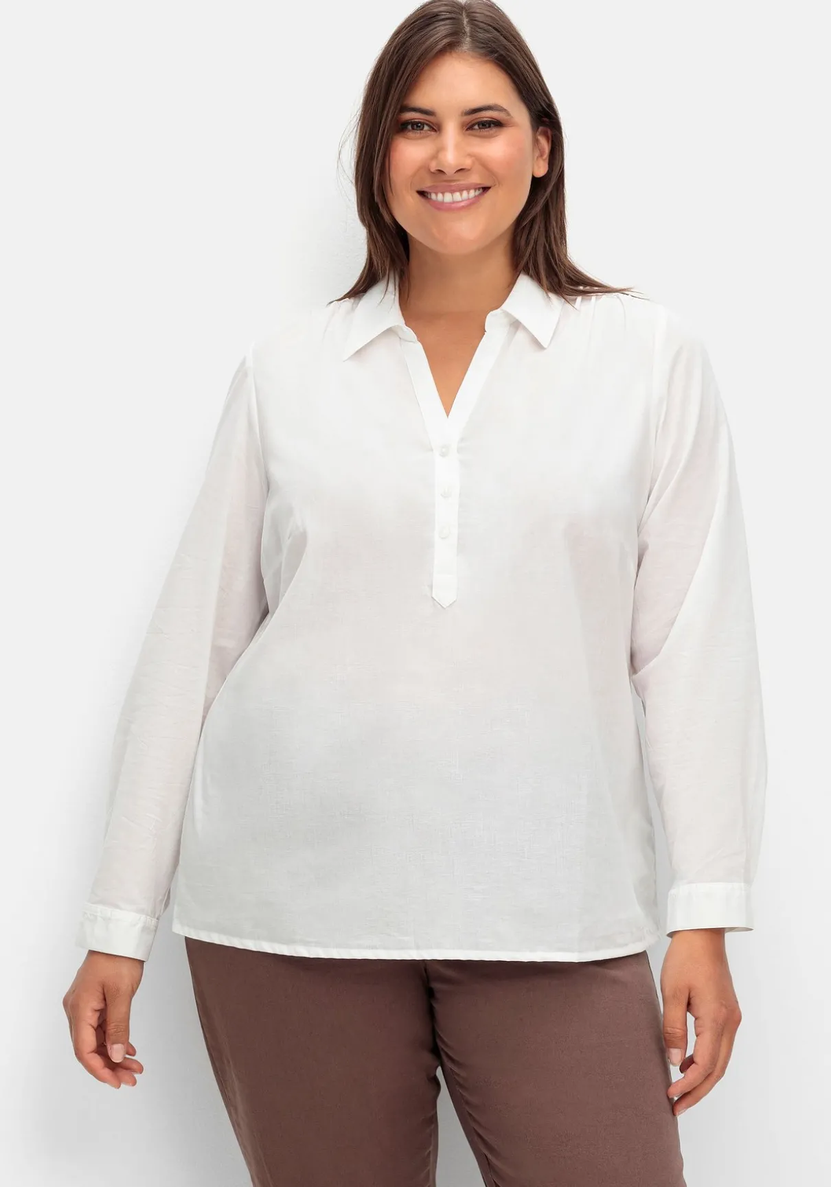 Tunika mit kurzer Knopfleiste. Der offene Hemdkragen mit V-Ausschnitt sowie die kleinen Raffungen an Schulter und Rückenpartie geben der Bluse eine feminine Optik. Breite Manschettenärmel mit Schlitz und Knopf runden den klassischen Stil gepflegt ab.