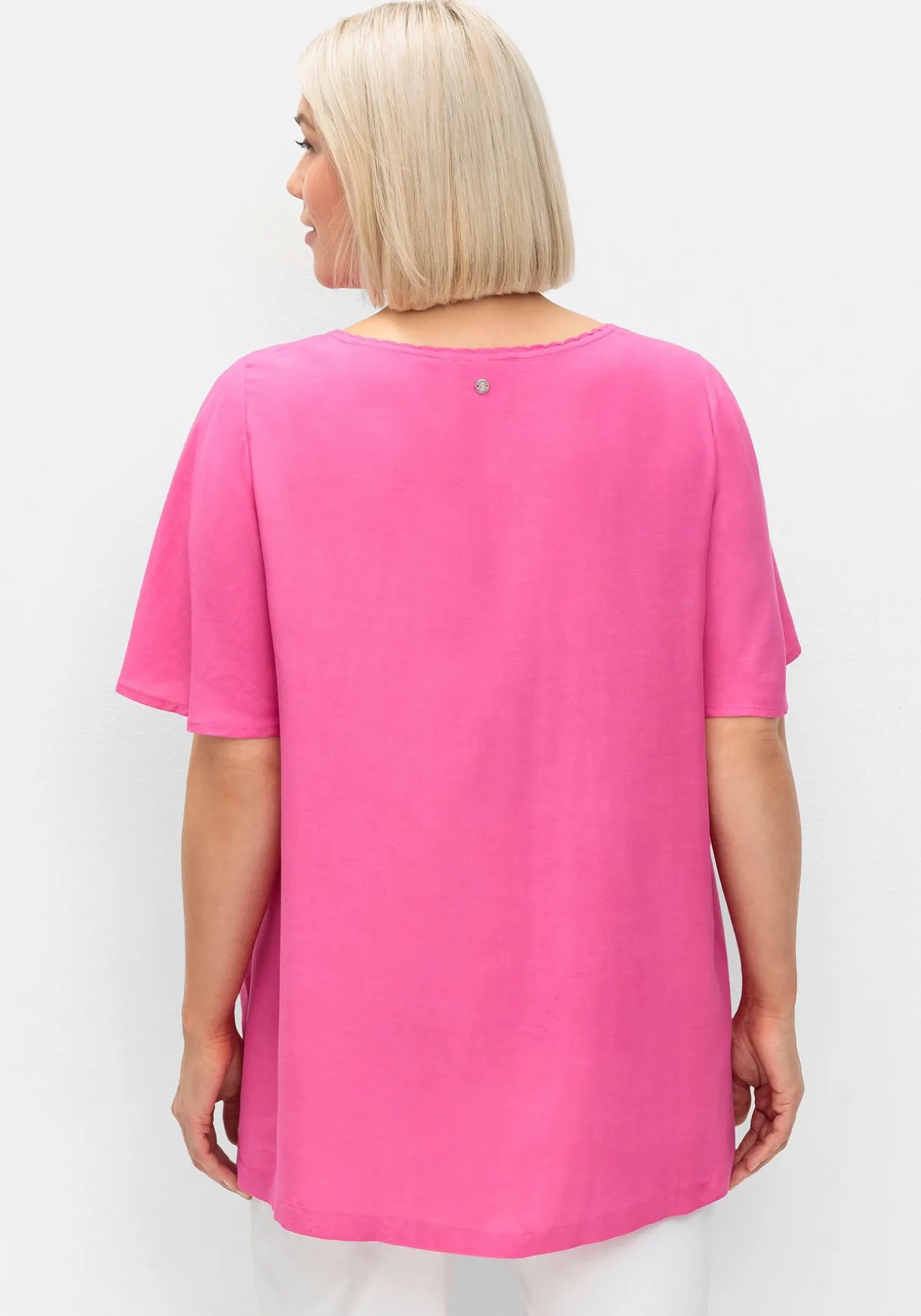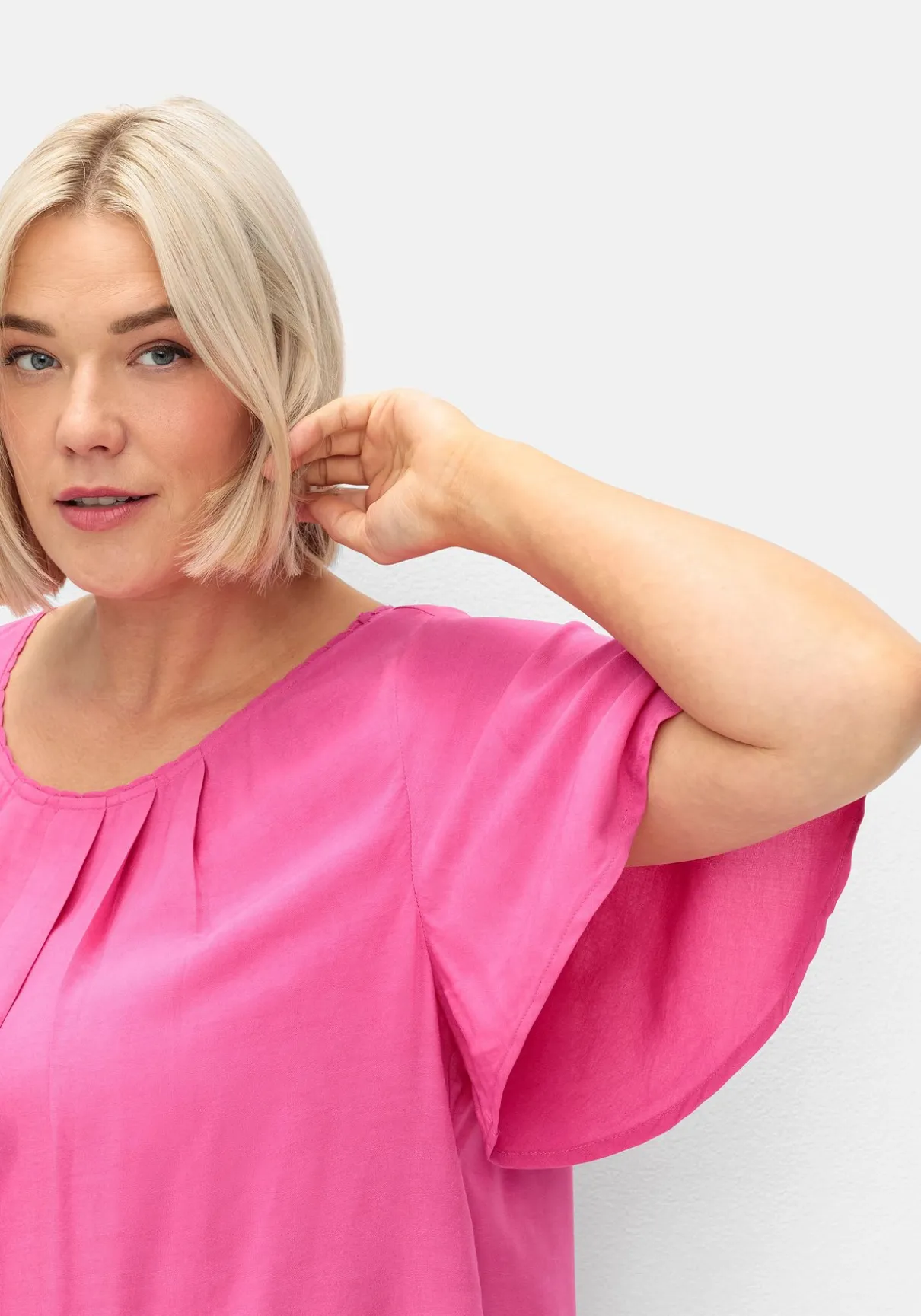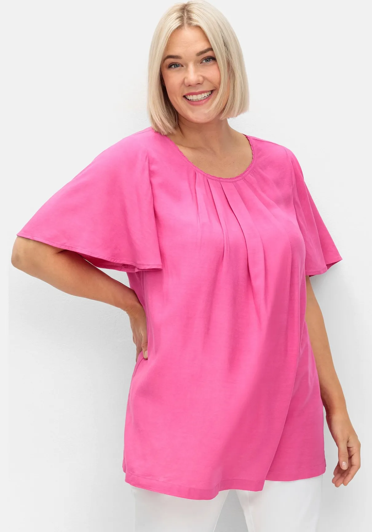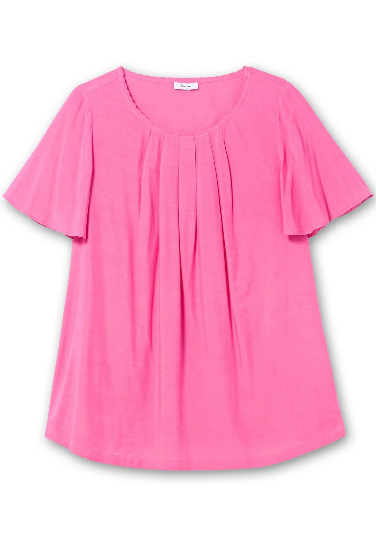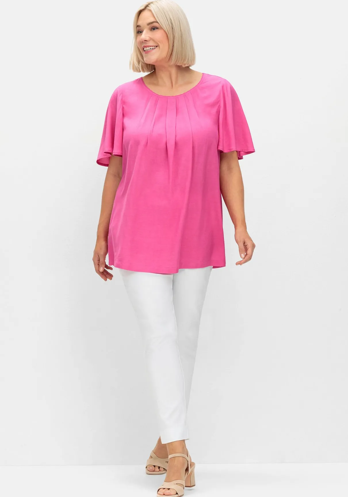 Tunika mit kurzen Flügelärmeln. Der Rundhalsausschnitt wird durch eine dekorative Kante verziert. Gelegte Falten verleihen dem Shirt luftige Weite und betonen geschickt die leichte A-Linie. Der gerundete Saum ergänzt den femininen, tragekomfortablen Look.