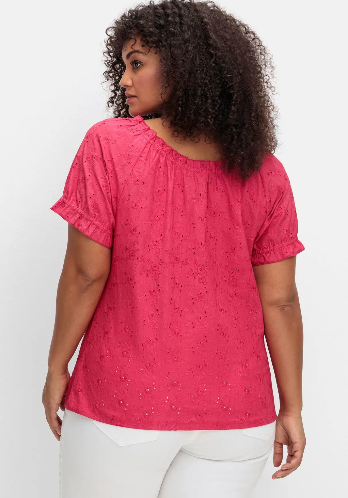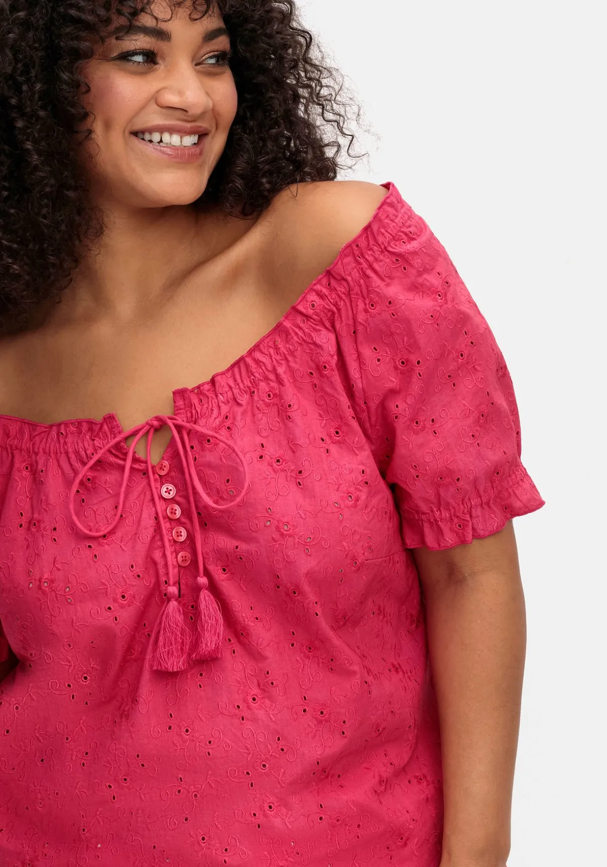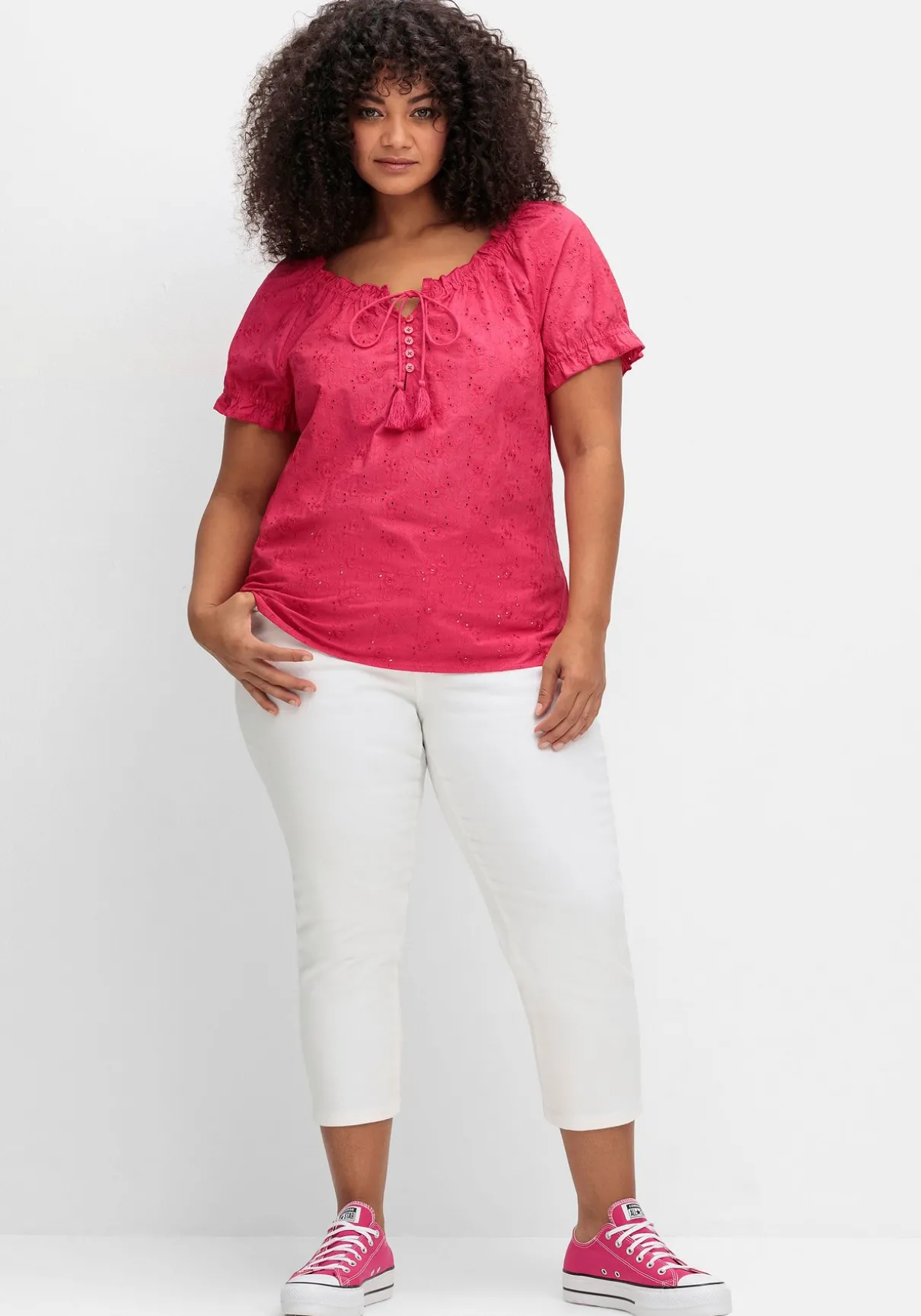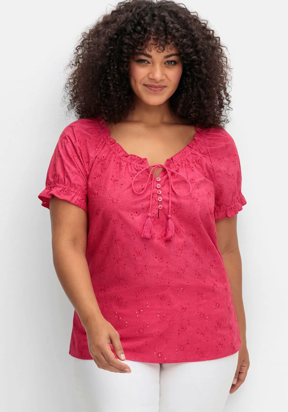 Tunika mit Lochstickerei von sheego by Joe Browns. Der gewebte Blusenstoff erhält durch die zarte Lochstickerei dezente Transparenz und gleichzeitig sommerliche Leichtigkeit. Der elastische Rundhalsausschnitt wird mit einer Rüsche feminin betont, die Bindebänder mit Quasten unterstreichen die verspielte Optik. Dazu ist der Ausschnitt mit einer kurzen Knopfleiste und Knöpfen in Perlmutt-Optik gestaltet, die kurzen Raglanärmel enden mit Gummizug und Rüsche. Für mehr Bequemlichkeit ist der Saum mit seitlichen Schlitzen gearbeitet.