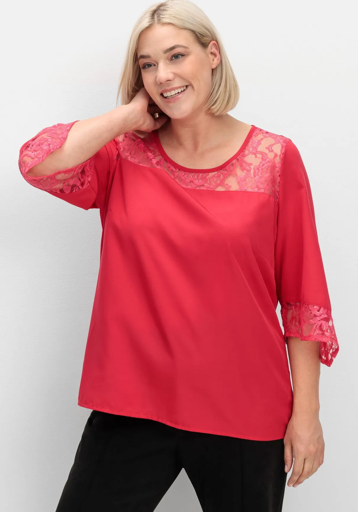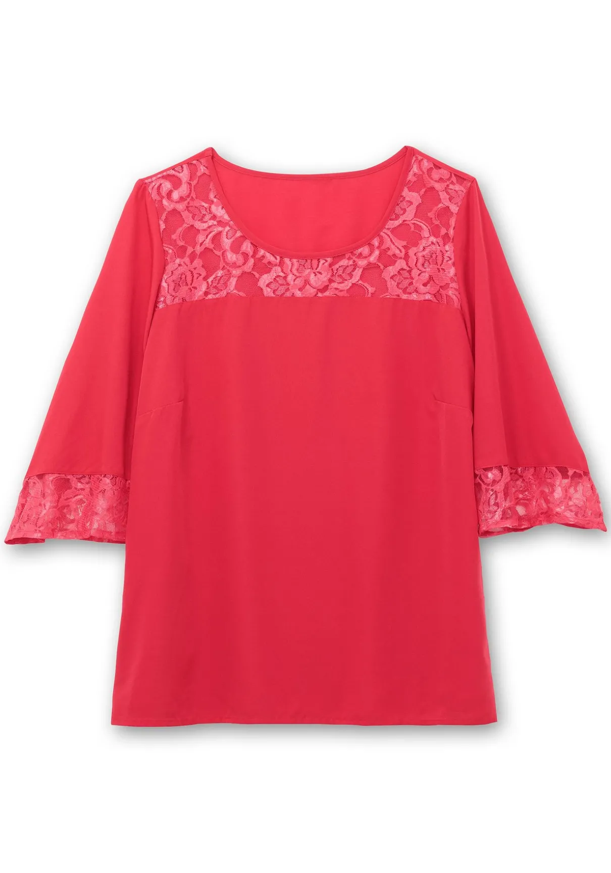 Tunika mit 3/4-langen Ärmeln. Der feminine Schnitt und die dekorativen Spitzendetails machen dieses Oberteil so besonders. Die Passe am Rundhalsausschnitt besteht aus leicht transparenter Spitze und sorgt so für einen eleganten Look. Die 3/4-Ärmel sind in ausgestellter Trompetenform geschnitten, auch hier findet sich die zarte Spitze am Ärmelabschluss wieder. Formgebende Brustabnäher betonen gekonnt die Figur.