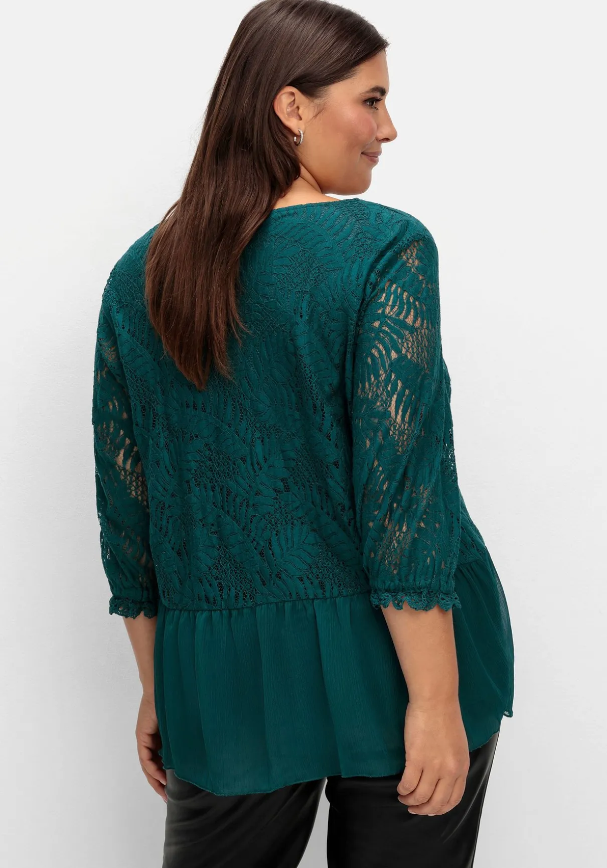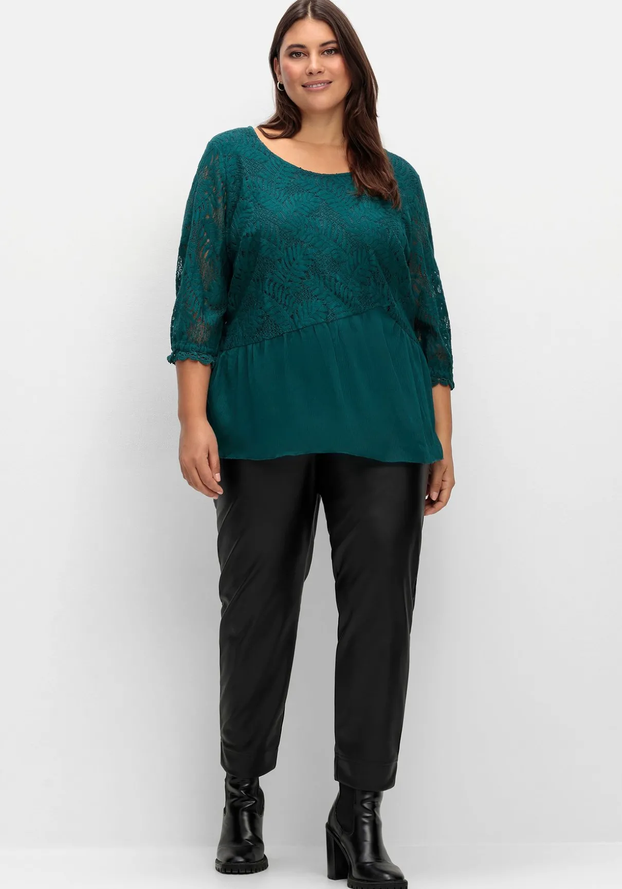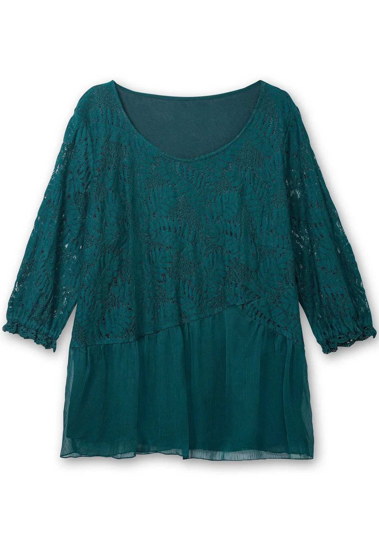 Tunika mit Chiffon und Spitze von sheego x Fair Lady. Highlight ist das aus floraler Spitze gefertigte Oberteil, ein Rundhalsausschnitt dient als feminine Ergänzung. Die 3/4-Ärmel bestehen ebenfalls aus Spitze, enden mit Gummizug und Bordüre und lassen zart die Haut durchschimmern. Durch das Jerseyfutter wird die Tunika am Body blickdicht. Das leicht geraffte Chiffonteil, das an den asymmetrisch geschnittenen Saum angesetzt ist, macht den romantischen Look perfekt.