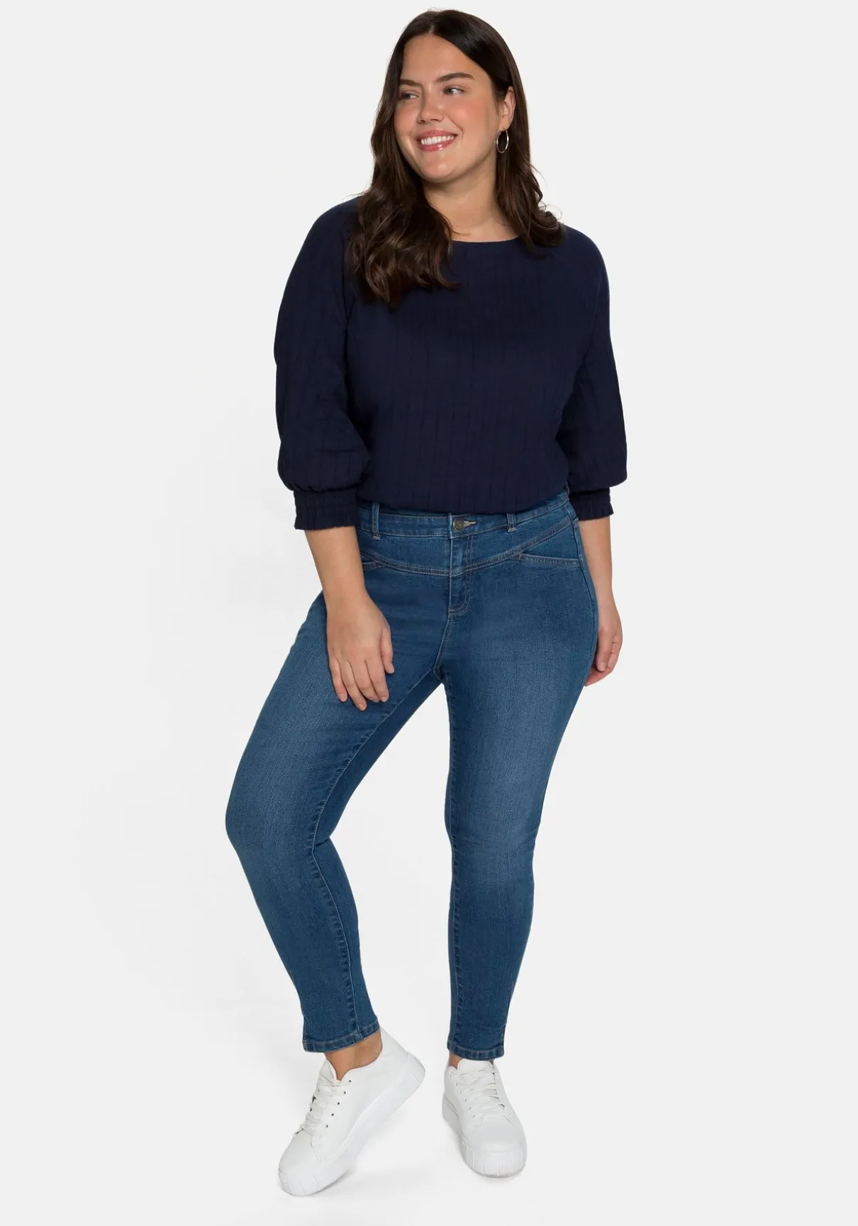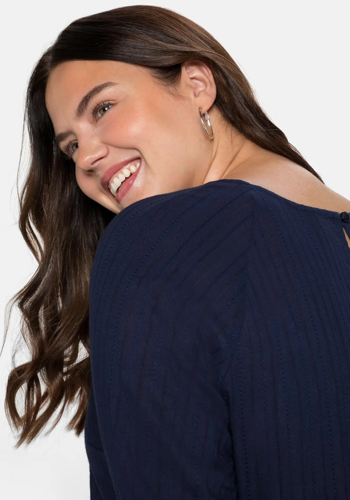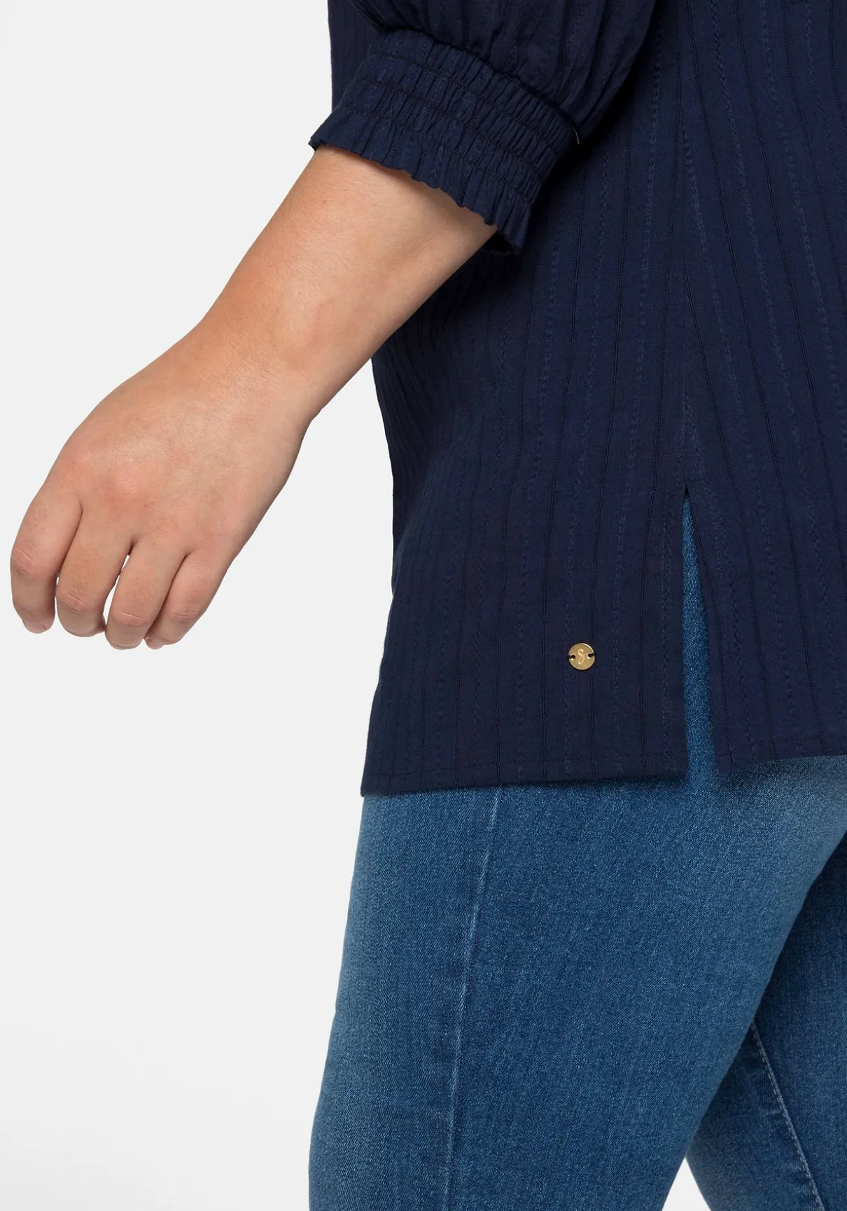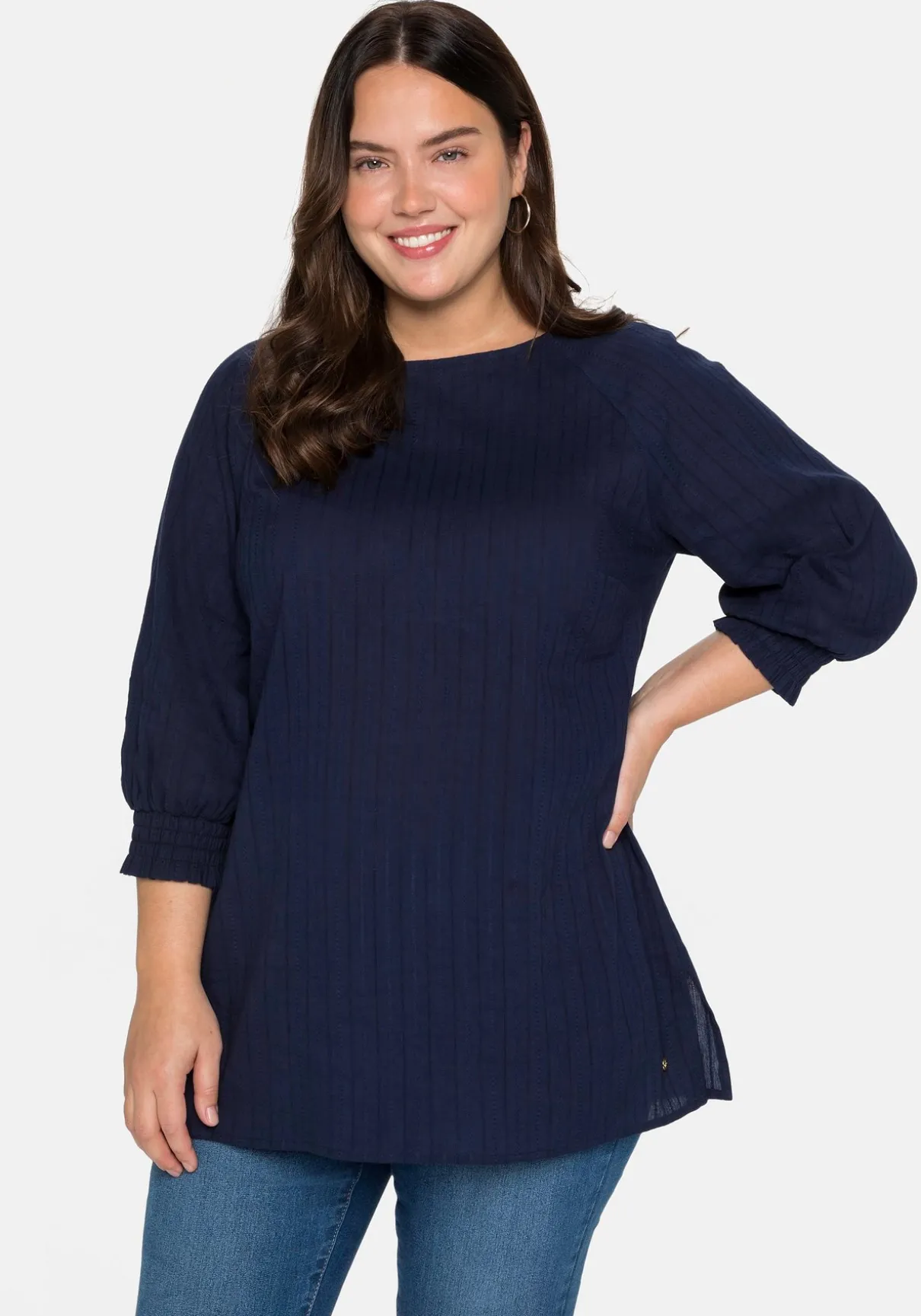 Tunika in A-Linie. Die feine Struktur in tonigen Längslinien lässt eine edle, leicht transparente Optik entstehen. Der feminine U-Boot-Ausschnitt geht hinten in einen Schlitz mit kleinem Knopfverschluss über. Gesmokte Ärmelbündchen am 3/4-langen Arm runden den Look stilvoll ab. Seitenschlitze am geraden Saumabschluss sorgen für den lockeren Sitz des Oberteils.