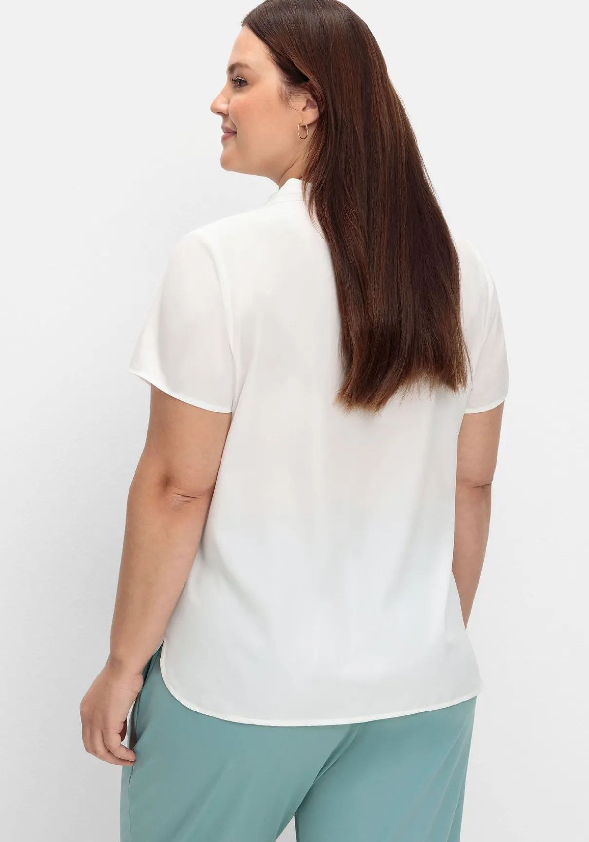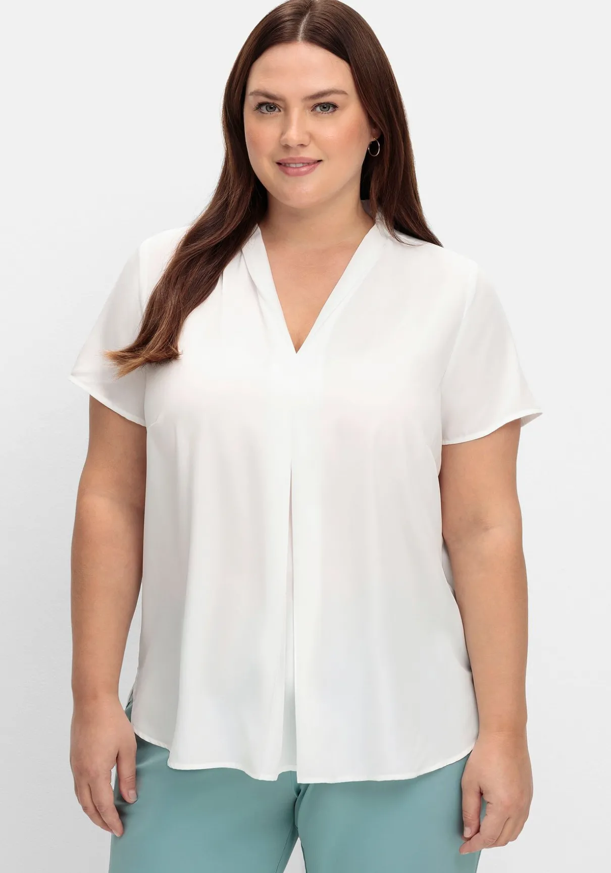 Tunika mit kurzen Ärmeln. Durch die Kellerfalte unterhalb des V-Ausschnitts erhält sie zusätzliche Weite. Auch die abgerundeten Seitenschlitze bieten optimale Bewegungsfreiheit.