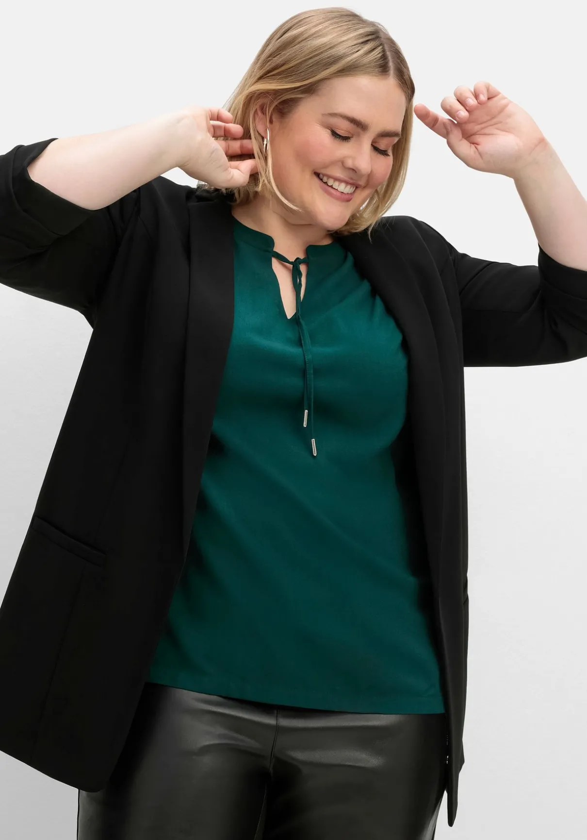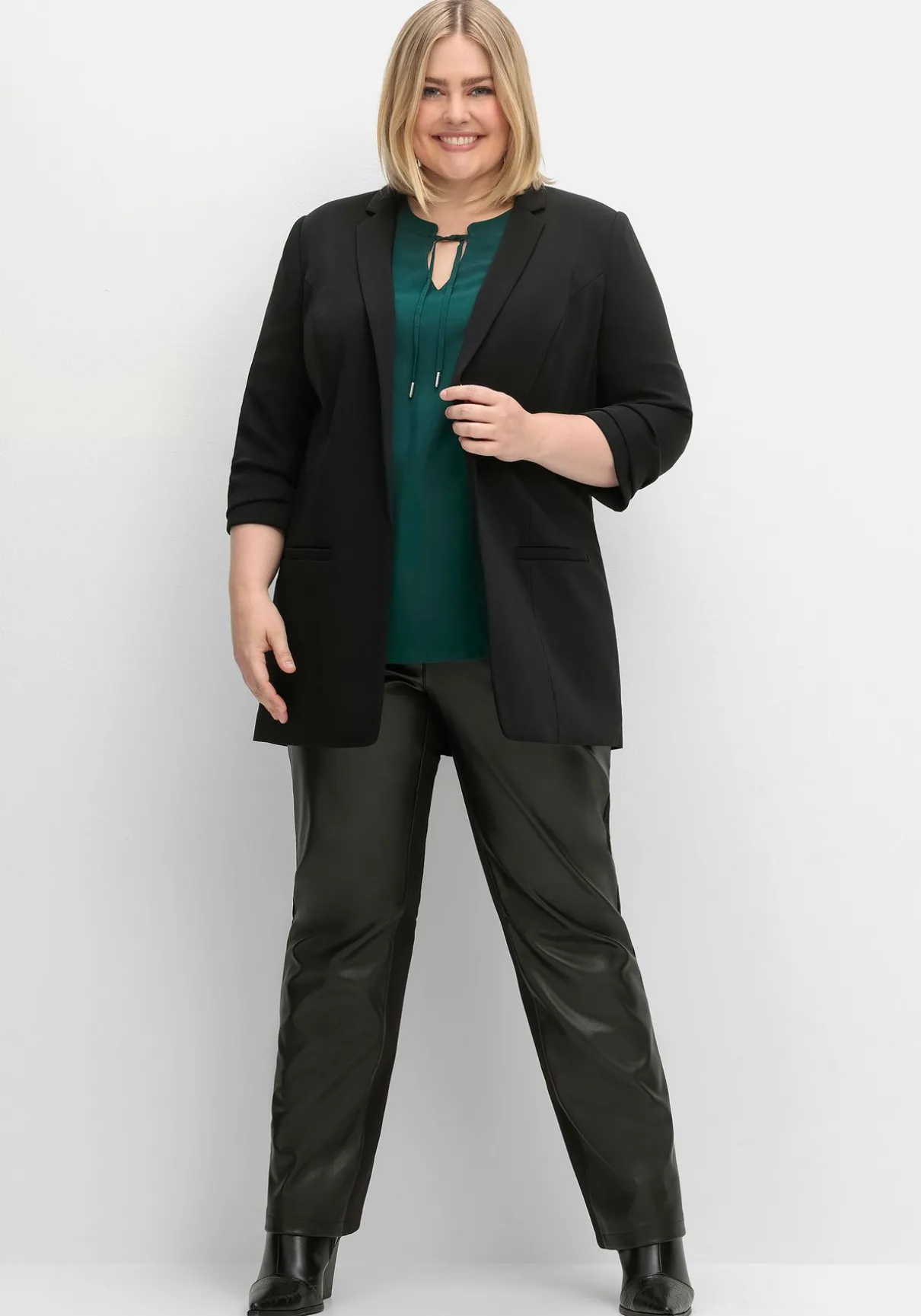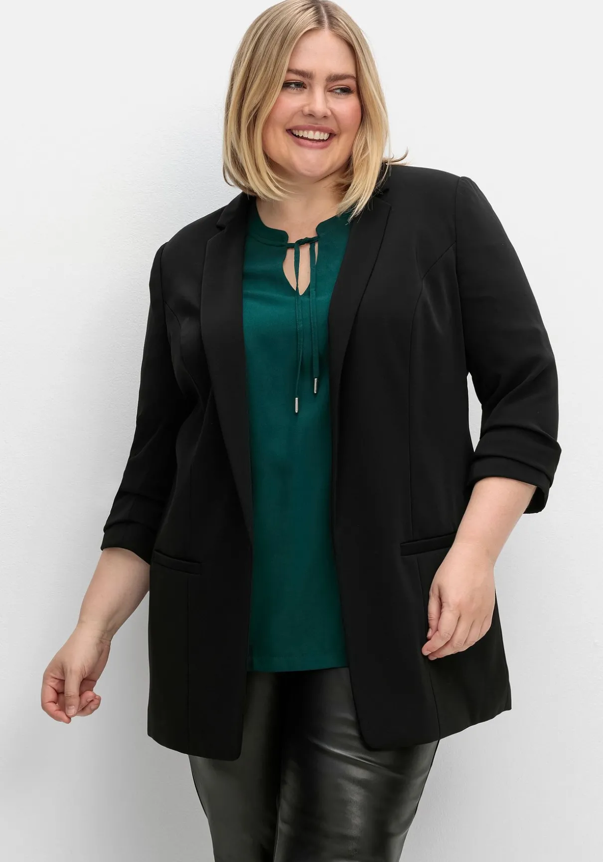 Blazer in Longform. Durch die verschlusslose Form fällt er besonders locker, die 3/4-Ärmel sind eine legere Ergänzung. Als raffiniertes Detail dienen die fixierten Falten am Ärmelsaum. Ansonsten zeigt sich der Blazer klassisch mit Reverskragen und Zierleisten auf Taschenhöhe. Geschickt gesetzte Teilungsnähte formen eine schöne Silhouette.
