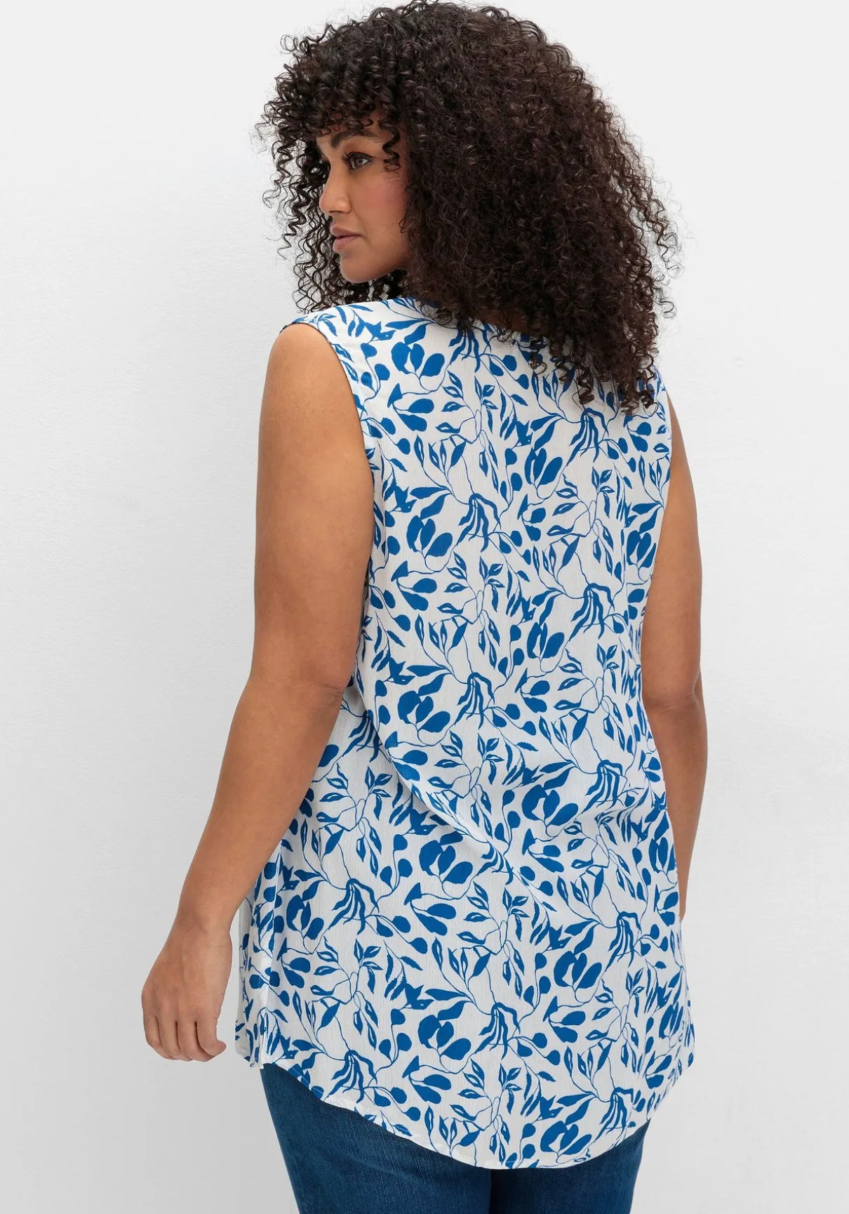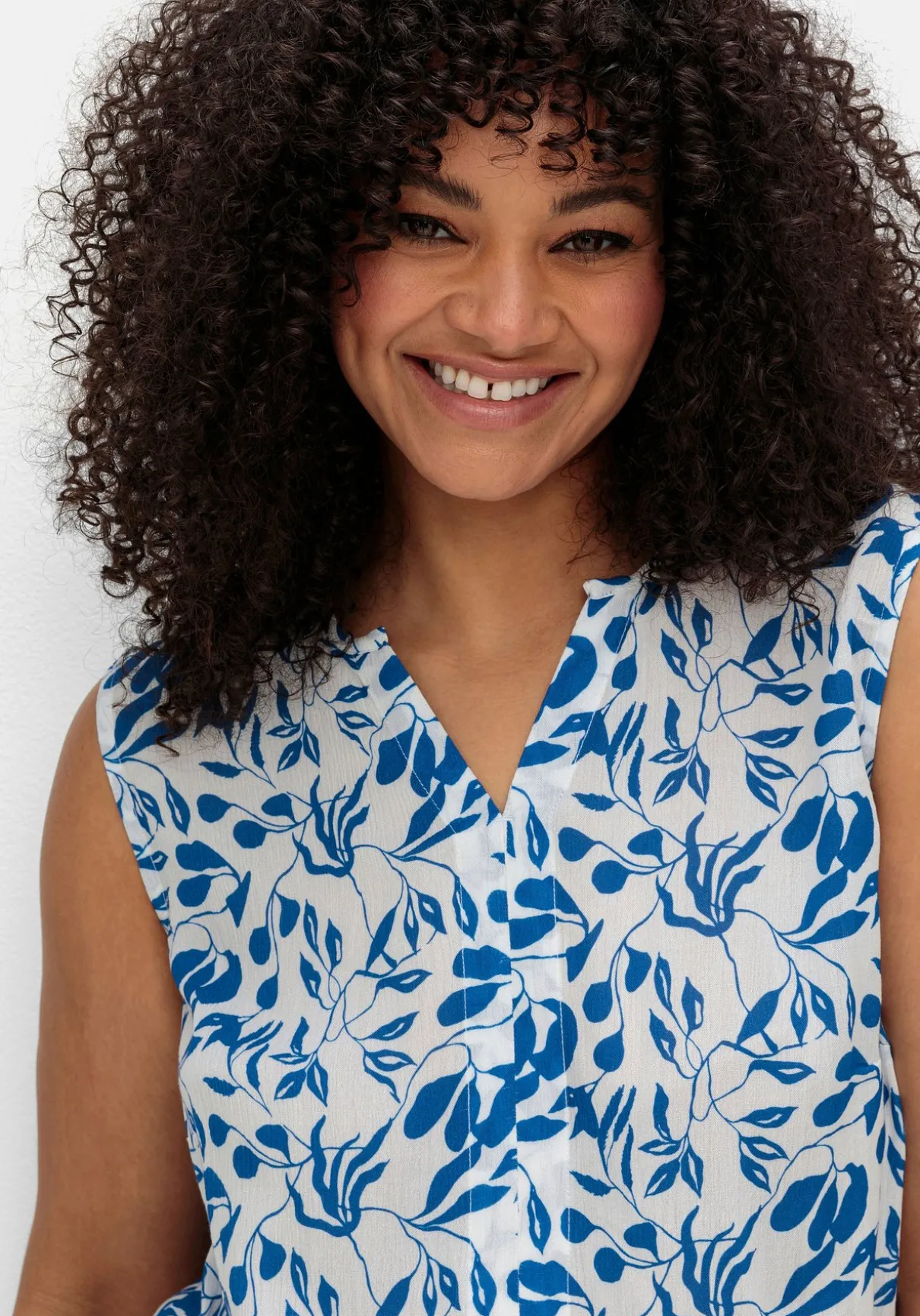 Webtop aus leichtem Crêpe. Mit Allover-Blättermuster und in ärmelloser Form wirkt das Top luftig und sommerlich. Der Rundhalsausschnitt ist mit einem Schlitz gearbeitet, die Teilungsnaht vorn streckt die Silhouette optisch. Durch den hinten leicht gerundeten Saum fällt das Oberteil locker über den Po.