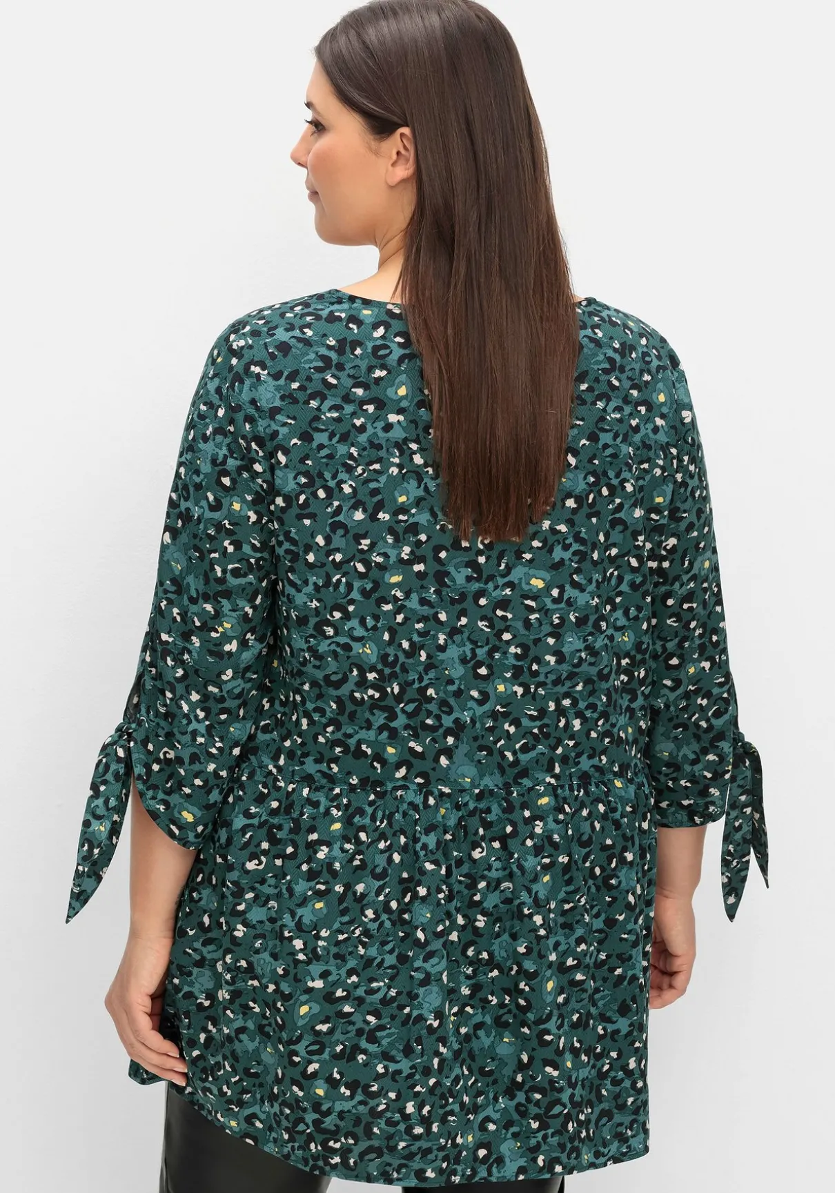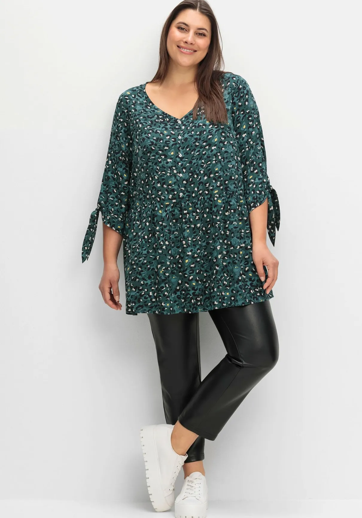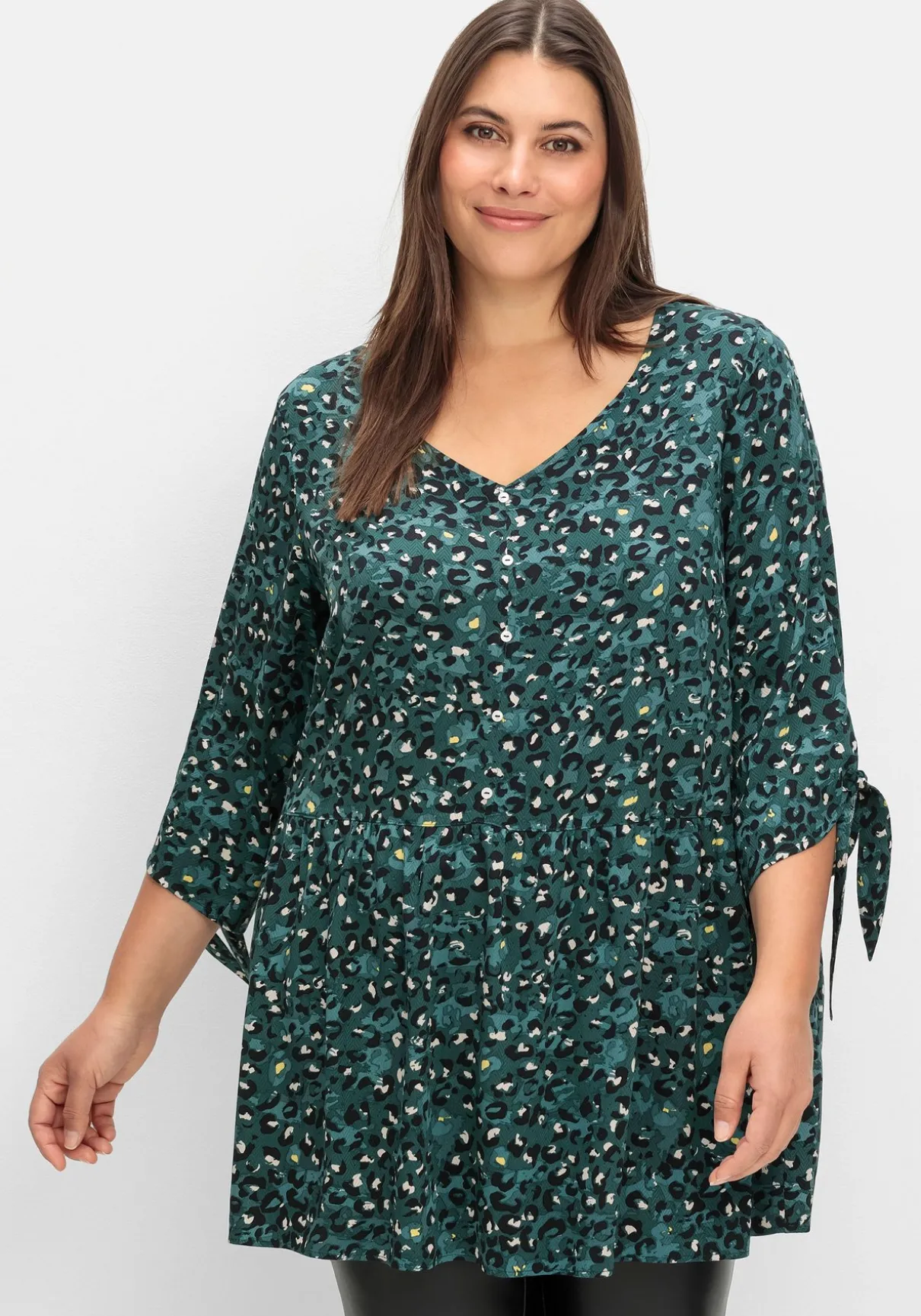 Longtunika mit Alloverprint. Mit weit schwingendem Saum trägt sich die Tunika locker und bequem, eine gekräuselte Taillennaht gibt der Silhouette Form. Besonders hübsch präsentieren sich außerdem die 3/4-Ärmel mit Knotendetails und die Zierknopfleiste am V-Ausschnitt.