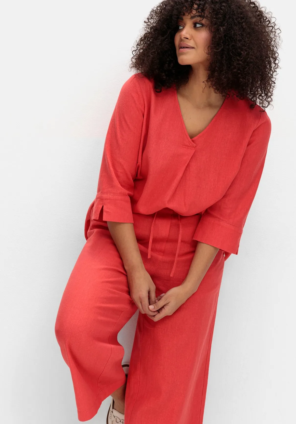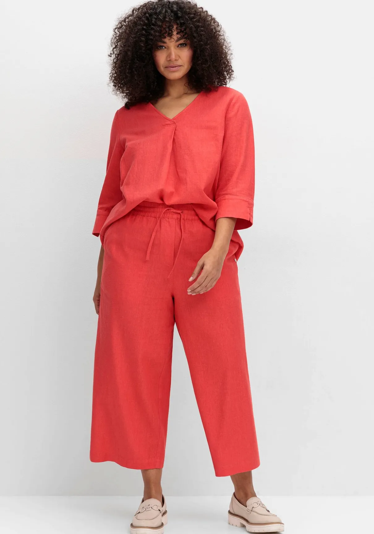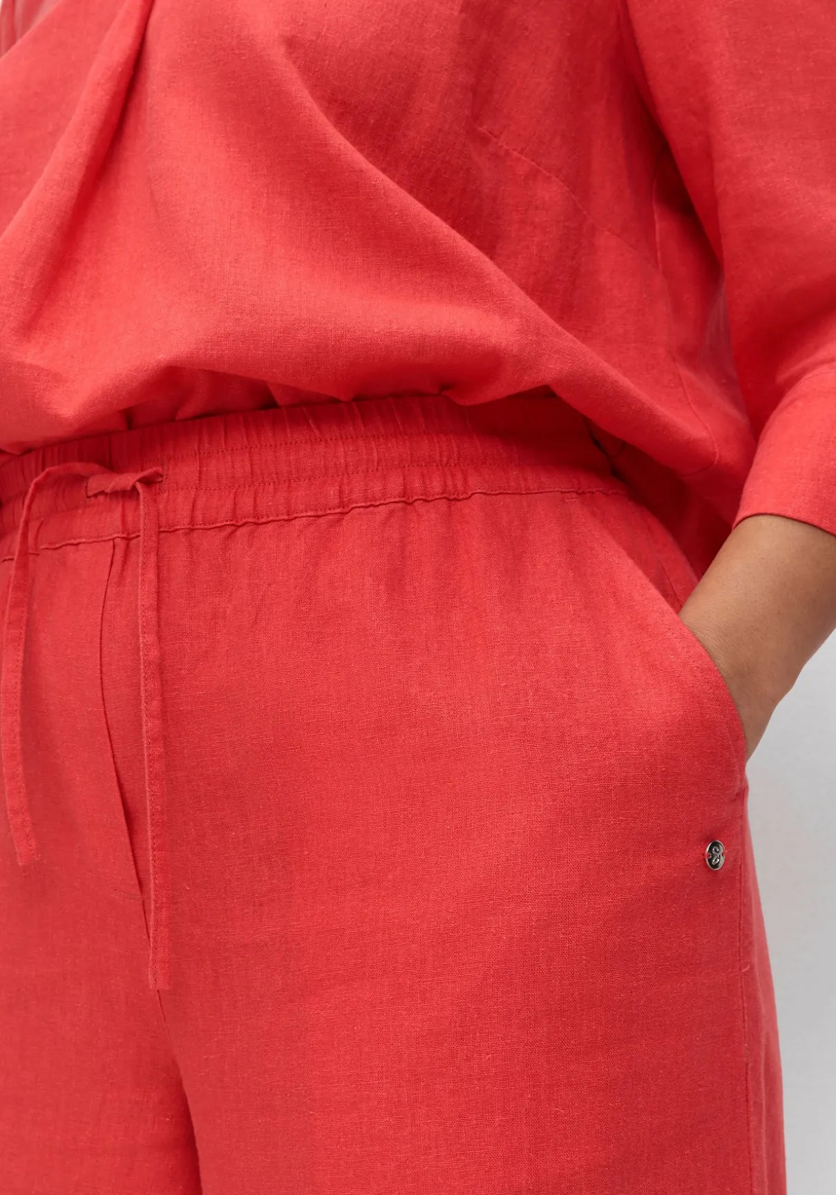 Weite 7/8-Hose aus Leinen-Mix. Mit weitem verkürzten Bein und Gummibund sitzt die Hose sehr bequem, auch das Bindeband wirkt entspannt. Das Material liegt herrlich luftig auf der Haut, seitliche Eingrifftaschen ergänzen den Style.