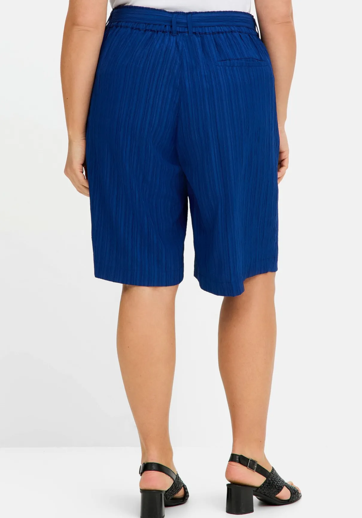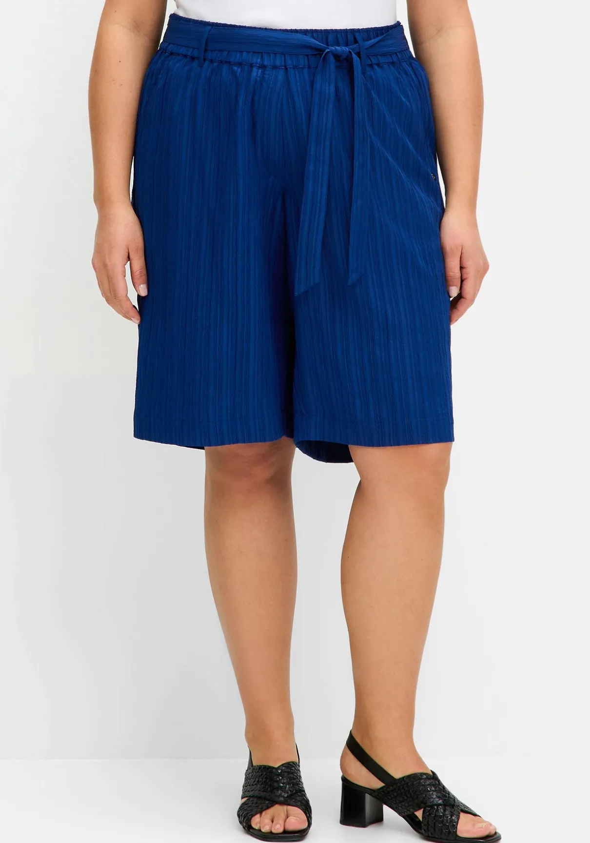 Weite Bermudas mit Schlupfbund. Die in Längsstreifen verlaufende Struktur sorgt für modische Spannung und einen streckenden Effekt. Ein Stoffgürtel betont die Taille – perfekt, um die Bermudas mit dem passenden Oberteil zum Set zu kombinieren. Zwei seitliche Eingrifftaschen sowie eine Leistentasche hinten ergänzen den Look.