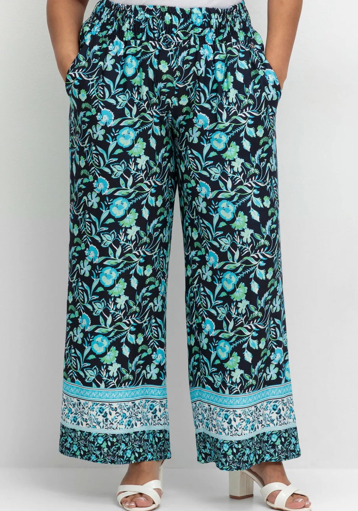 Weite Sommerhose in komfortabler Schlupfform. Der florale Druck wird mit einem stilvollen Bordürenprint am Hosensaum kombiniert und verleiht der Hose so einen charmanten Look. Dazu sorgt der breite Smokbund für Bequemlichkeit, seitliche Taschen sind dabei ein praktisches Detail. Die weite, locker fallende Form ergänzt den luftig-leichten Stil – ideal für die Freizeit oder den Strand.