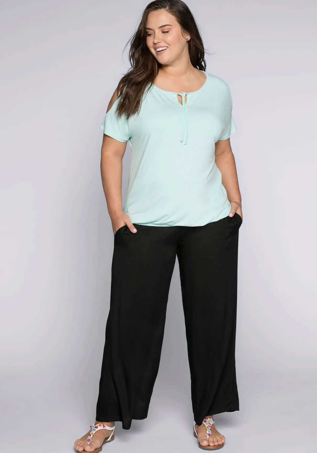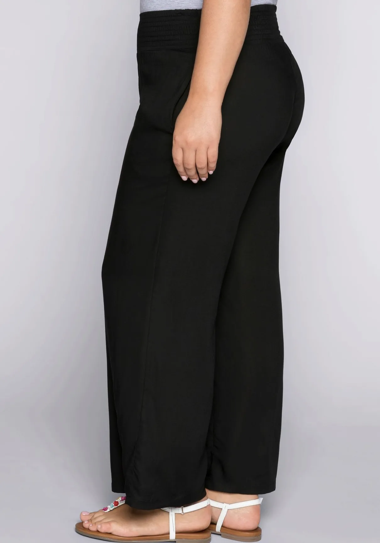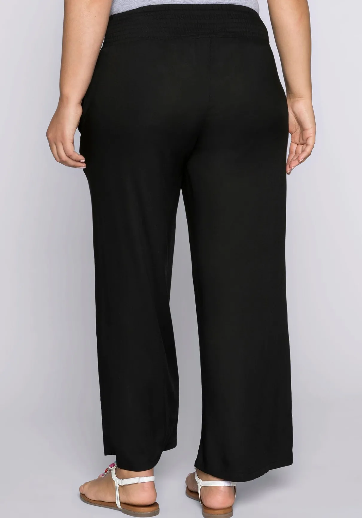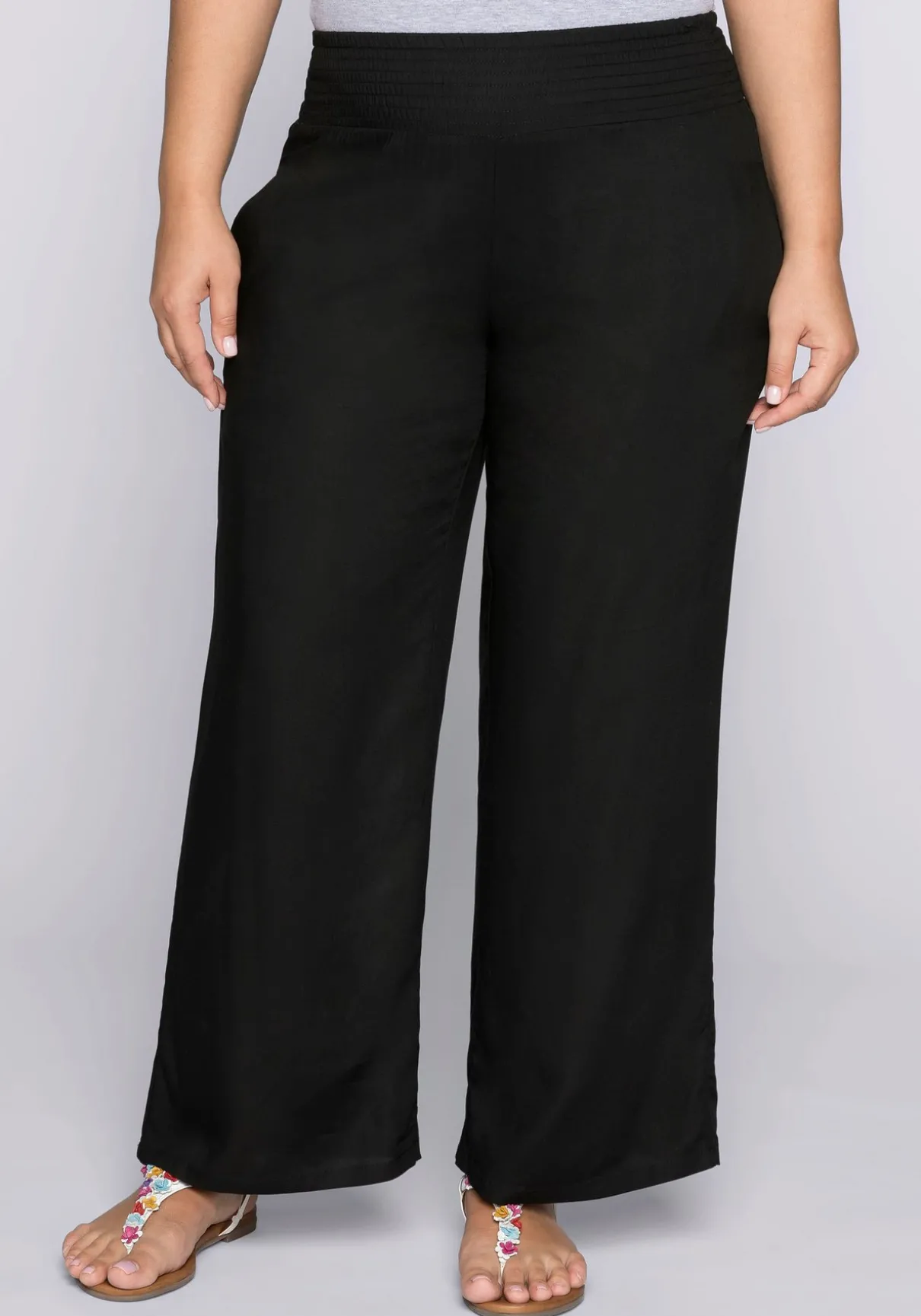 Für einen entspannten Sommerlook sorgt diese luftige, weite Strandhose. Sie überzeugt durch zwei Eingrifftaschen in der Seitennaht und einen breiten Smokbund, der maximale Bequemlichkeit garantiert.