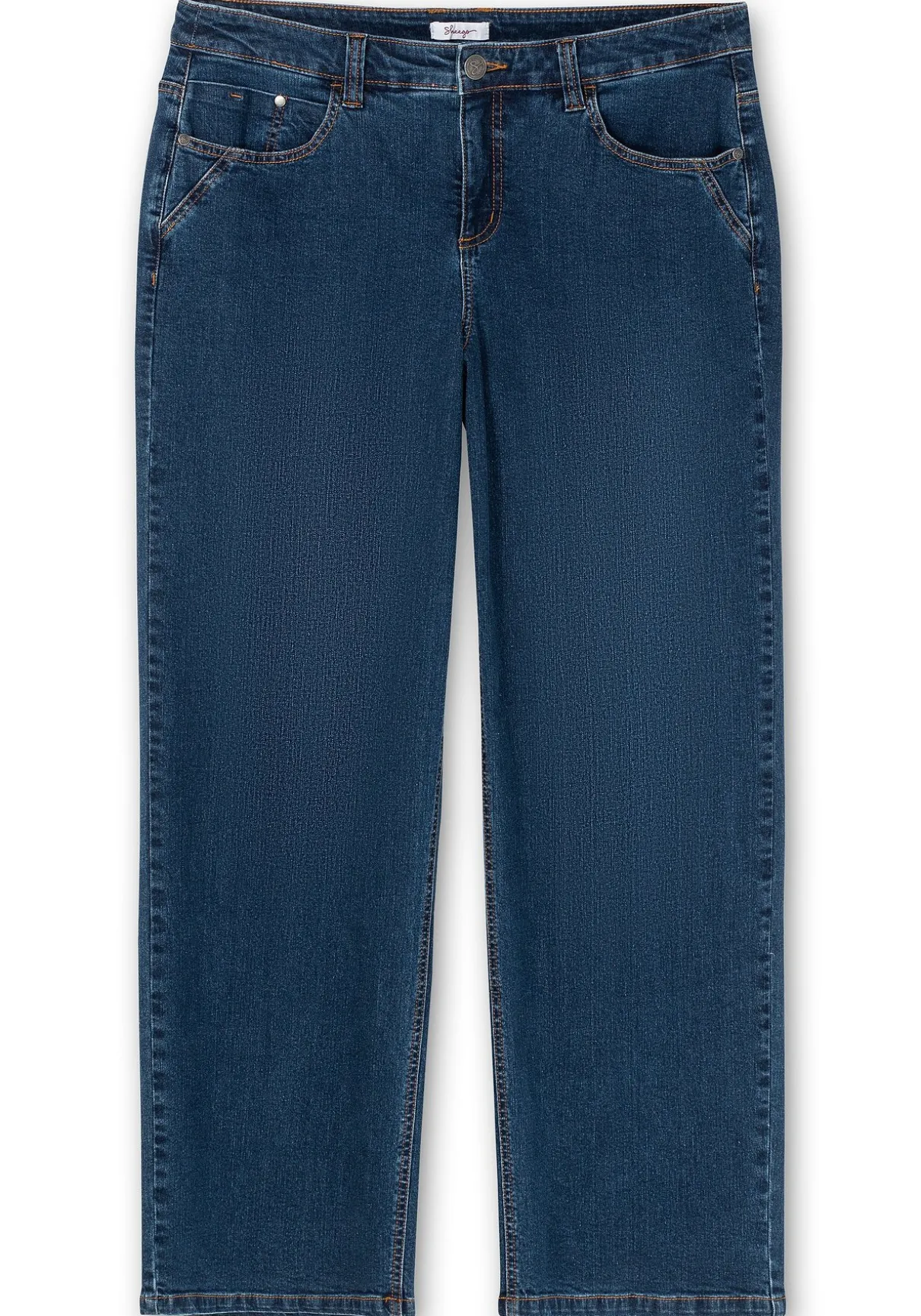 Jeans im Curvy-Schnitt ELLA mit extraweitem Beinverlauf, für Frauen mit sehr kräftigen Oberschenkeln und Waden. Die bequeme Jeans ist mit einem Formbund und Gürtelschlaufen gearbeitet und besitzt die klassischen fünf Taschen. Die Passe hinten sorgt für einen guten Sitz, Kontrastnähte runden den Look modisch ab.