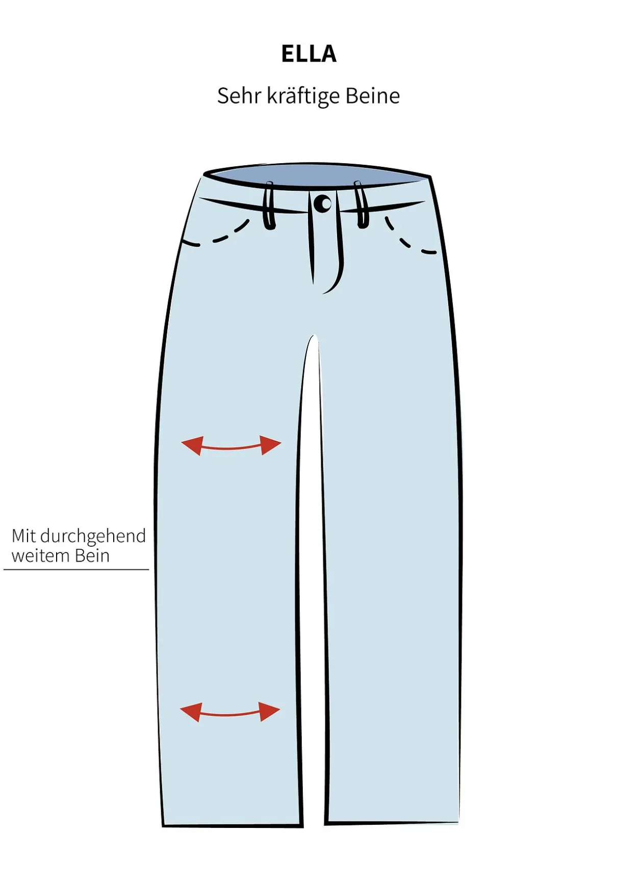 Diese komfortable Jeans zeigt sich in der Passform ELLA. Das Bein ist besonders weit geschnitten und sitzt auch an sehr kräftigen Oberschenkeln und Waden bequem.