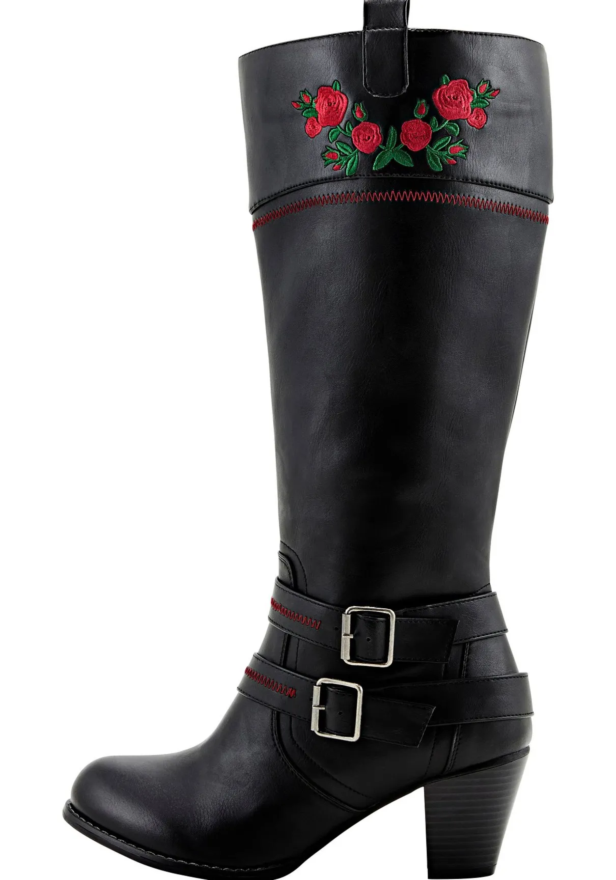 Weitschaftstiefel aus Lederimitat von sheego by Joe Browns mit leichter Profilsohle. Mit abgerundeter Spitze und markantem Absatz zeigen sie sich im femininen Cowboy-Style. Einen dekorativen Akzent setzt die Blumenstickerei an der Schaftaußenseite, die durch Kontrastnähte ergänzt wird. Die Schnallen sind nicht nur ein modisches Stilelement, sondern lassen sich in der Weite verstellen und sorgen zusammen mit dem breiten Stretcheinsatz hinten für Bequemlichkeit. Ein Reißverschluss an der Schaftinnenseite sowie eine kleine seitliche Zugschlaufe erleichtern das Anziehen.