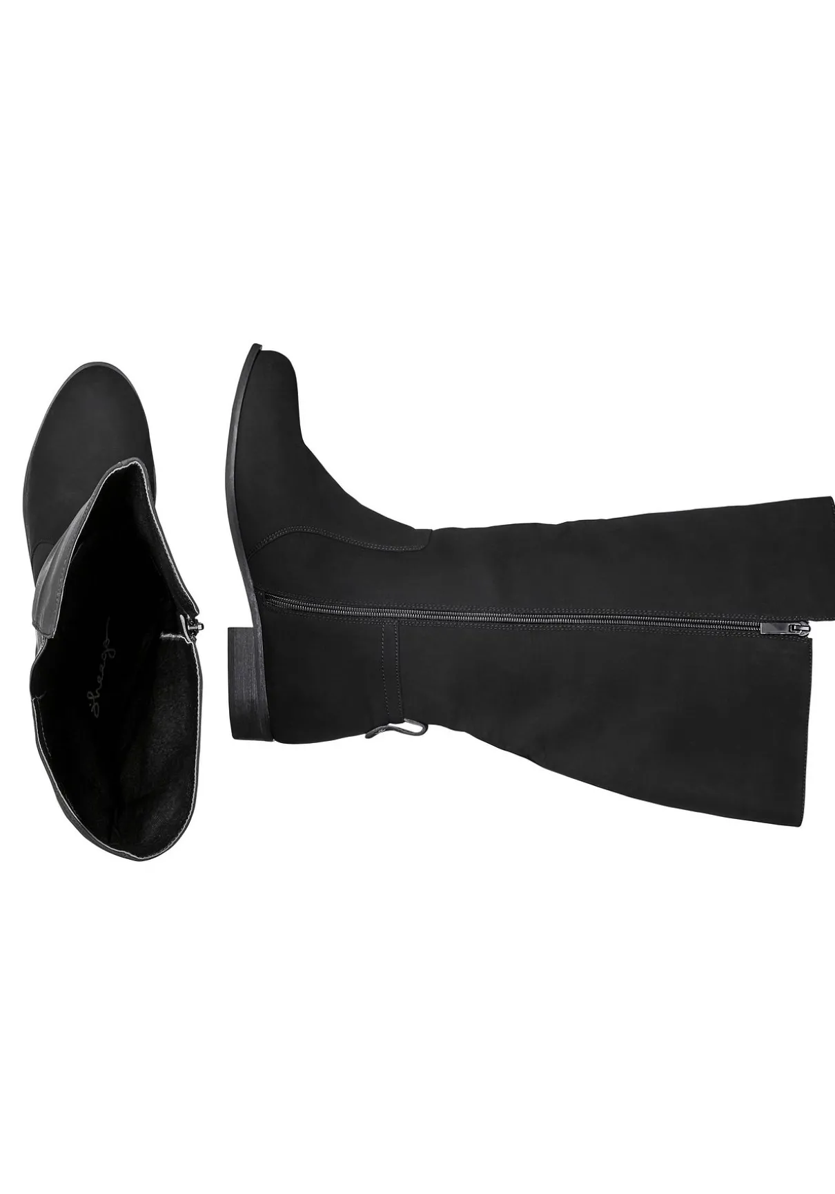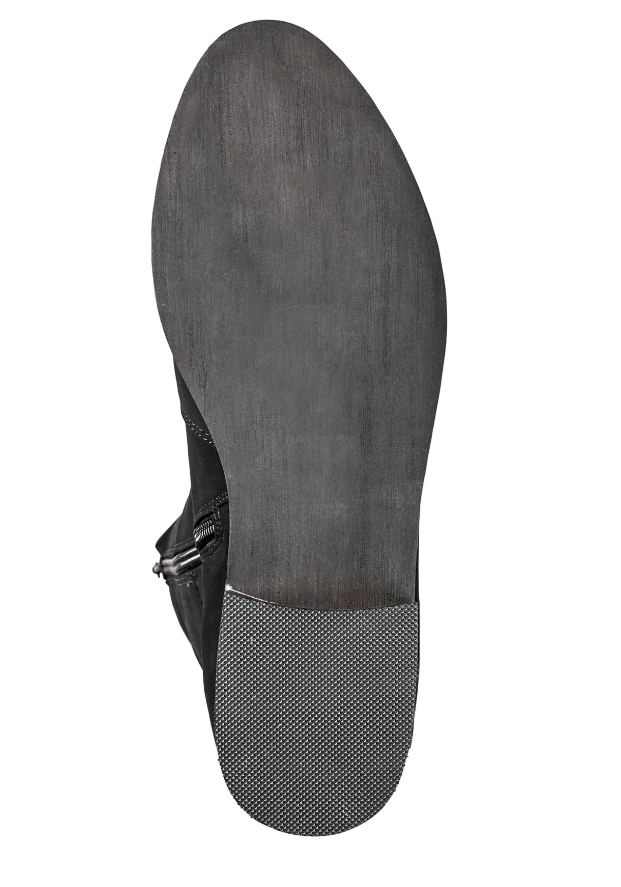 Weitschaftstiefel mit leicht profilierter Laufsohle. Schlicht und zeitlos zeigt sich der Stiefel, der mit abgerundeter Spitze und einem ca. 3 cm hohen Blockabsatz gearbeitet ist. Für einen bequemen Sitz an der Wade sorgt der Stretch-Einsatz seitlich am Schaft. Vorn ist der Schaft etwas höher geschnitten als hinten, der Riegel mit Druckknopf hinten über der Ferse ist ein modisches Detail. Einen leichteren Einstieg ermöglicht der Reißverschluss in der Innenseite, praktisch ist die herausnehmbare Innensohle.