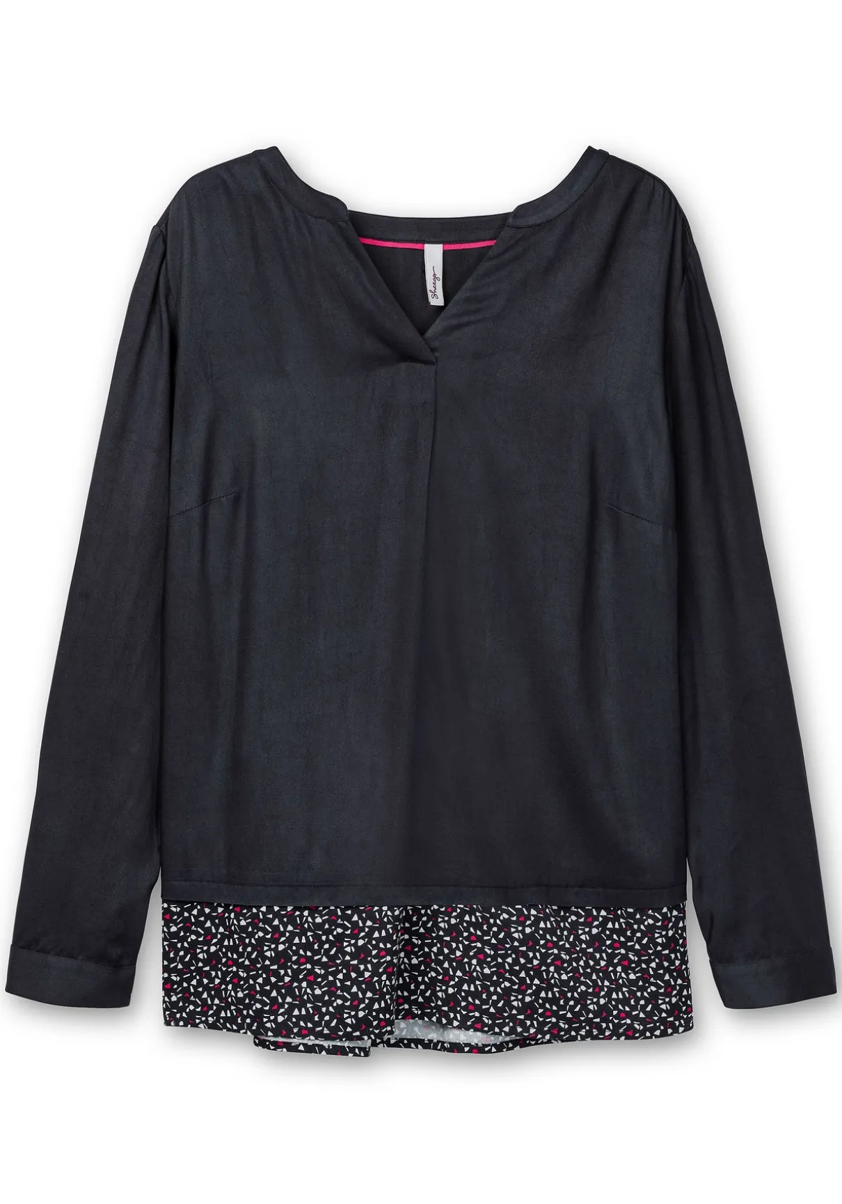 Tunika in 2-in-Optik. Der Layering-Effekt entsteht durch den allover bedruckten Saum, der sich raffiniert vom ansonsten unifarbenen Oberteil abhebt. Am geschlitzten Rundhalsausschnitt befindet sich eine gelegte Falte. Die langen Ärmel enden mit Manschetten und Knöpfen. Seitliche Schlitze und eine Passe mit Fältchen hinten sorgen für den bequemen Sitz.