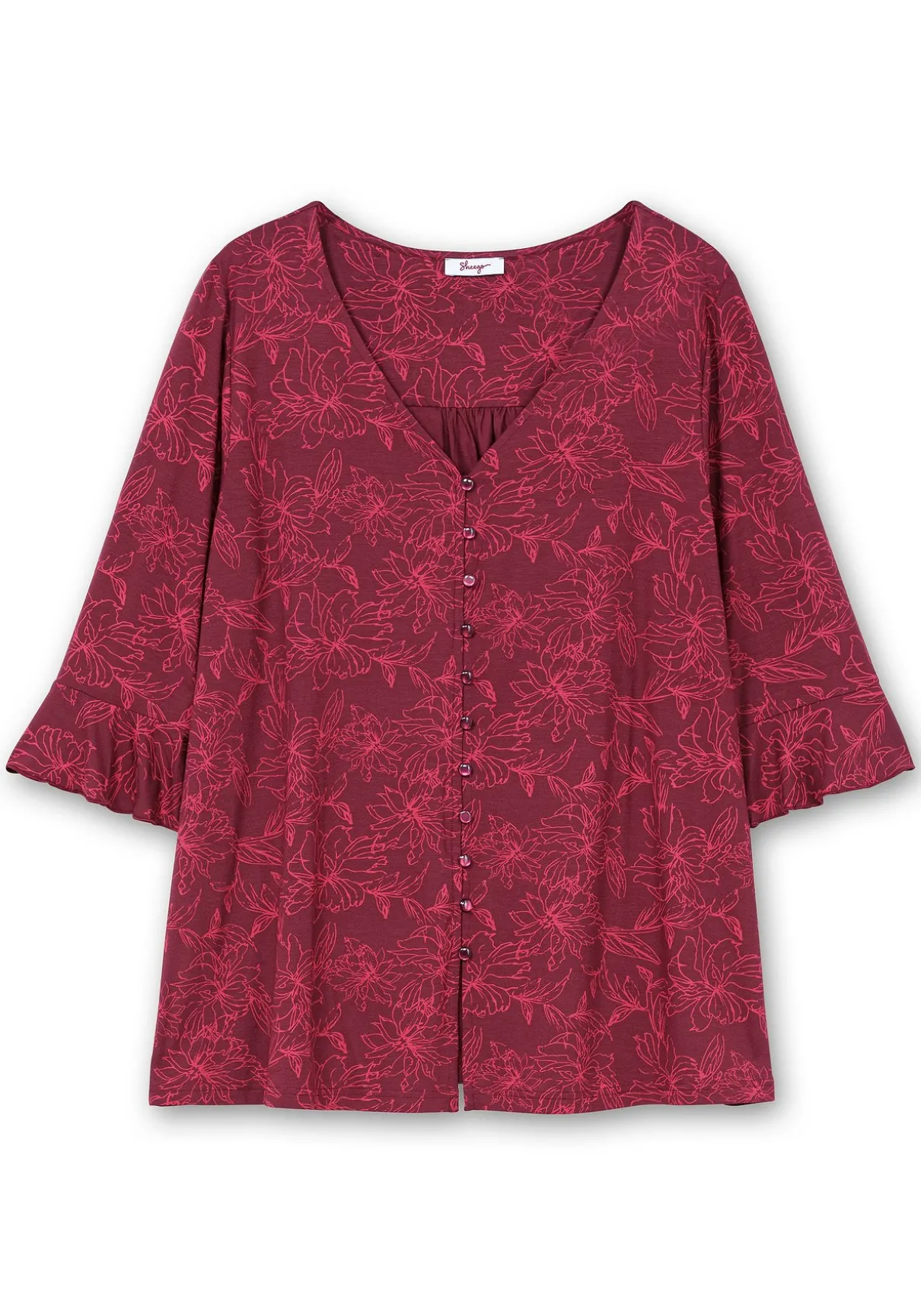 Shirt mit Knopfleiste. Der filigrane Blumendruck, der verspielte Volant am 3/4-Arm und die kleinen, schimmernden Knöpfe verleihen dem Shirt einen femininen Look. Durch die leichte A-Linie umspielt es schmeichelnd die Figur, der etwas tiefer gefasste V-Ausschnitt wirkt optisch streckend.